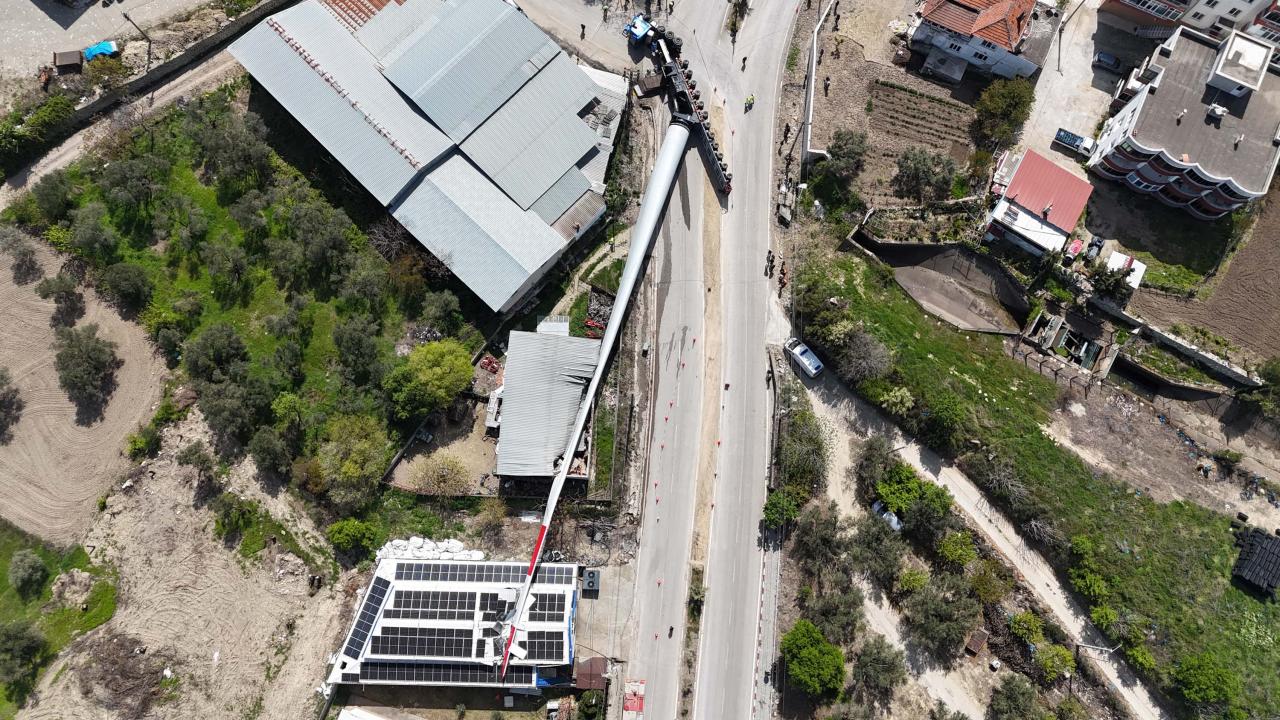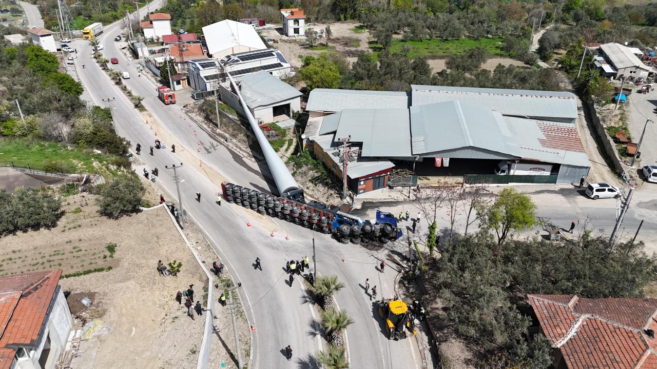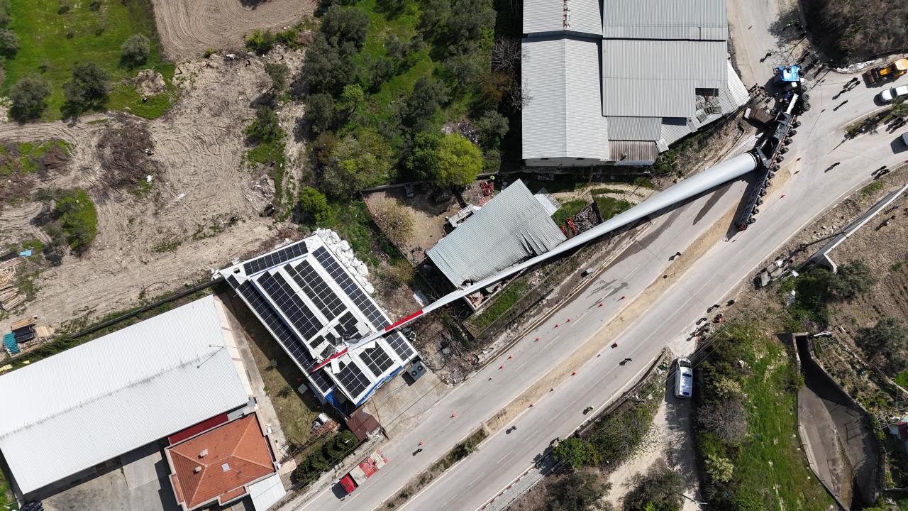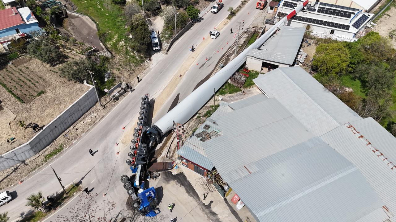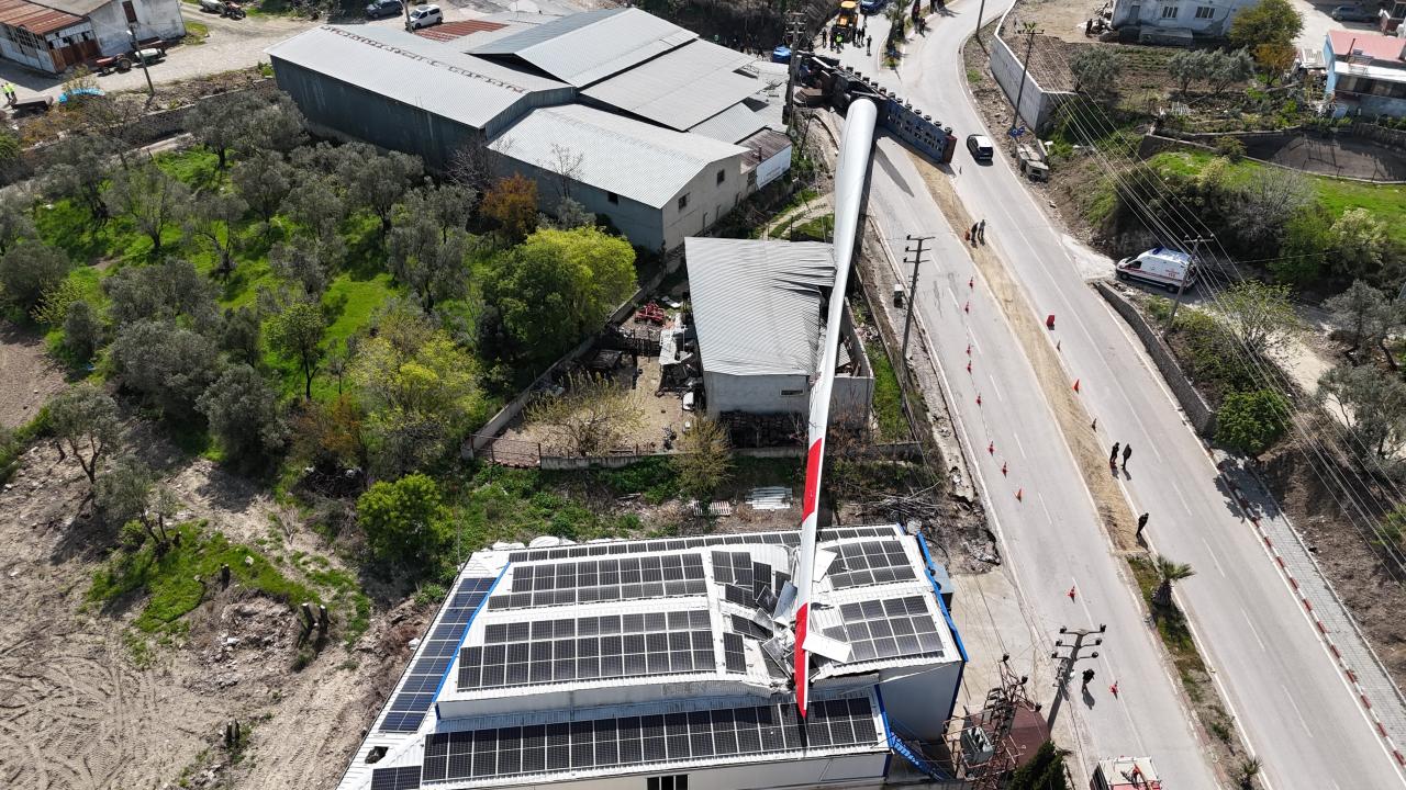 Bölgedeki sandık fabrikası ile bir damın üzerine devrilen tırda yüklü dev pervane kanadının kaldırılması için çalışmalar sürüyor.