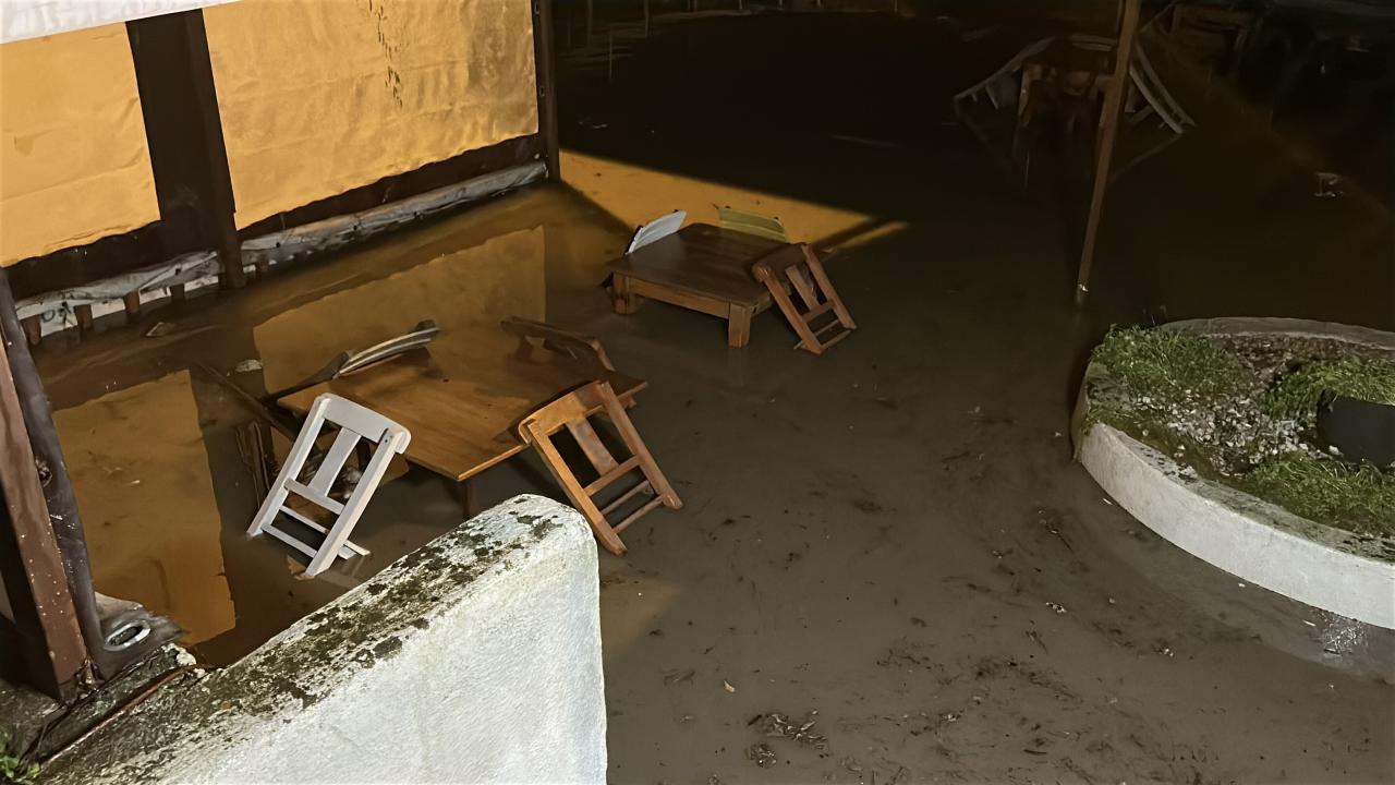 Su akışıyla taşan çay, balıkçı barınağına ulaşıp bazı teknelere zarar verdi.