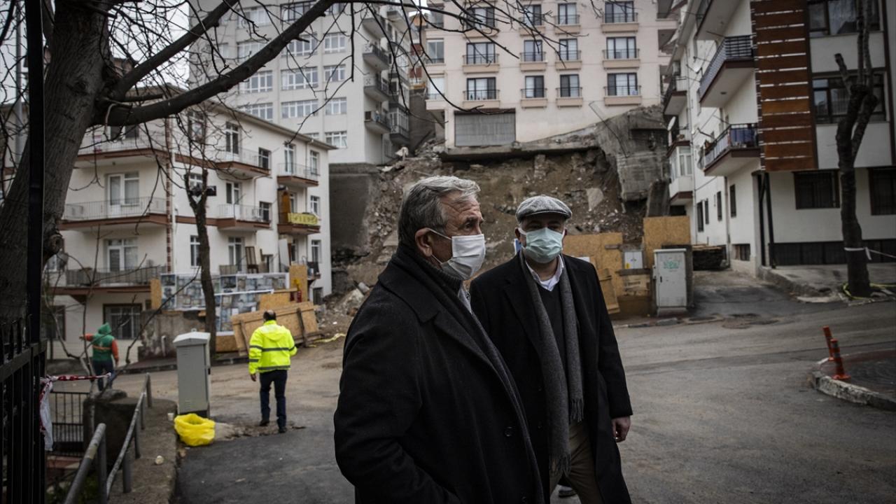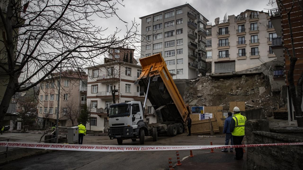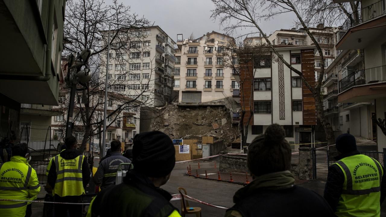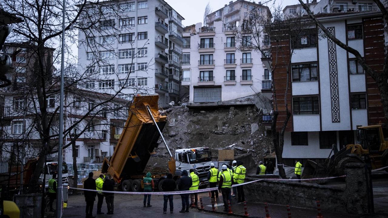 Ankara'nın Çankaya ilçesine bağlı İleri Mahallesi Mektep Sokak'ta bulunan ve önündeki inşaat çalışmaları nedeniyle temelinde oluşan boşluktan kaynaklı çökme riski olan binanın "makaslama" yöntemiyle yıkım işlemi gün boyu devam etti.