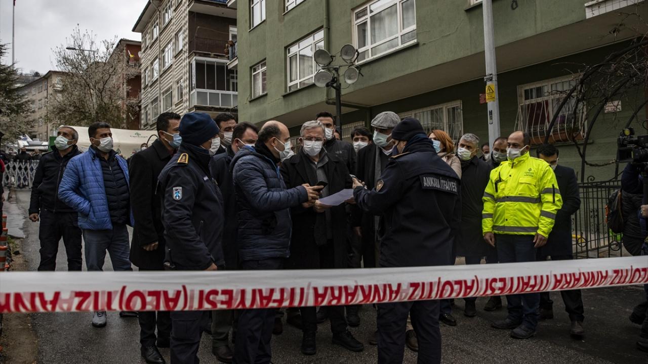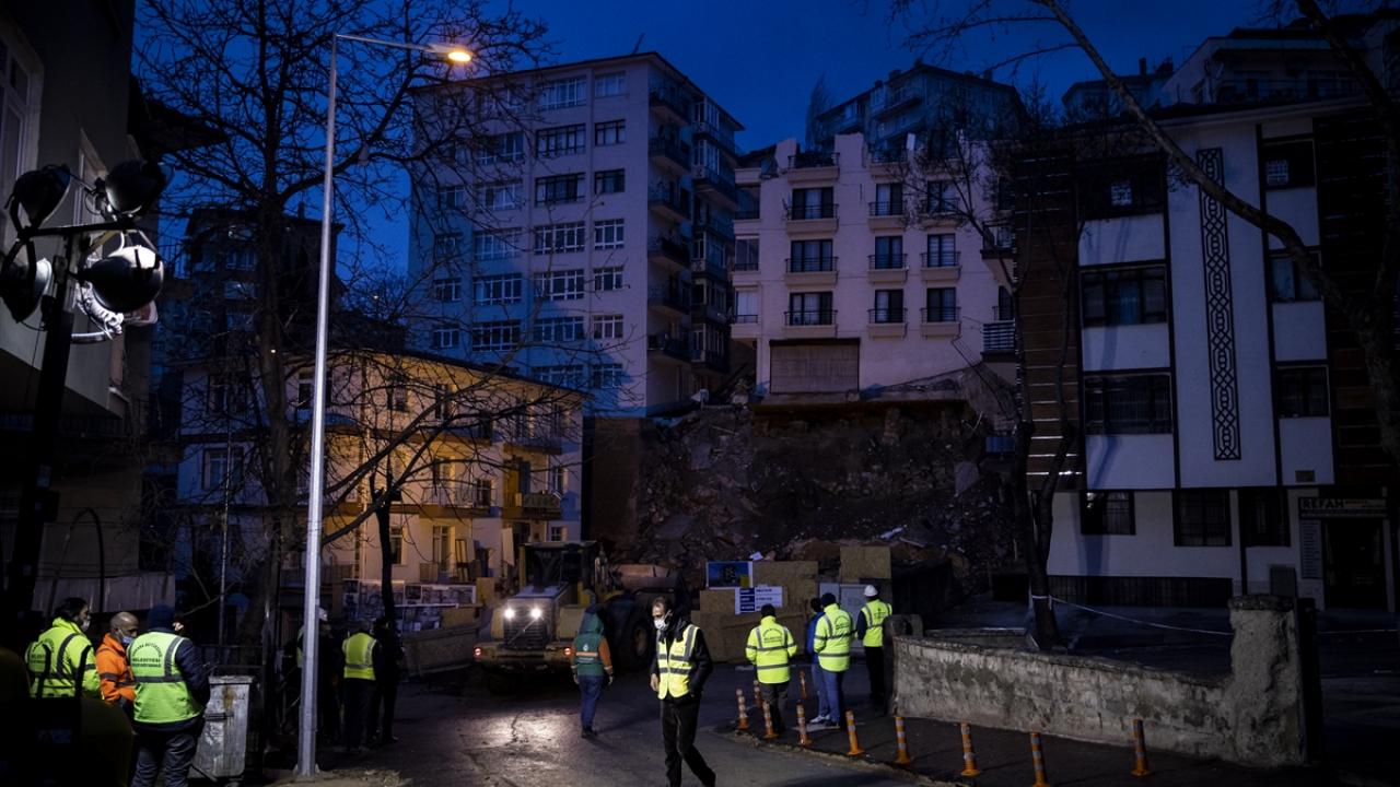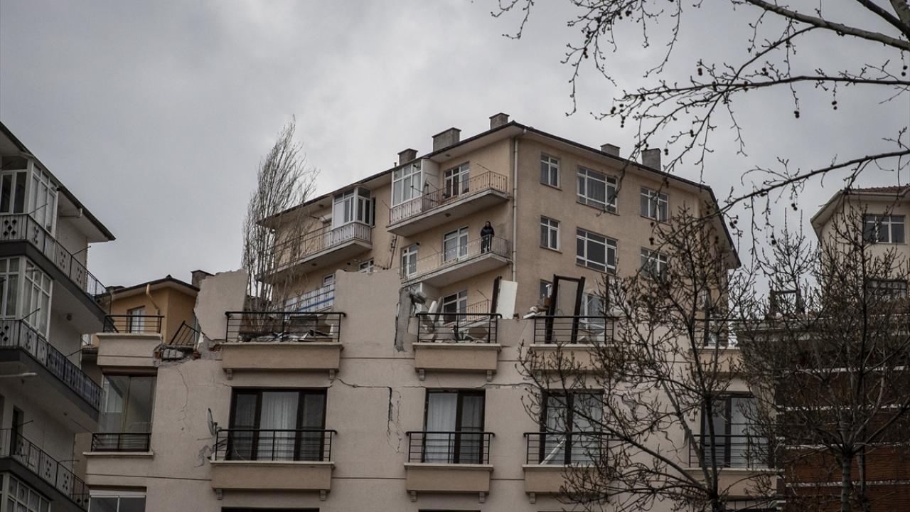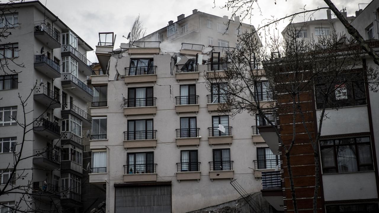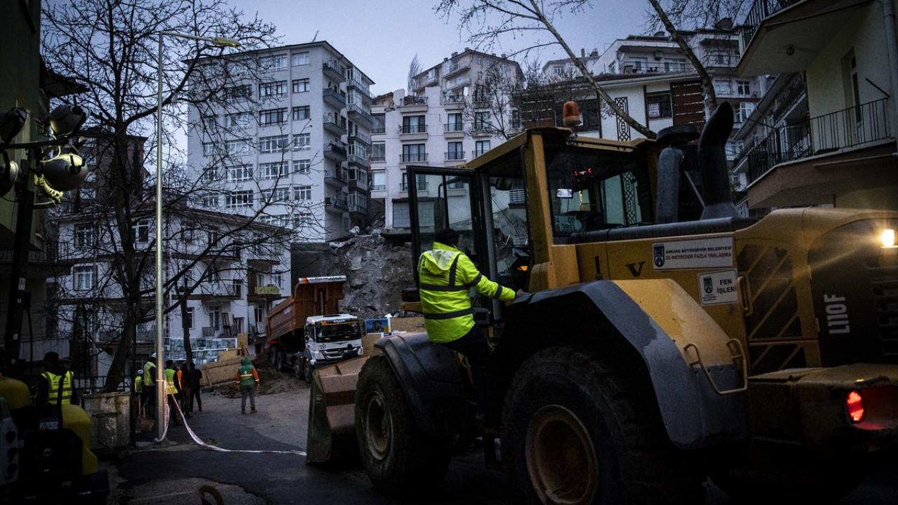 Ankara'nın Çankaya ilçesine bağlı İleri Mahallesi Mektep Sokak'ta bulunan ve önündeki inşaat çalışmaları nedeniyle temelinde oluşan boşluktan kaynaklı çökme riski olan binanın "makaslama" yöntemiyle yıkım işlemi gün boyu devam etti.