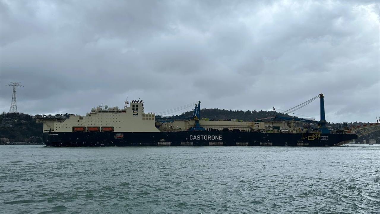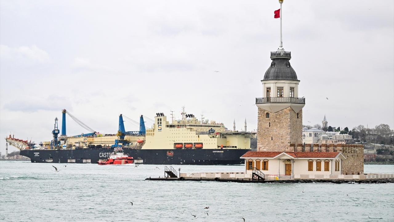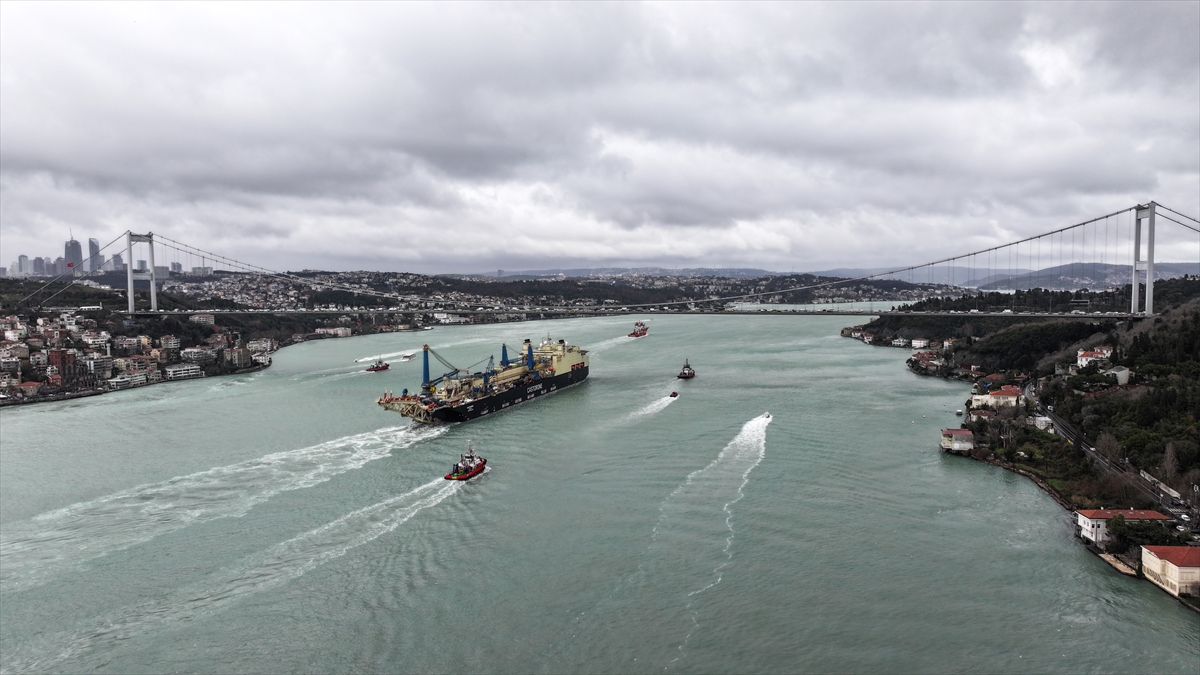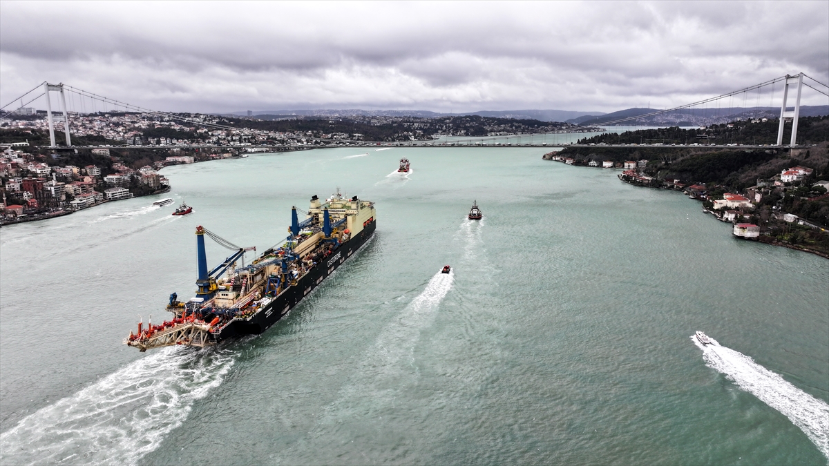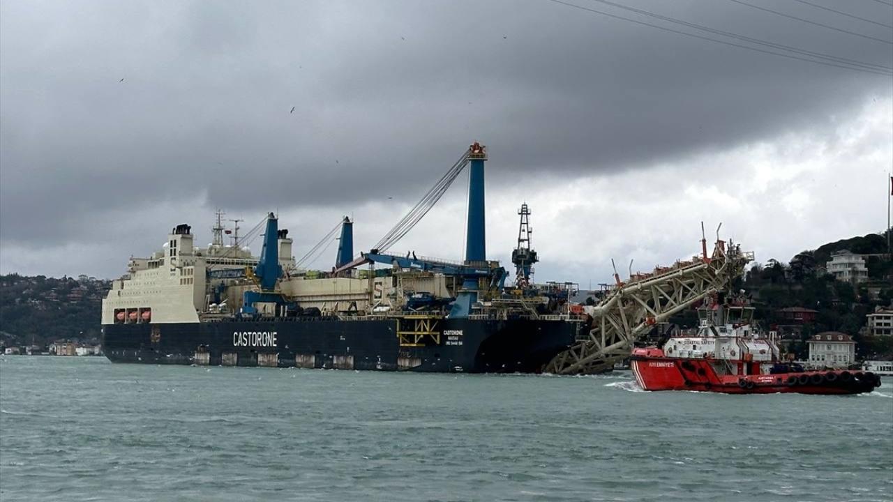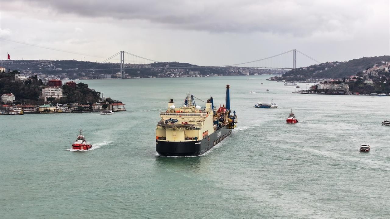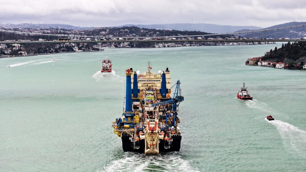 Boğaz`dan Karadeniz`e giden gemi, Türkiye`nin Karadeniz`de keşfettiği doğal gazın 2`nci faz çalışmaları kapsamında hem karaya hem de yüzer gemi platformuna boru döşeyecek.