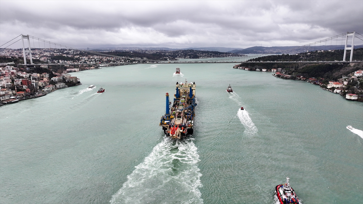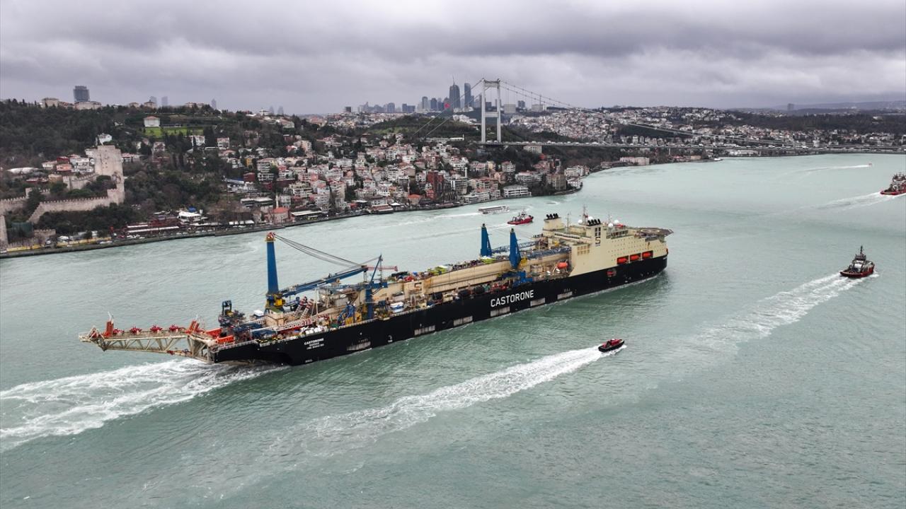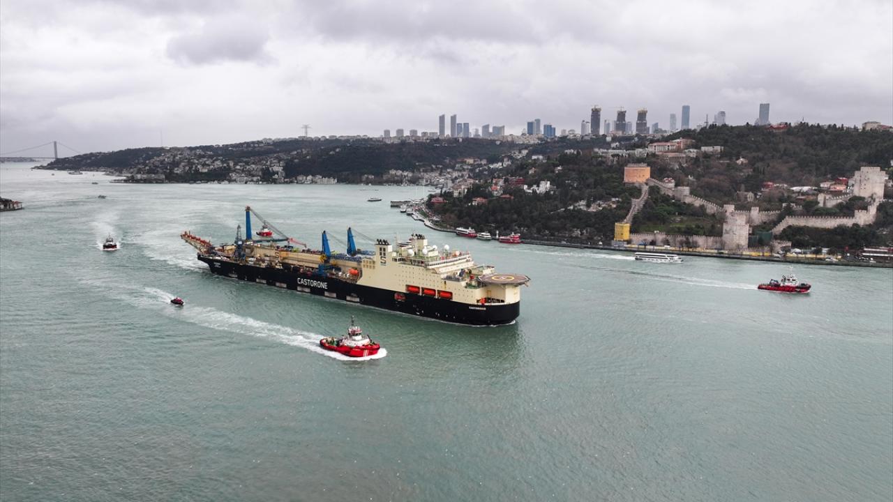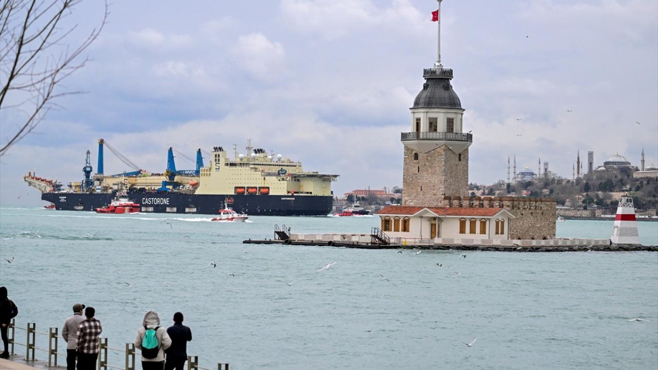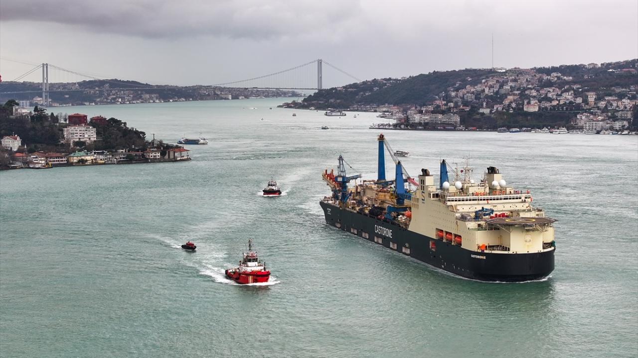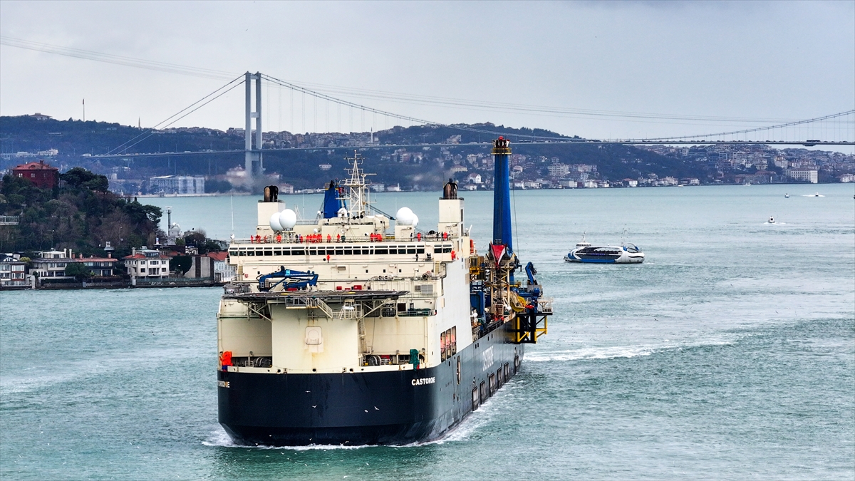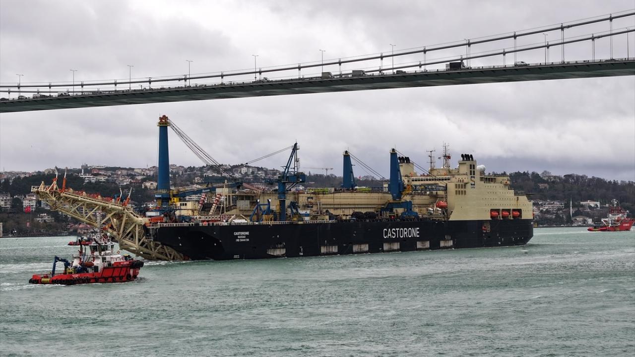Boğaz`dan Karadeniz`e giden gemi, Türkiye`nin Karadeniz`de keşfettiği doğal gazın 2`nci faz çalışmaları kapsamında hem karaya hem de yüzer gemi platformuna boru döşeyecek.