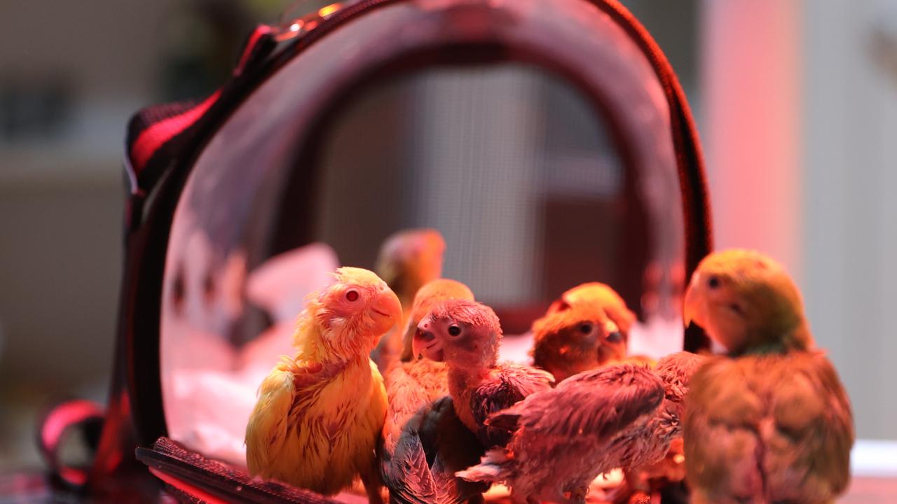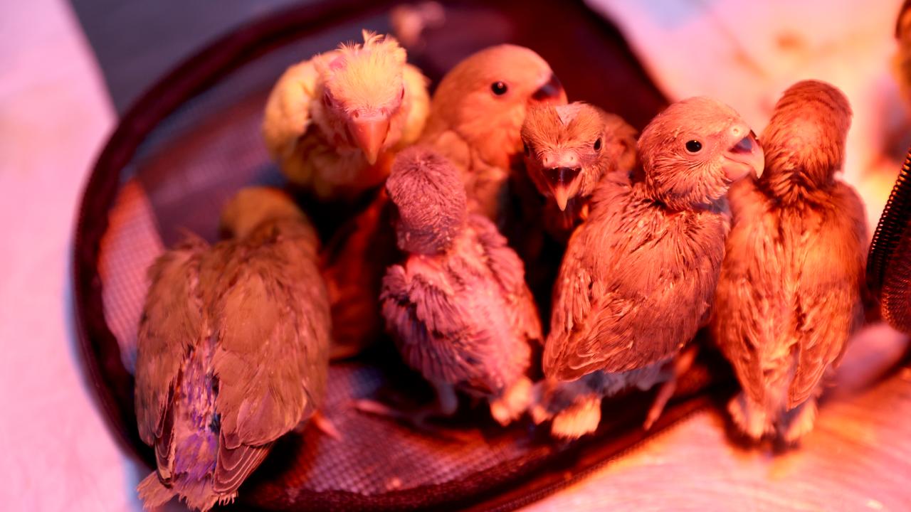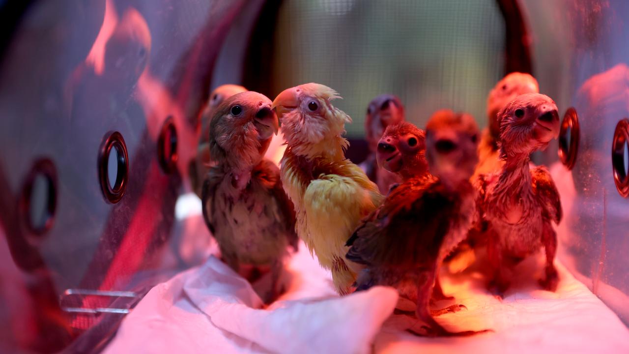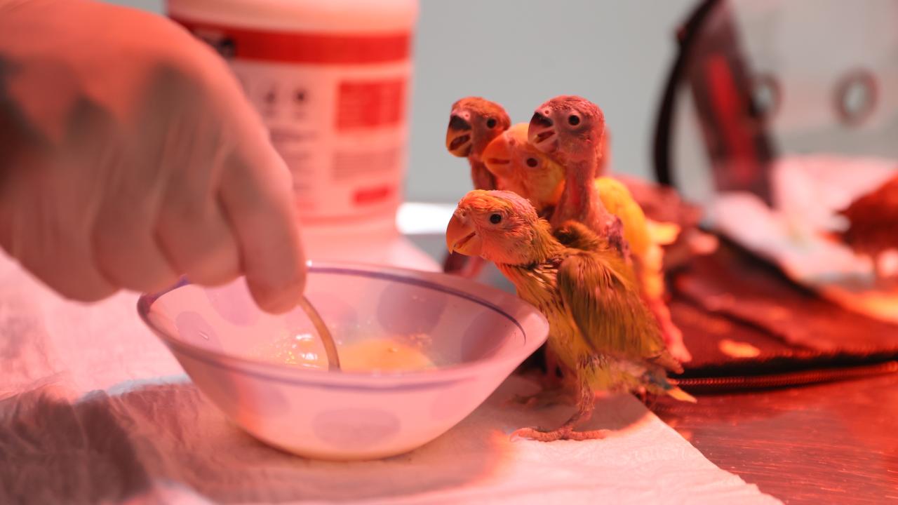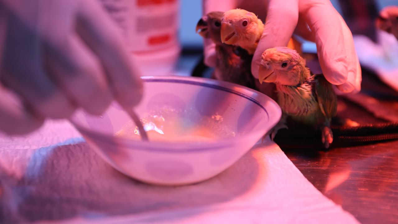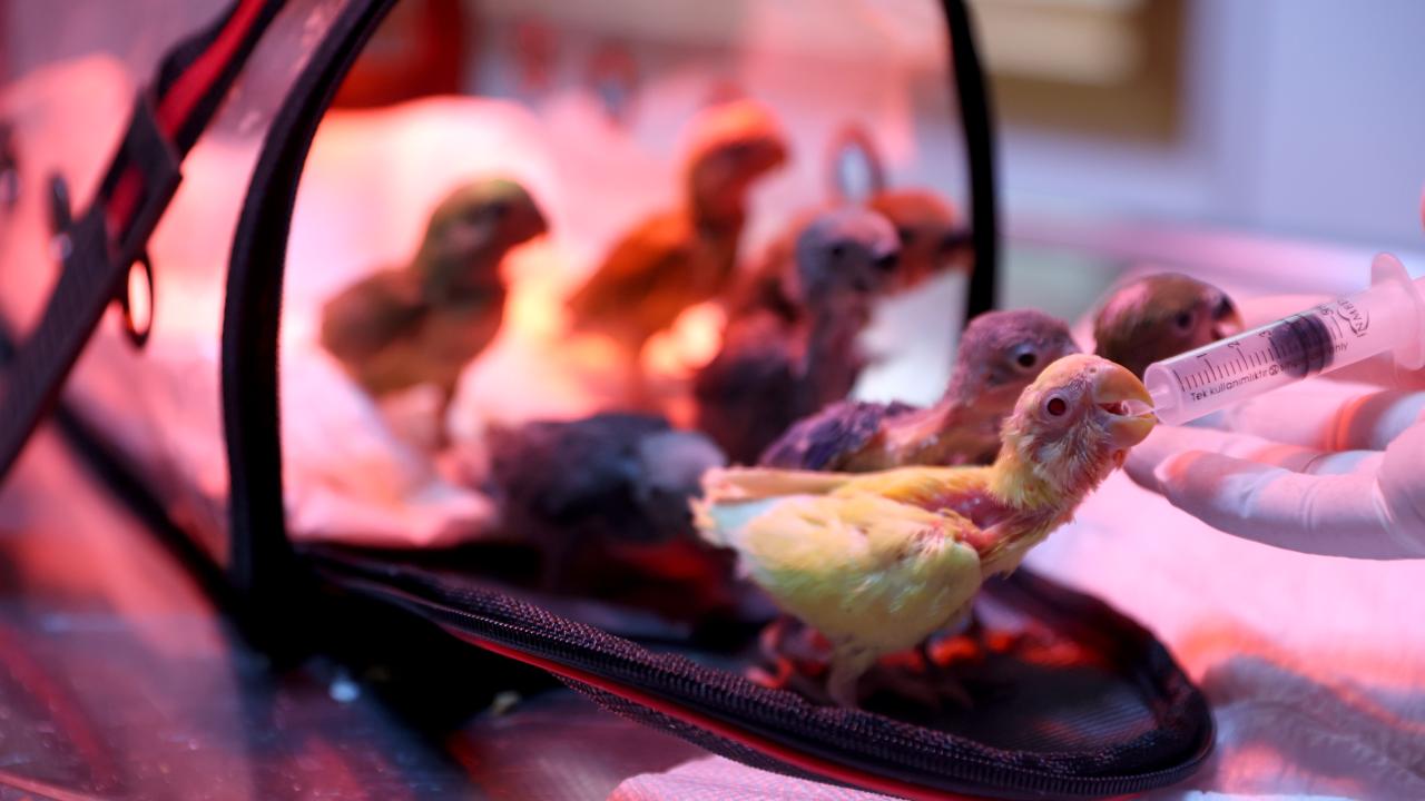 Antalya'da belgesiz bir şekilde satılmaya çalışıldığı için el konulan cennet papağanı yavrularına Antalya Doğal Yaşam Parkı'nda veteriner hekimler tarafından özenle bakılıyor.