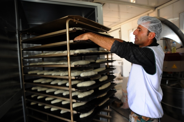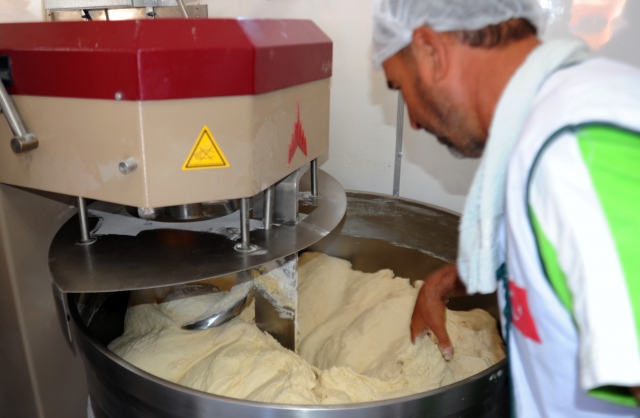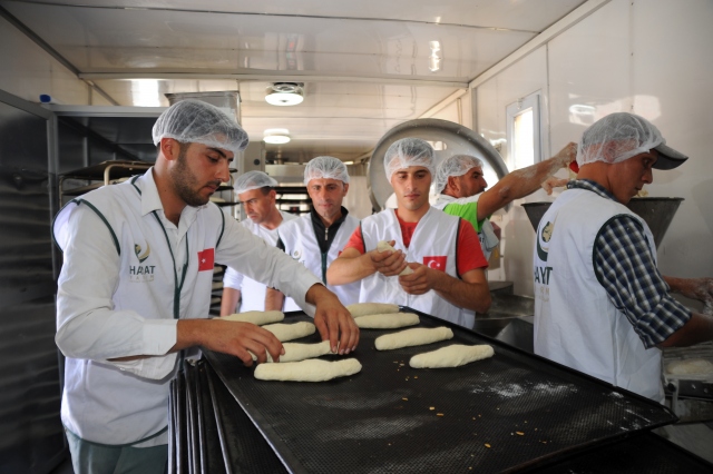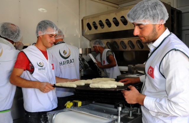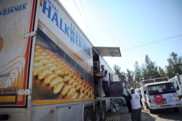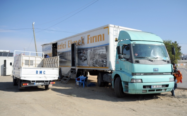 Gaziantep'in Karkamış ilçesine kurulan mobil fırında pişirilen günlük 10 bin ekmek, Suriye'nin Halep kentine bağlı Cerablus ilçesindeki ihtiyaç sahiplerine dağıtılıyor. Mobil fırında 8'i Suriyeli olmak üzere 11 işçi çalışıyor.