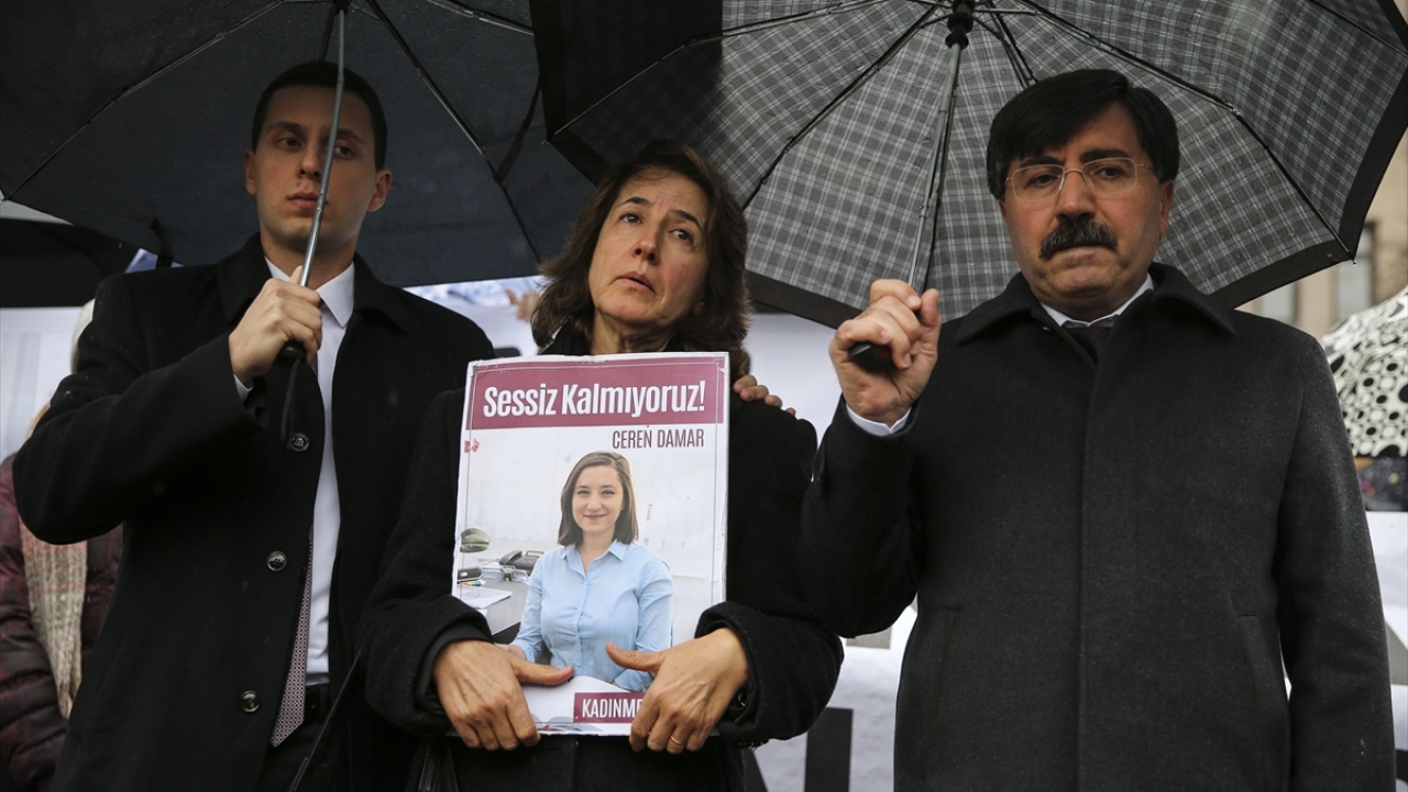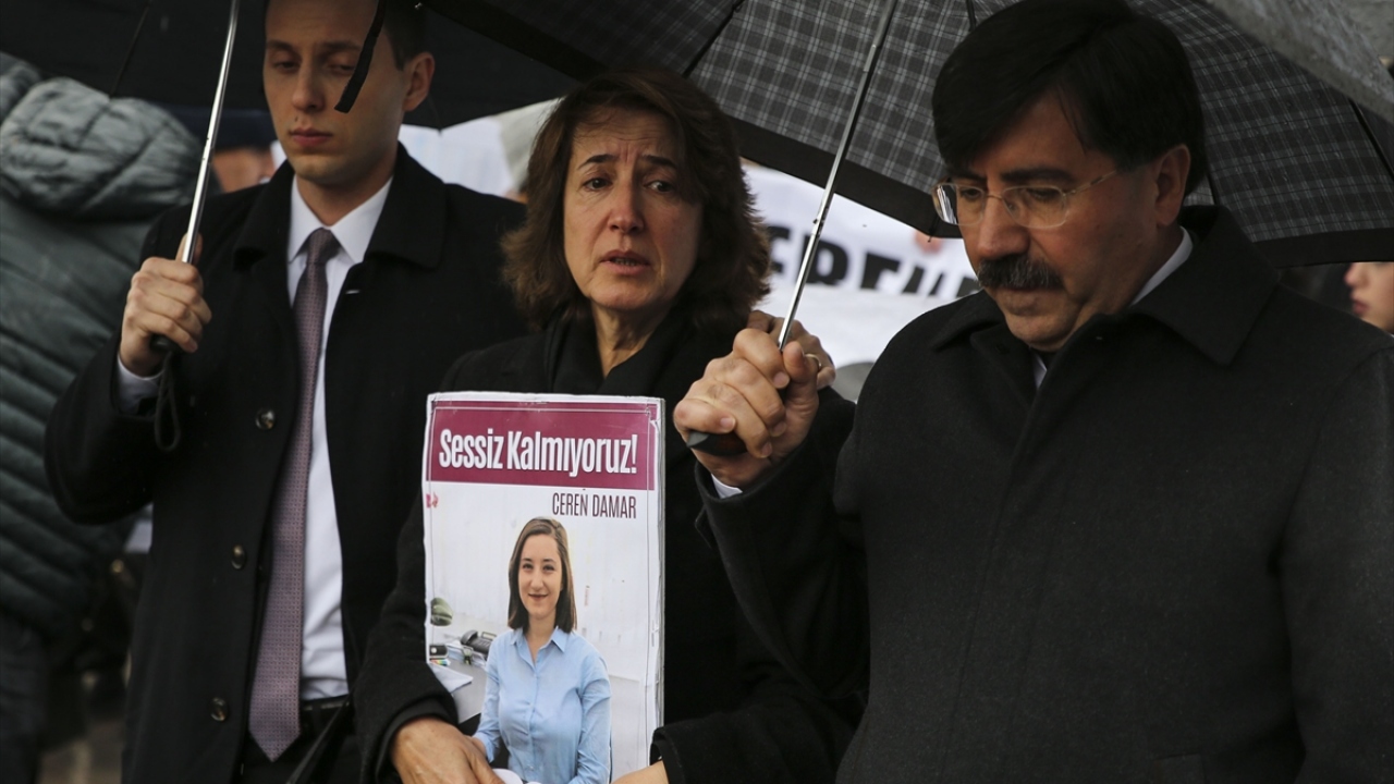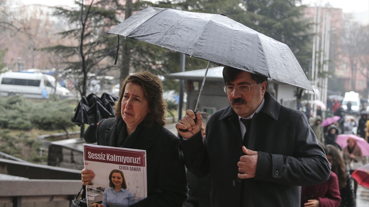 Çankaya Üniversitesi Hukuk Fakültesi Araştırma Görevlisi Ceren Damar Şenel'in katil zanlısı öğrencisi Hasan İsmail Hikmet'in yargılandığı davanın bugünkü celsesi öncesi Şenel'in babası Mustafa Damar ve annesi Feyzan Damar, Ankara Adliyesi önünde basın açıklaması yaptı.