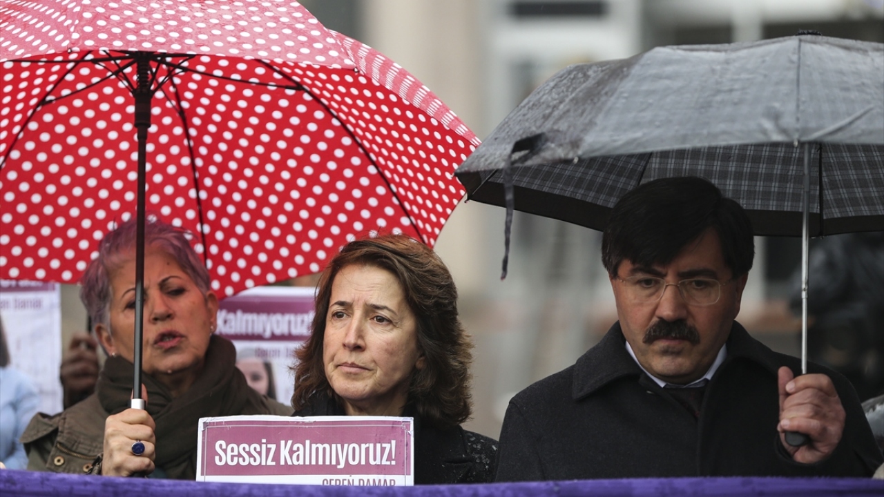 Duruşma öncesinde adliye önünde toplanan ve Ceren Damar Şenel`in fotoğraflarını taşıyan bir grup, "Sessiz Kalmıyoruz" ve "Erkek adalet değil, gerçek adalet" sloganları attı.