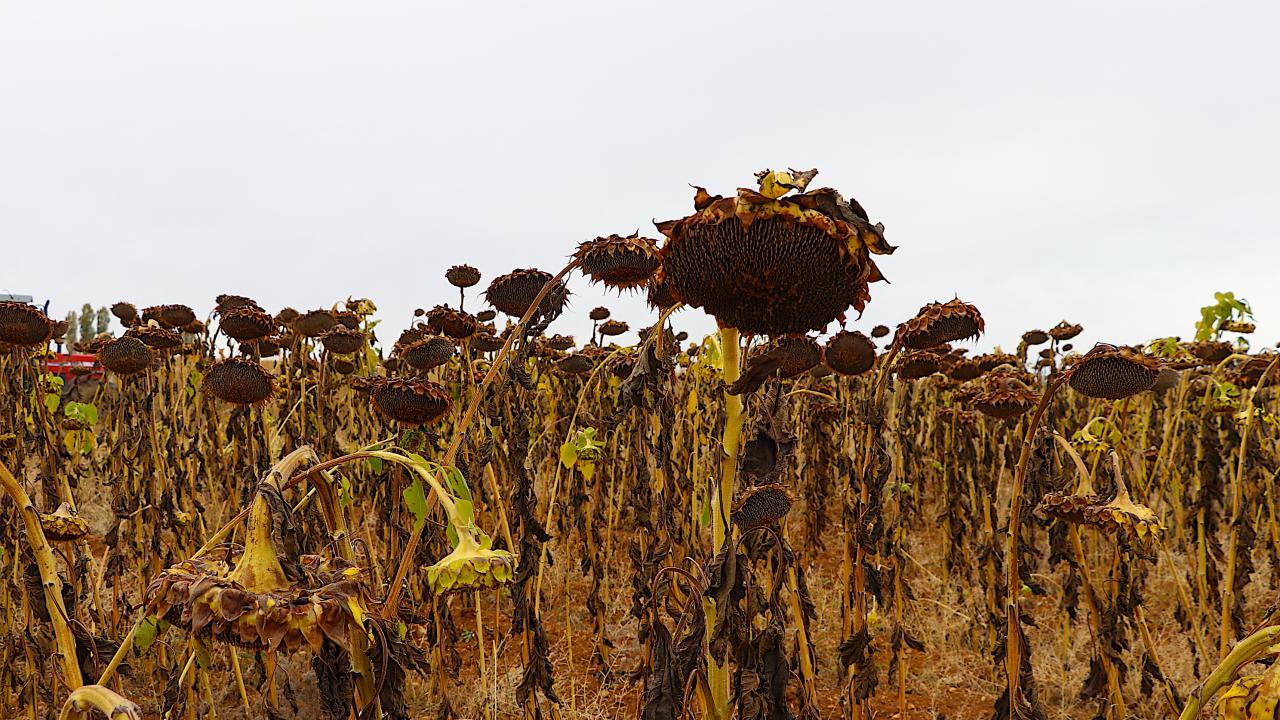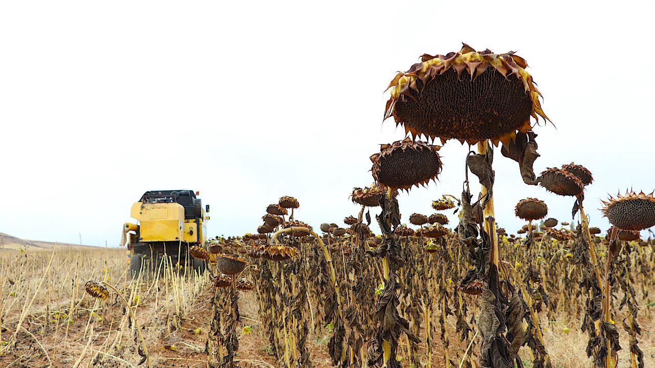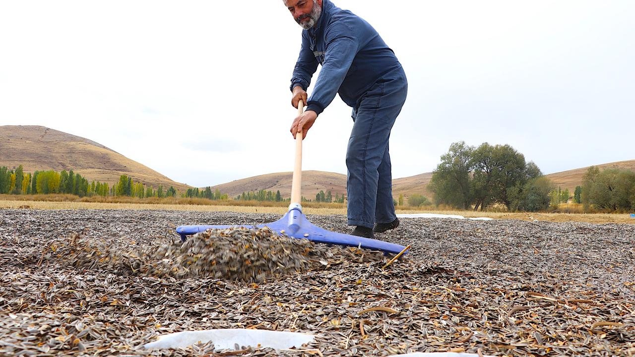 Biçerdöverlerle yapılan hasatla boyu 2 metreyi bulan ayçiçeklerinden elde edilen çekirdekler branda üzerinde kurutulmaya bırakılıyor.