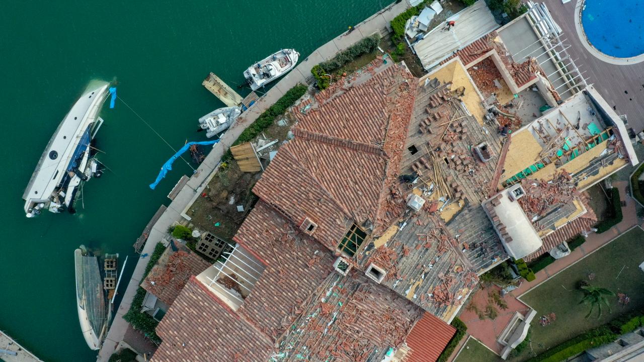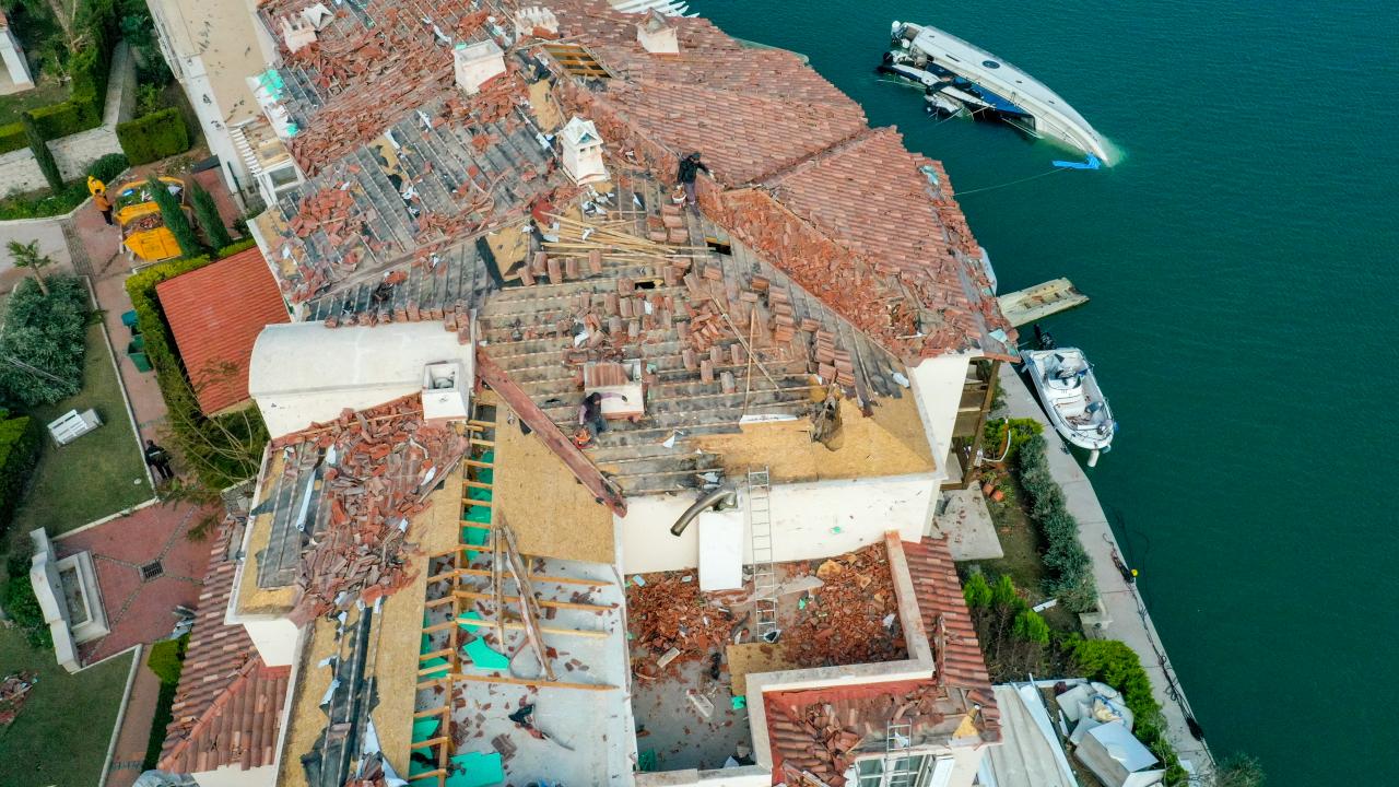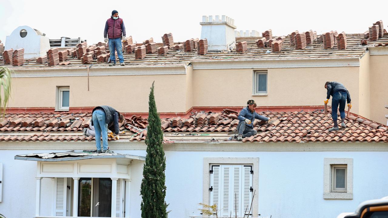 İşçiler bir taraftan çatılarda kırılan kiremitleri yenilerken bir taraftan da etrafa savrulan enkazları topluyor.