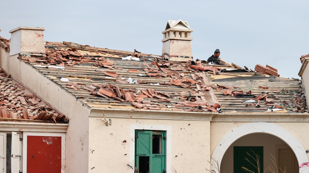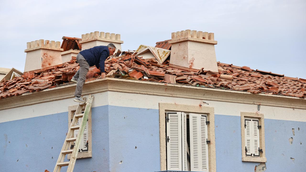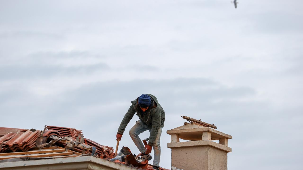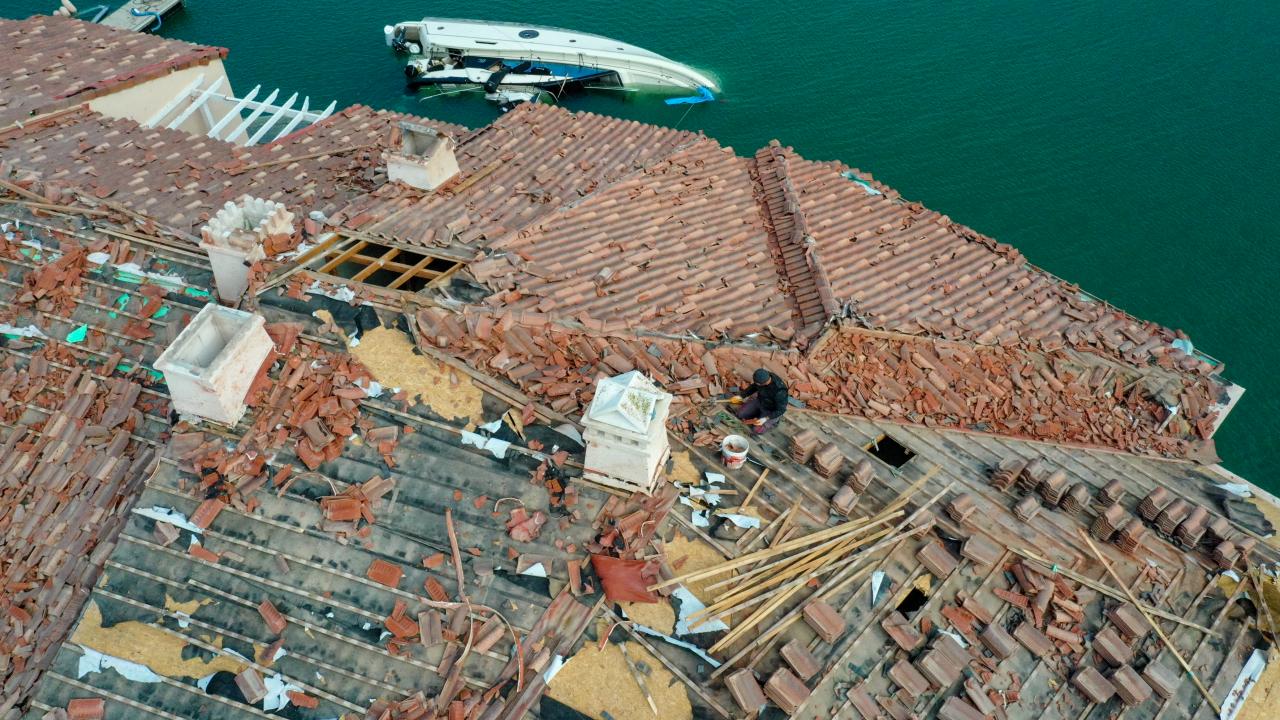 İşçiler bir taraftan çatılarda kırılan kiremitleri yenilerken bir taraftan da etrafa savrulan enkazları topluyor.