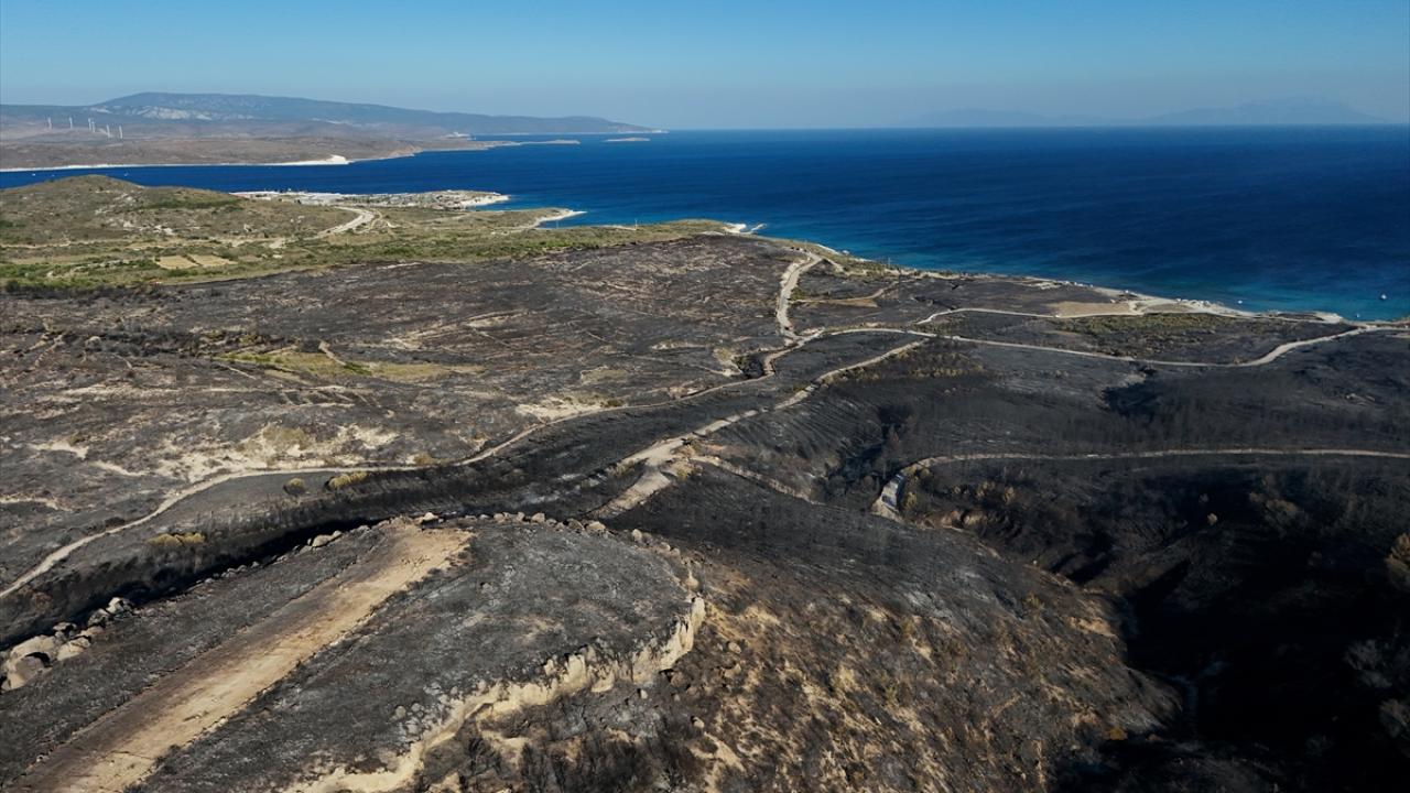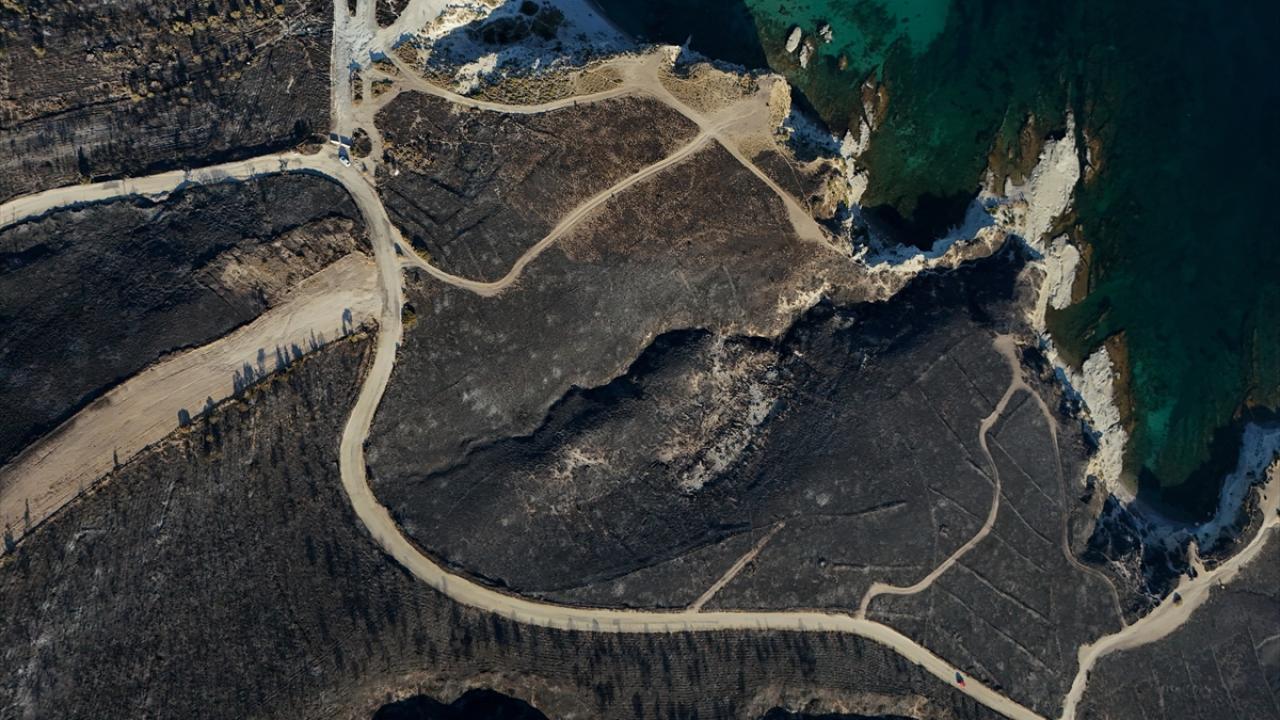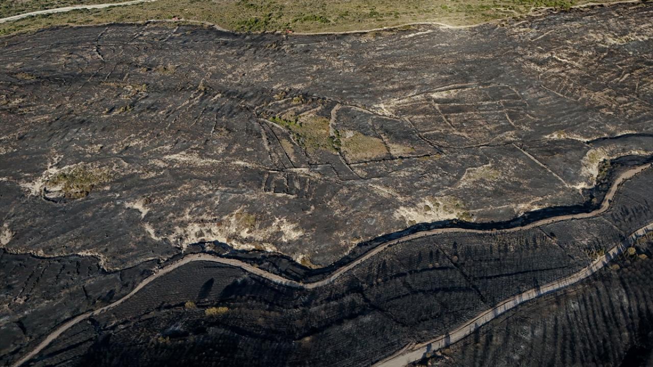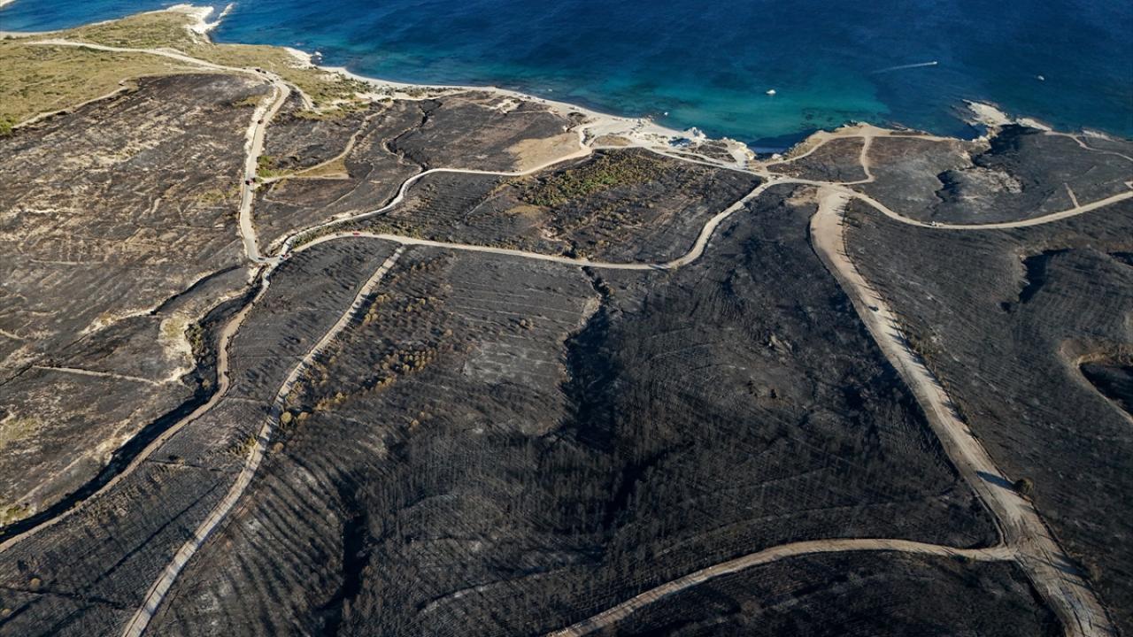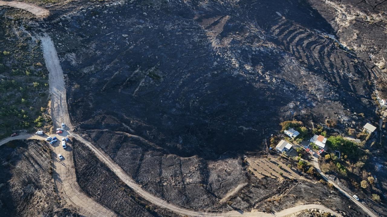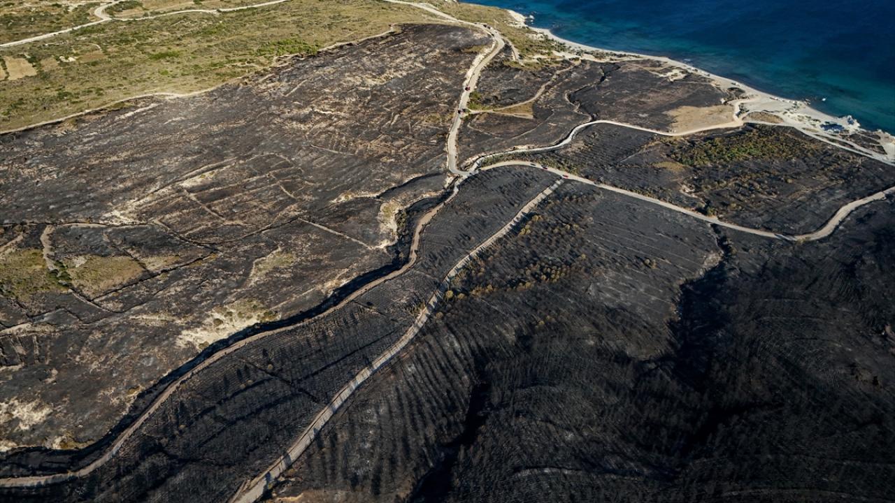 İzmir'in Çeşme ilçesinde Alaçatı Mahallesi Deliklikoy mevkisindeki ormanlık, makilik ve otluk alanda çıkan yangında zarar gören alan dron ile görüntülendi.