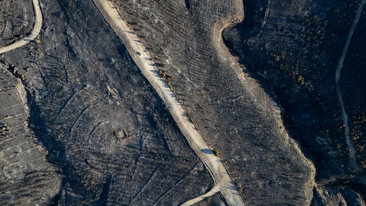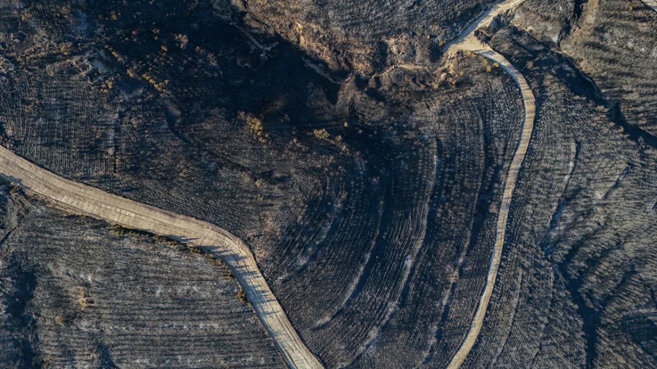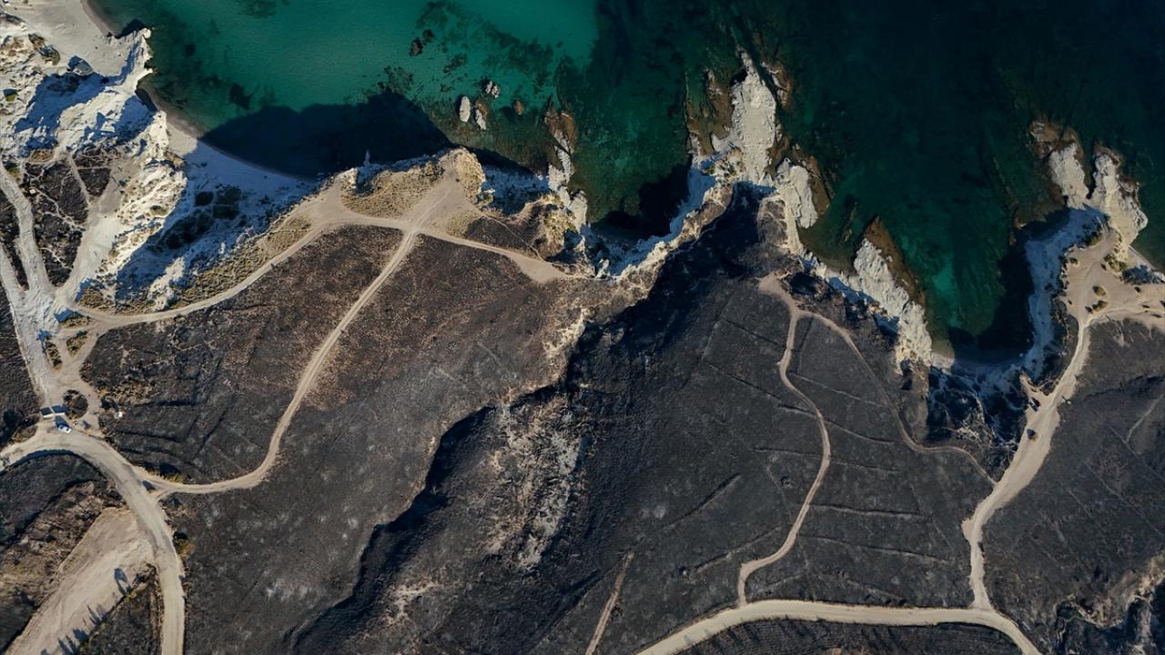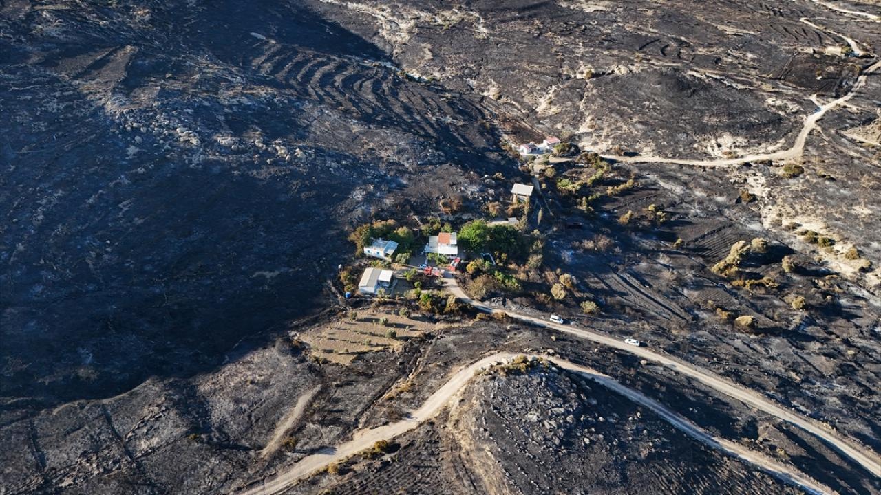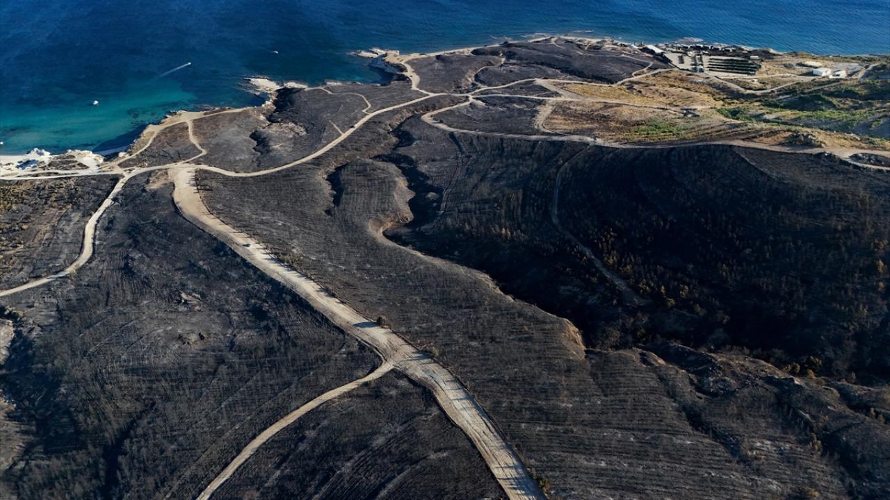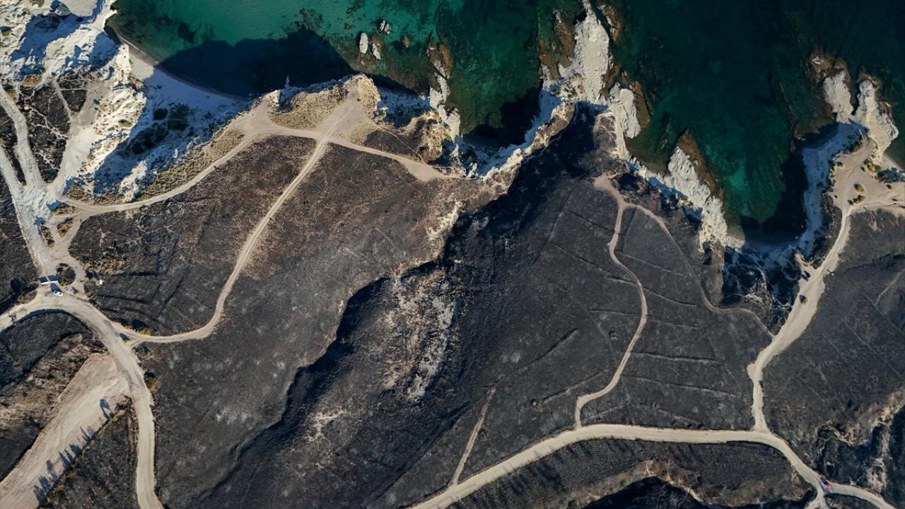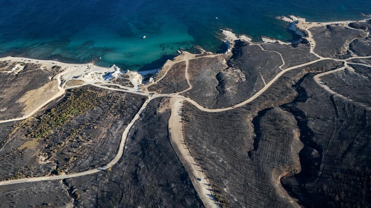 İzmir'in Çeşme ilçesinde Alaçatı Mahallesi Deliklikoy mevkisindeki ormanlık, makilik ve otluk alanda çıkan yangında zarar gören alan dron ile görüntülendi.