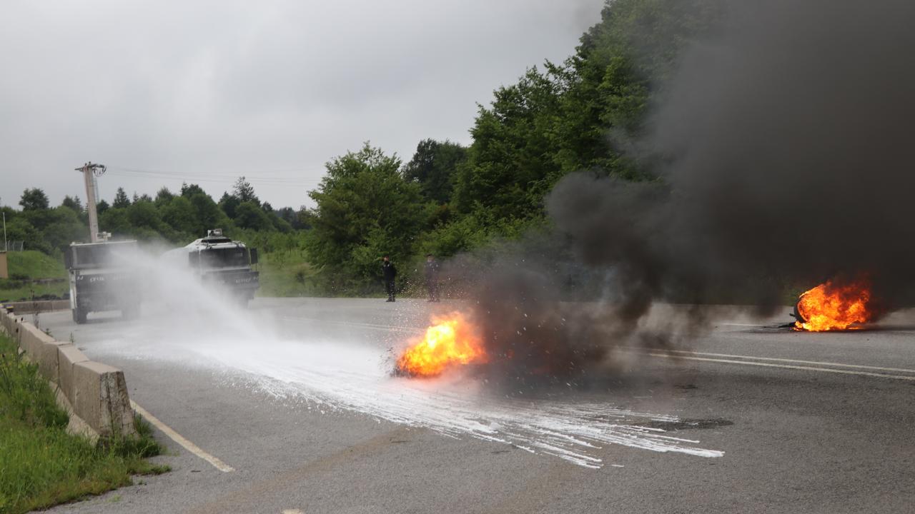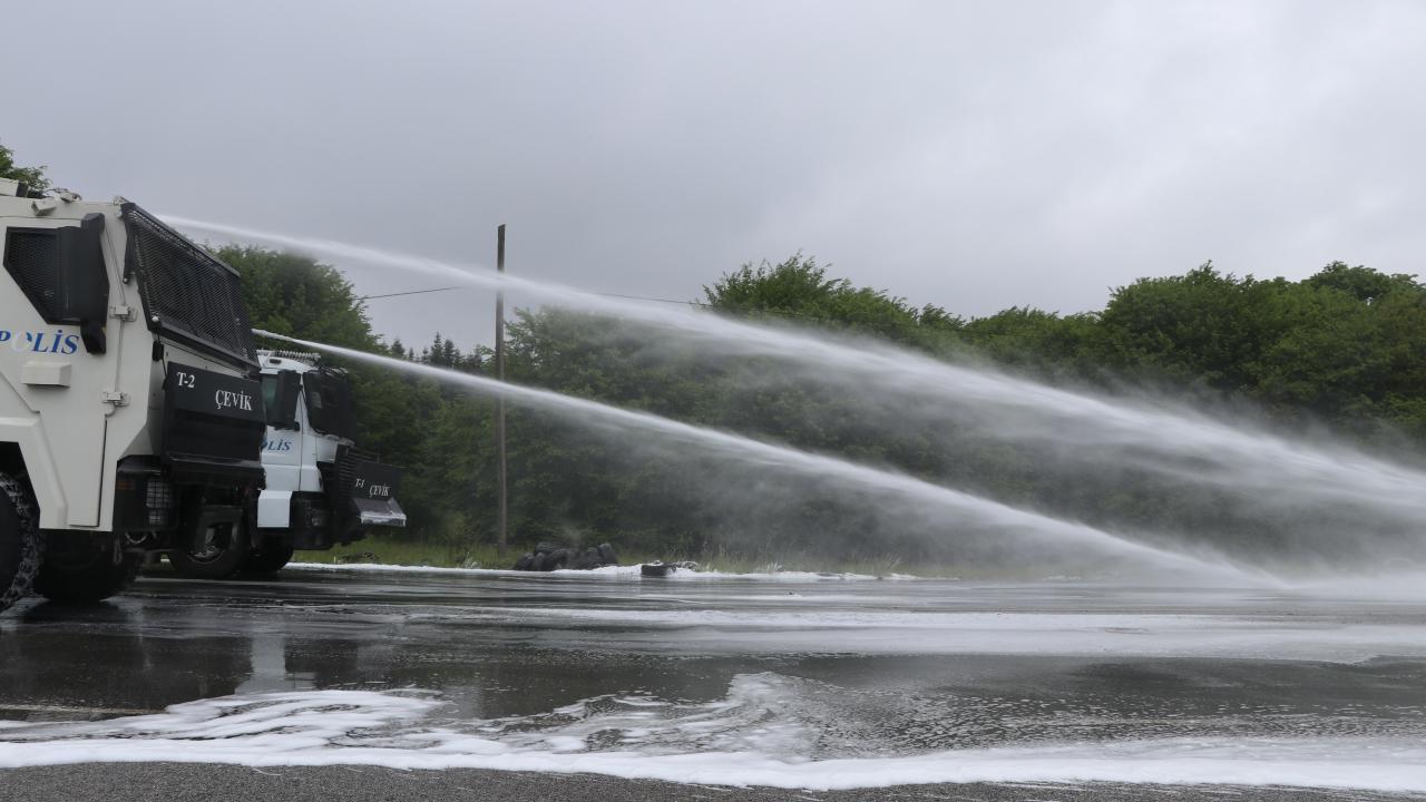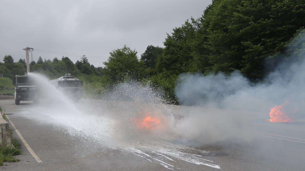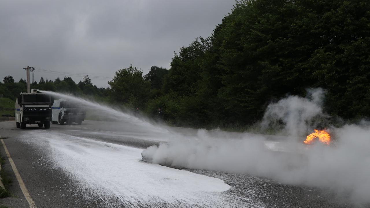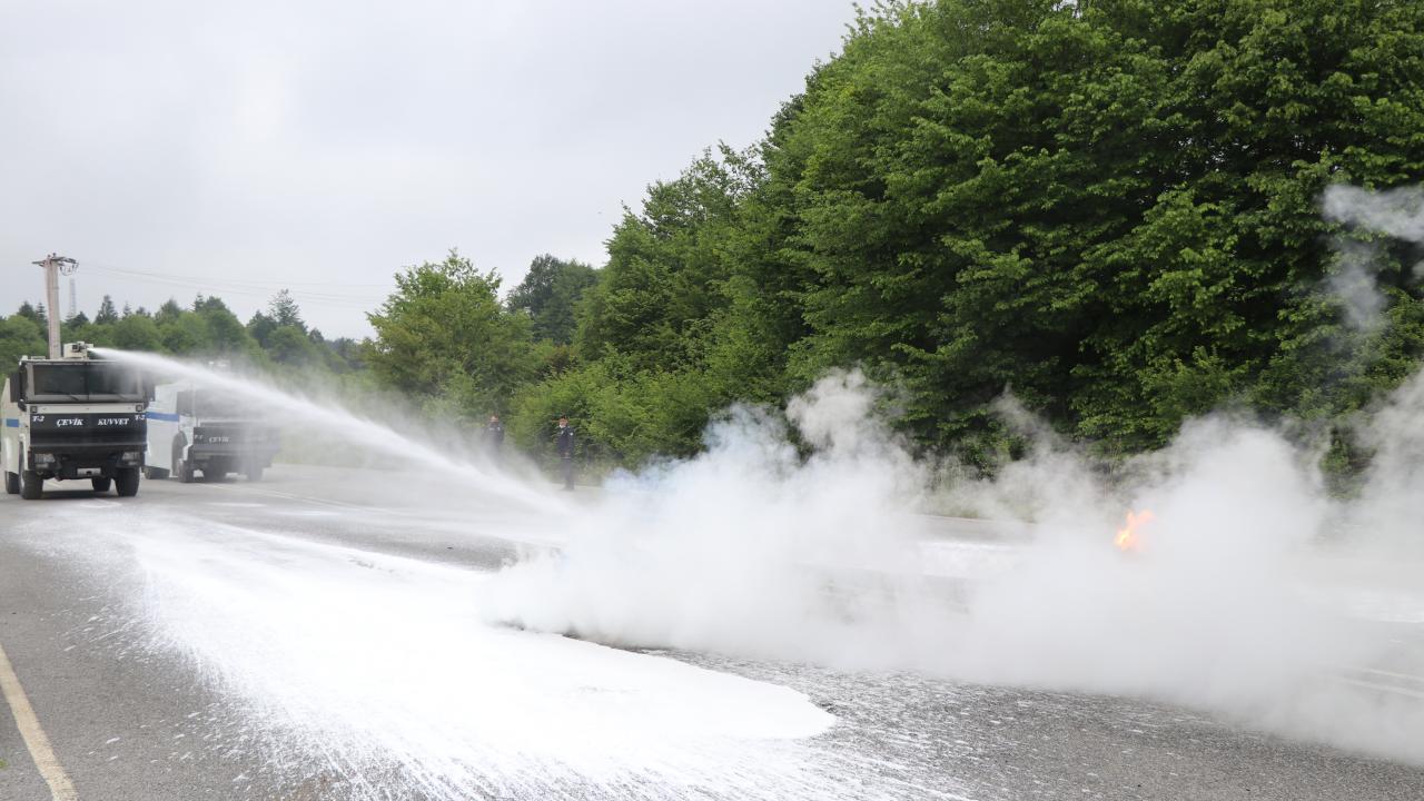 Bolu Emniyet Müdürlüğü Çevik Kuvvet Şube Müdürlüğü ekipleri, TOMA ile barikata yaklaşım, barikatı dağıtma, yangın söndürme ve süpürme konularında tekamül eğitiminden geçirilen ekipler, TOMA ile sürüş yaptı, yakılan hedeflere su sıktı.
