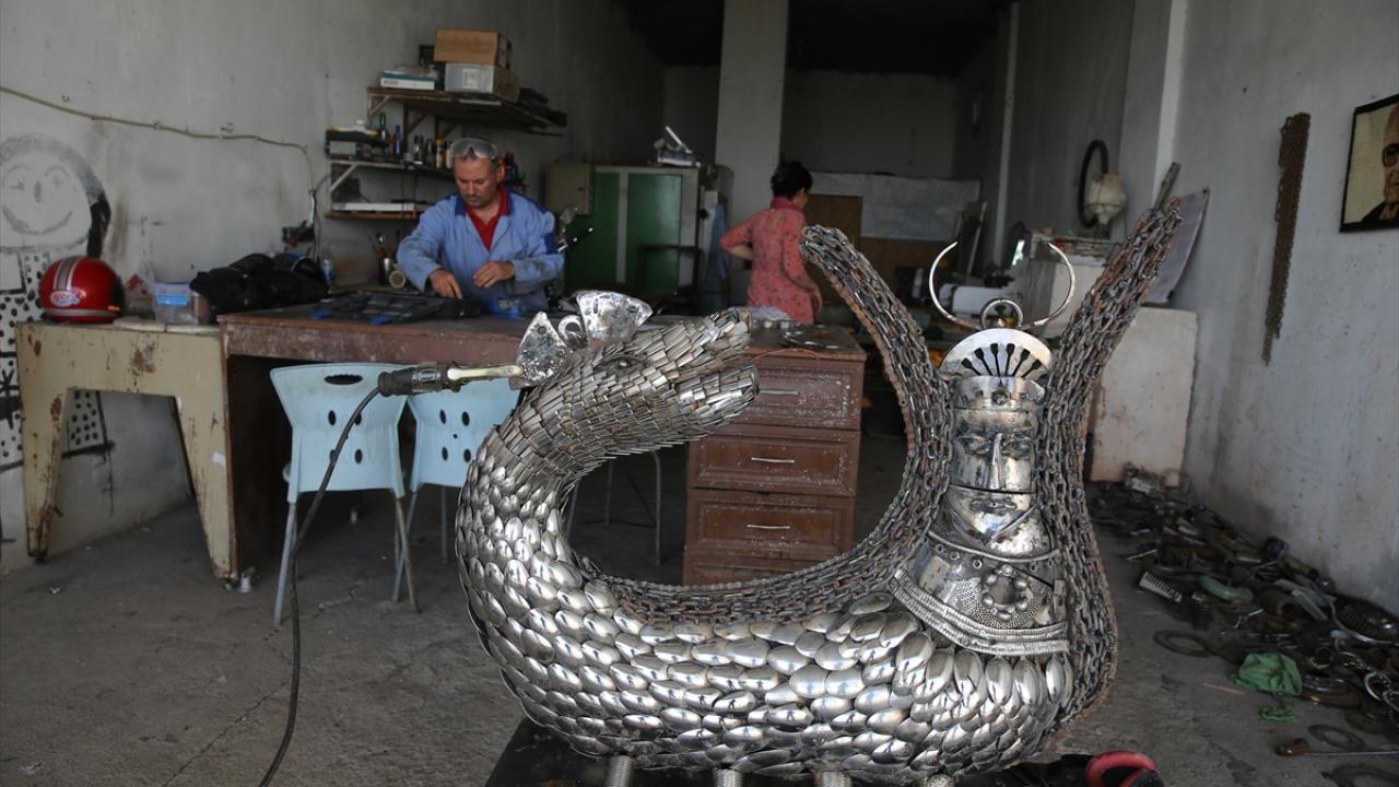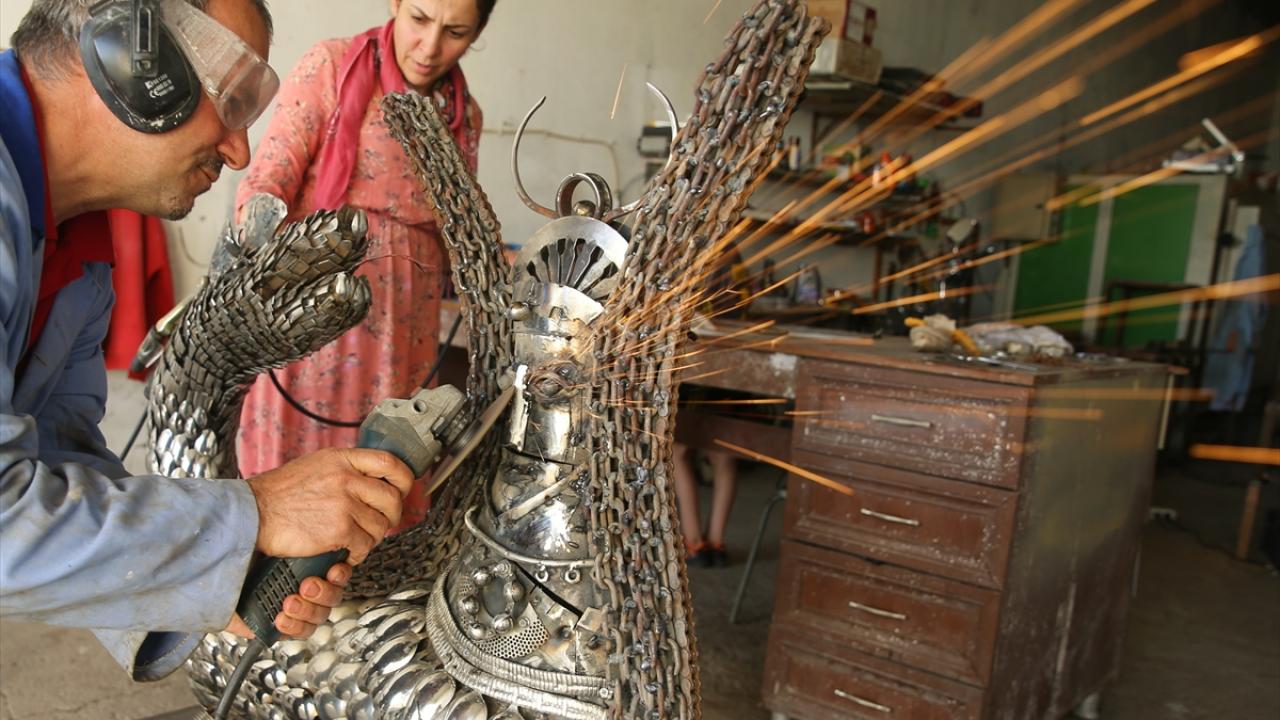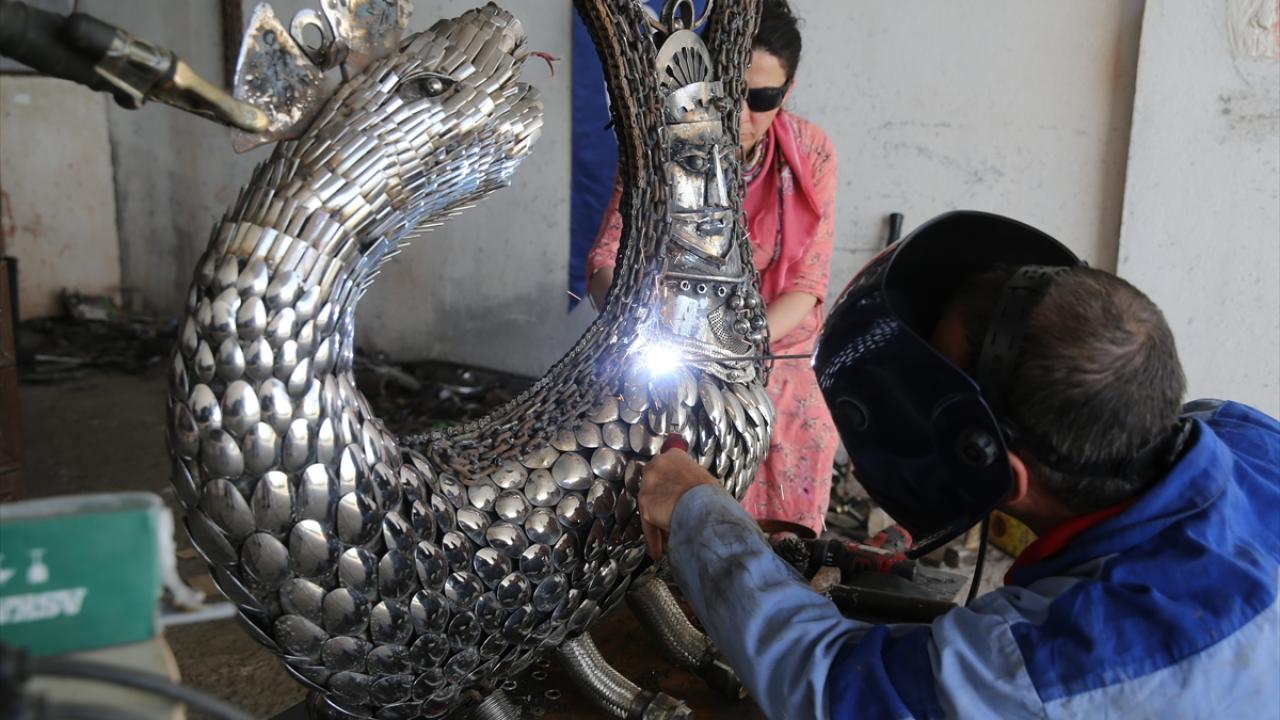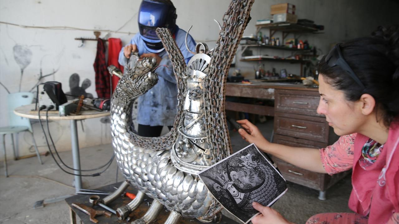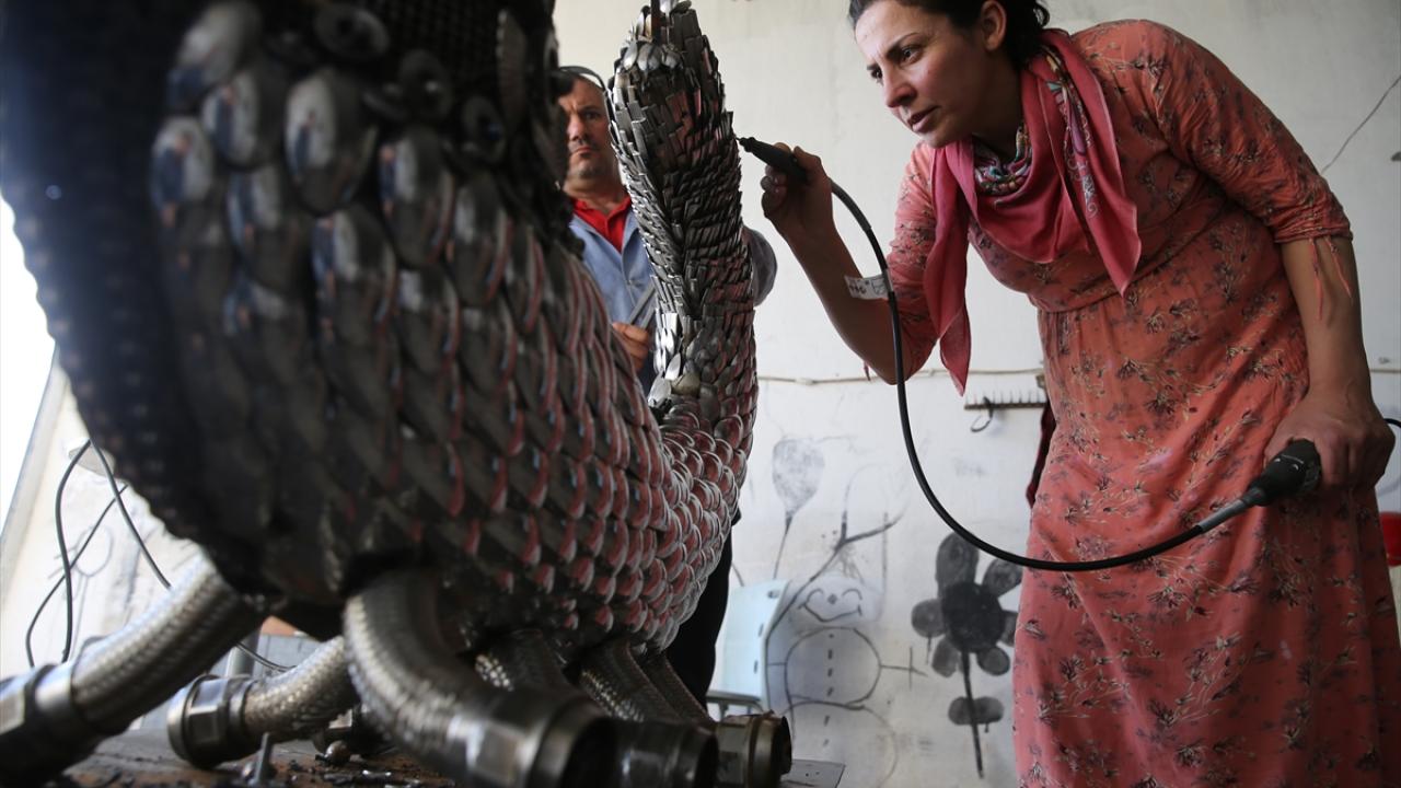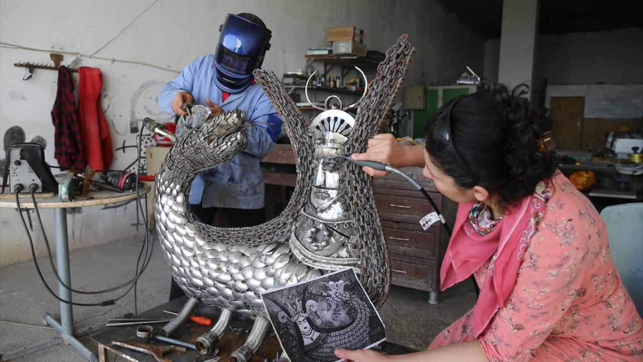 Mardin'in merkez Artuklu ilçesinde ressam ve heykeltıraş Nurettin Çakmak, metal geri dönüşüm atıklarından hazırladığı şahmeran heykeliyle çevre kirliliğine dikkati çekiyor.