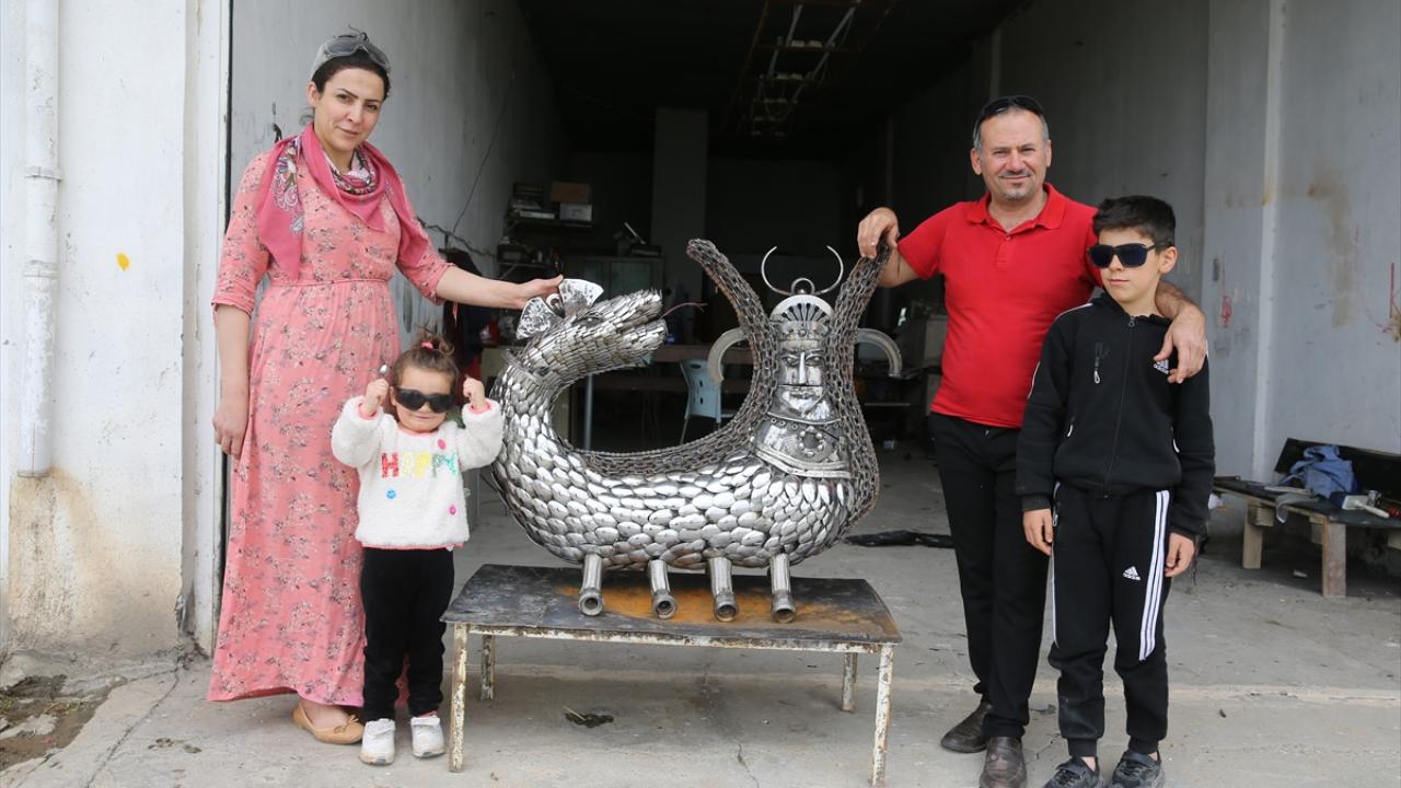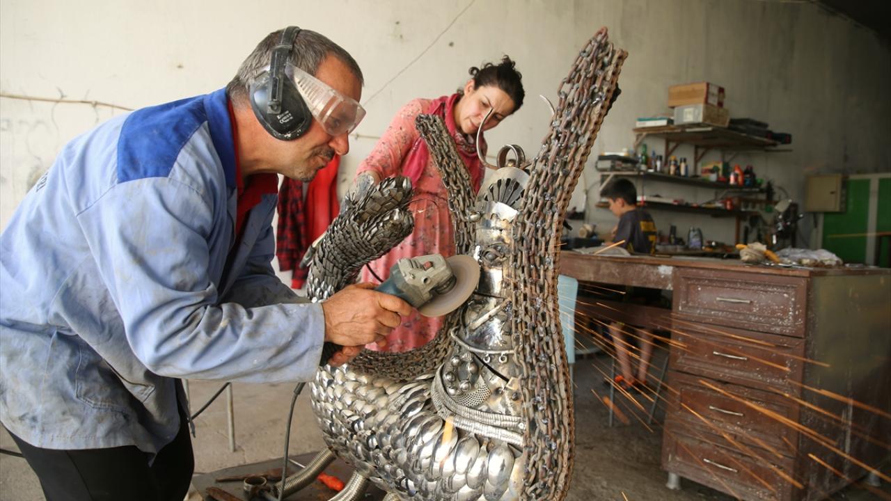 2 çocuk babası Nurettin Çakmak, eşi Agrin Çakmak`ın da desteğiyle "Mardin Sanat Merkezi" adını verdikleri evinin alt katındaki atölyede çevre kirliliğine ve geri dönüşüme dikkati çekmek için bugüne kadar 21 eser hazırladı.