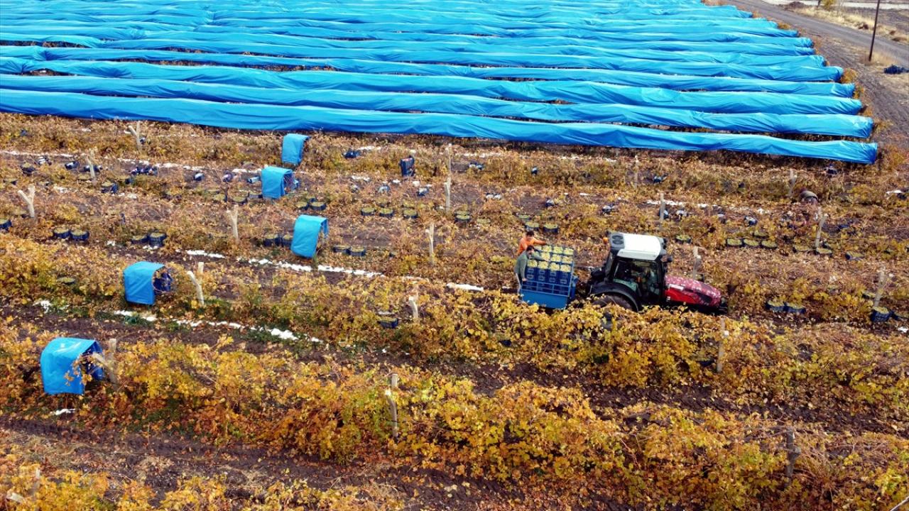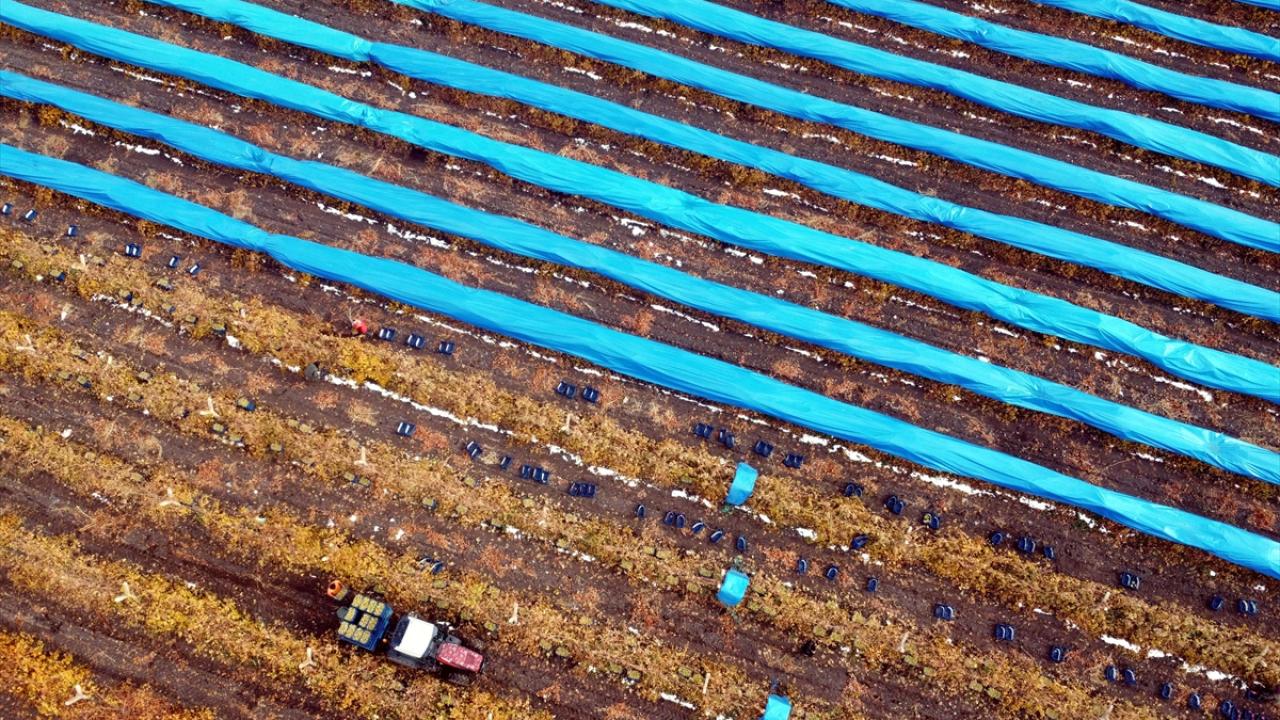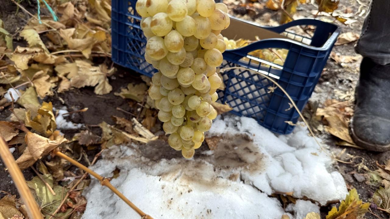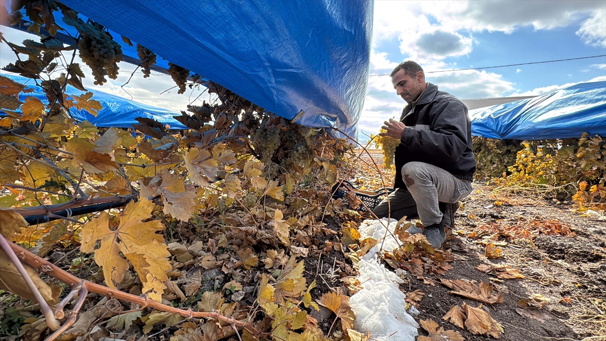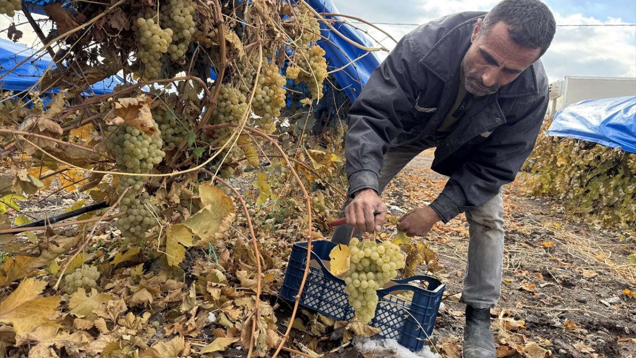 Karlı kaplı ovada branda altında üzüm toplayan üreticiler hasadı ocak ayına kadar sürdürmeyi hedefliyor.
