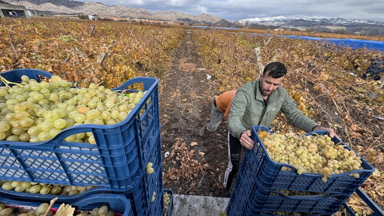 "Şu an kış şartlarına dayanıklı olmasıyla, raf ömrü uzun bilinen `Ağın beyazı` çeşidimizde hasadı sürdürüyoruz. Gündüzleri hava nispeten iyi olsa da geceleri genelde kar yağışıyla karşı karşıya kalıyoruz. Sıcaklıklar sıfırın altında 6-7 derecelere kadar düşüyor. Ovada gece ve gündüz arasında ciddi sıcaklık farkı var. Üzümü gece de muhafaza ederek hasadı ocak ayına kadar sürdürebiliyoruz."