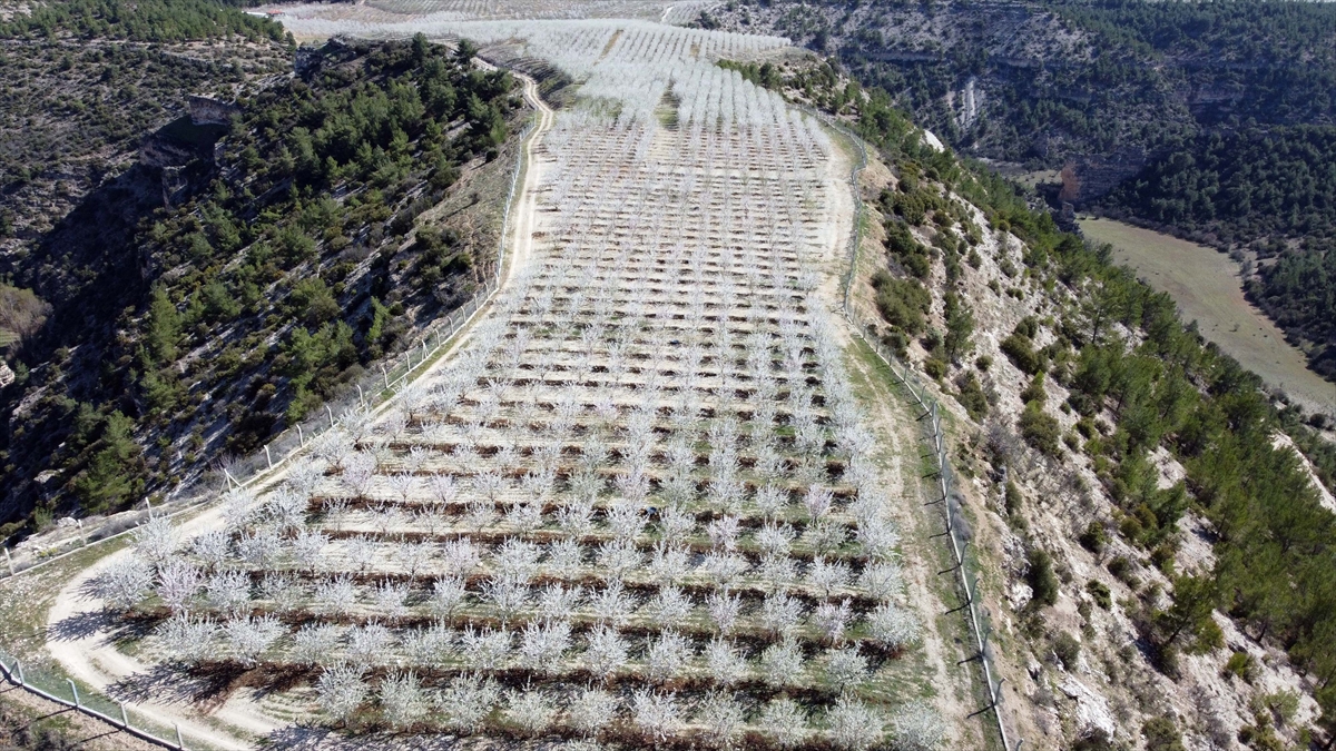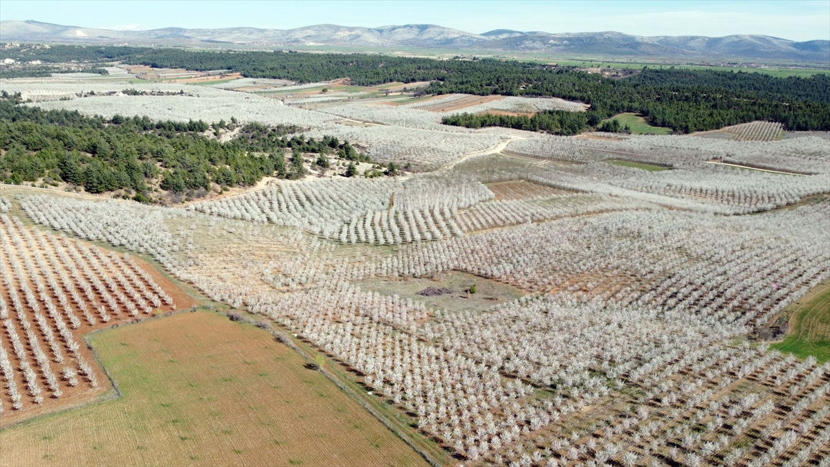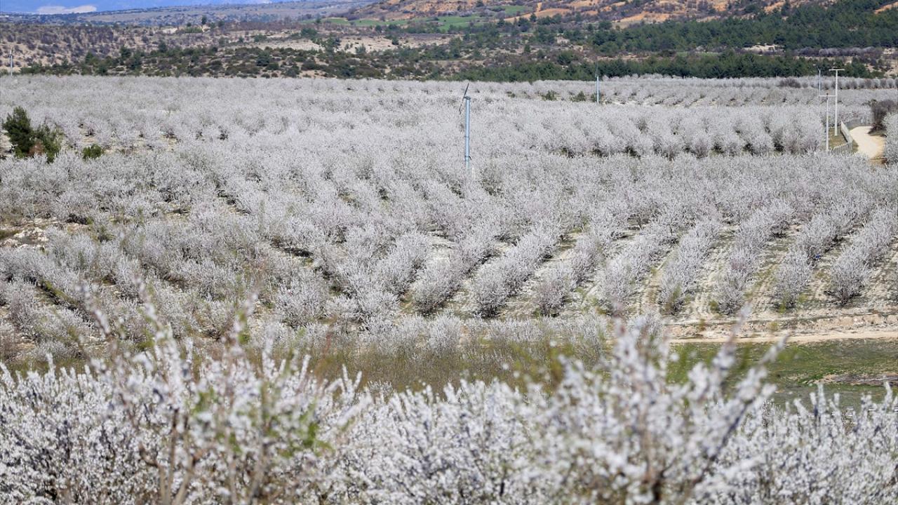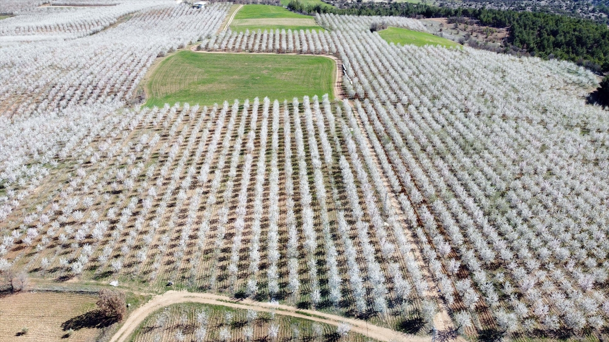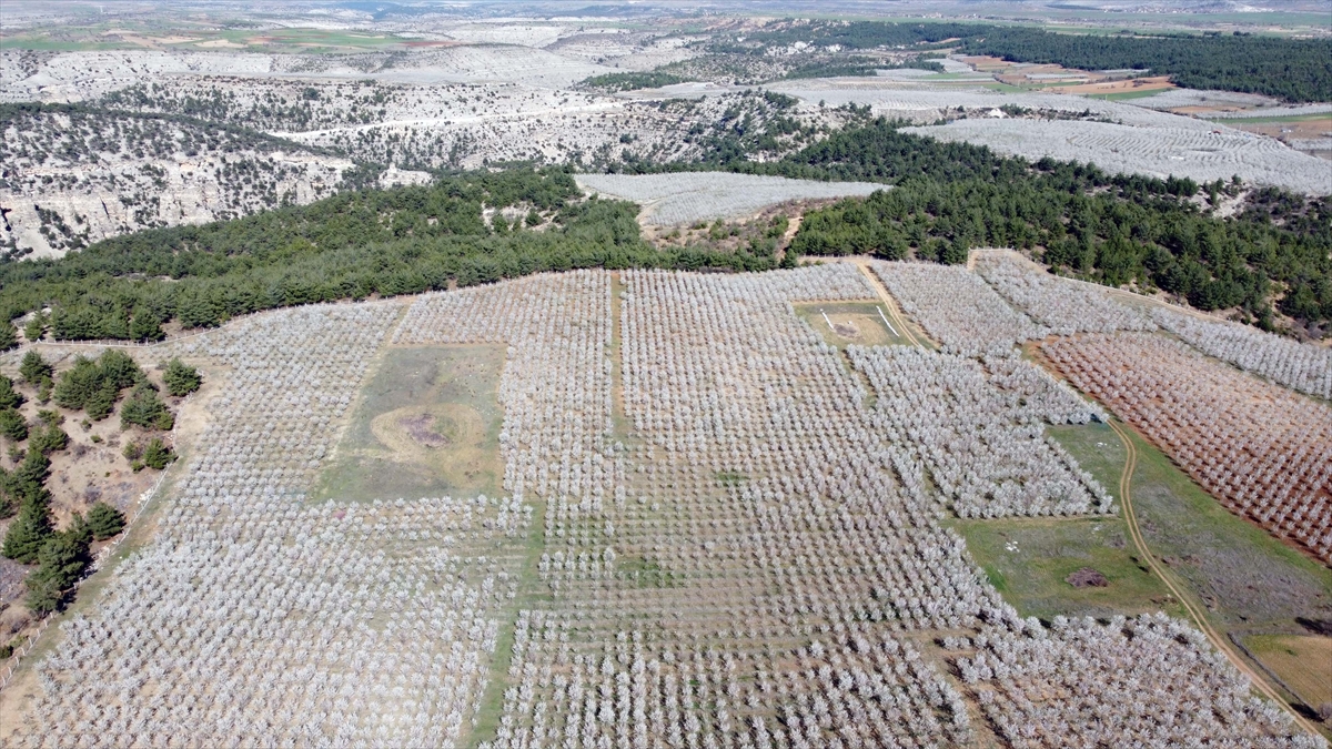 Ulubey Kanyonu`nun eteklerine kadar uzanan badem bahçelerinde güzel görüntü oluştu.