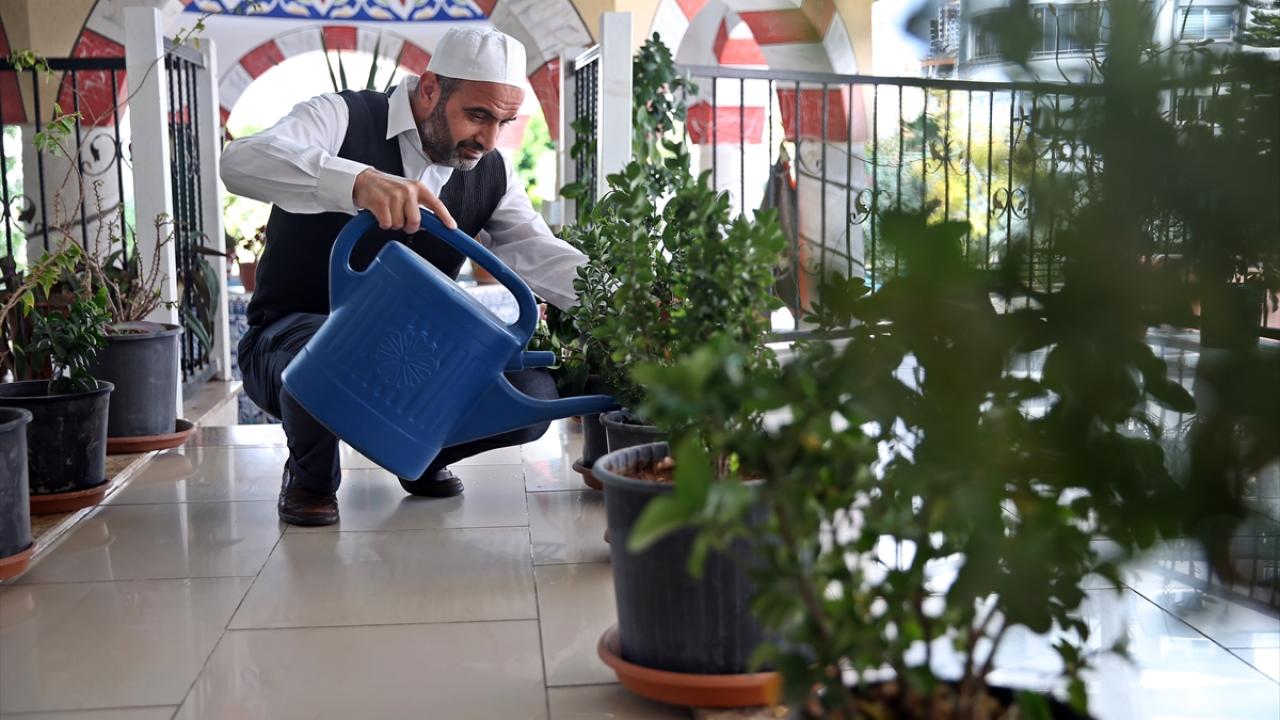 Mezitli ilçesindeki Mustafa Şahin Camisi`nde görev yapan 50 yaşındaki Koçar, çocuklara doğa sevgisi aşılamak amacıyla evinde yetiştirdiği 5 saksı çiçeğini ibadethaneye getirdi.