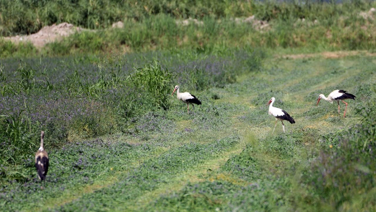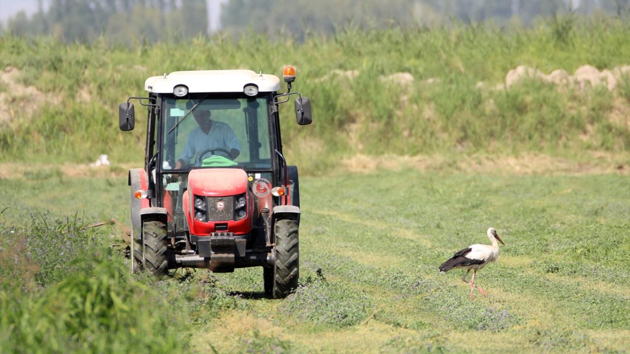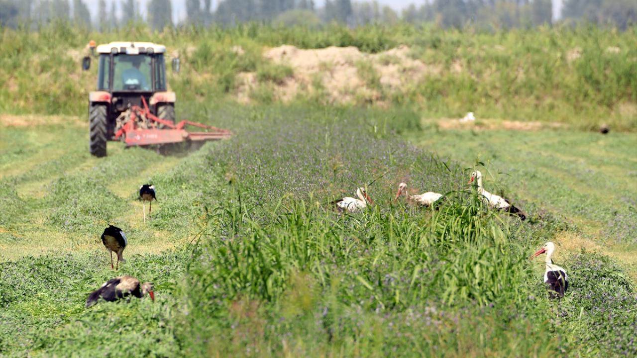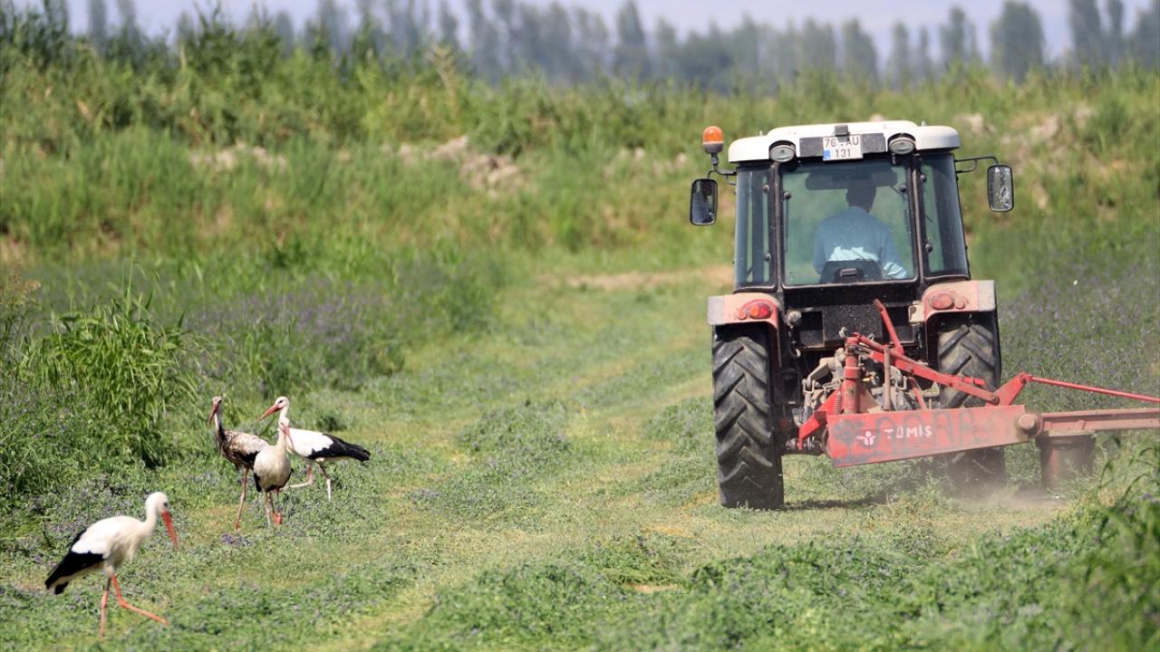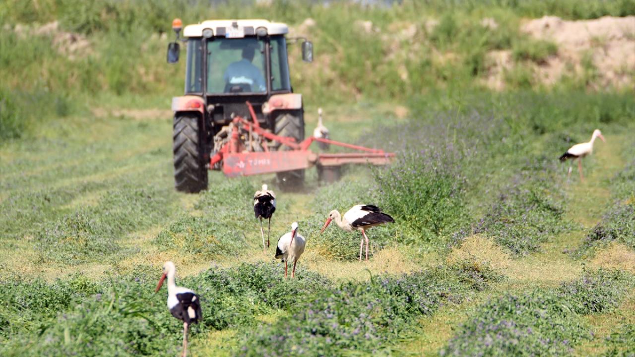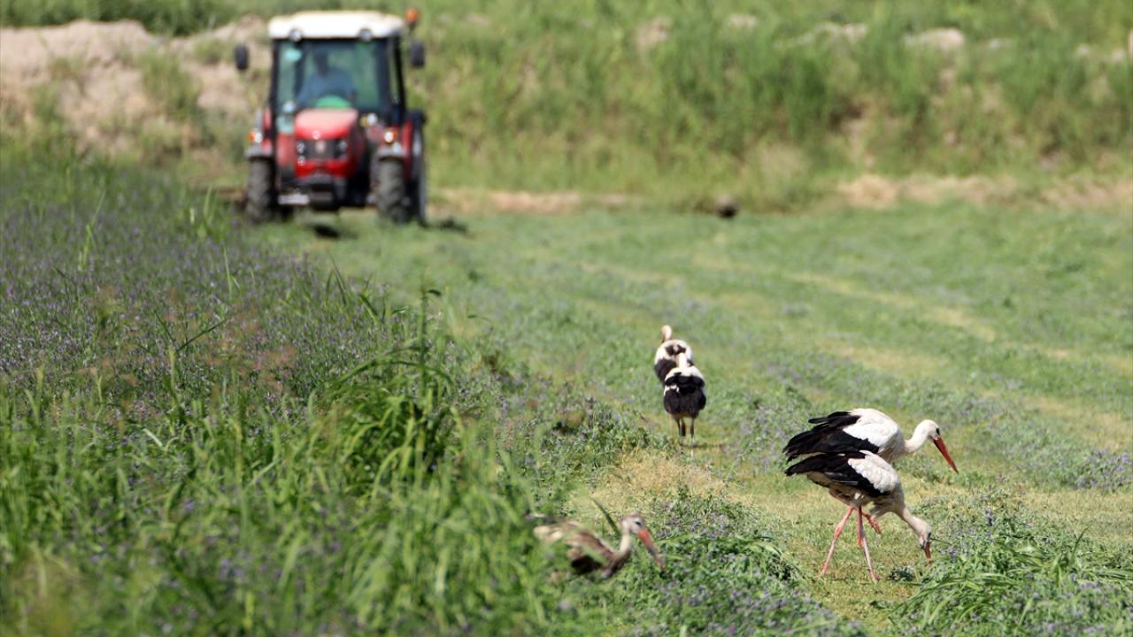 Yoncaları tarım makineleriyle toplayan çiftçilerin bahçelerine konuk olan leylekler de burada payına düşeni alıyor.