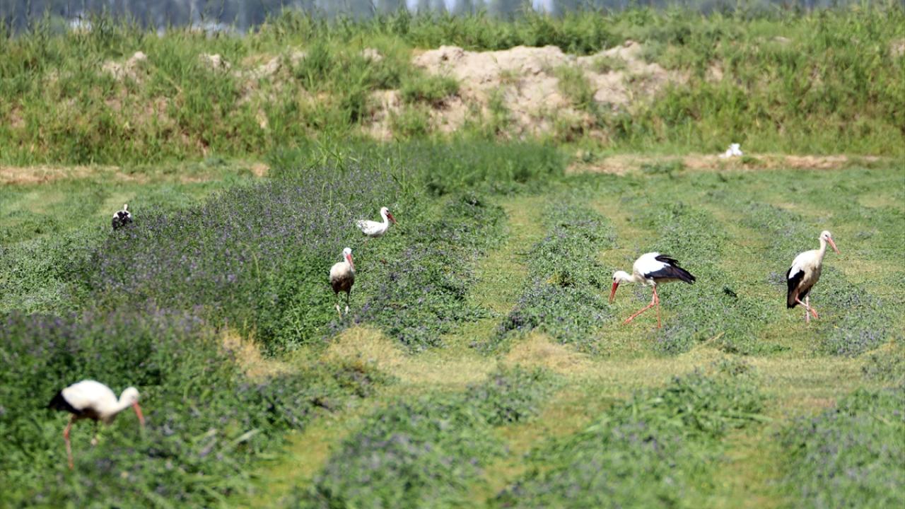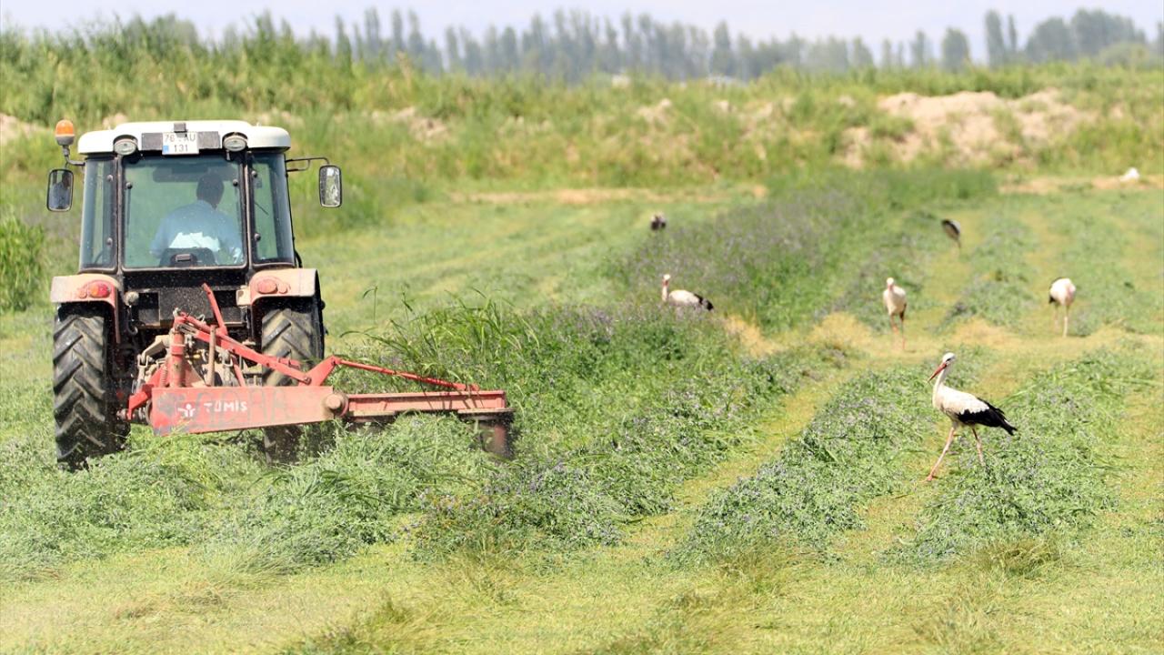 Iğdır'da, çiftçilerin tarlalardaki hasat mesaisi sürüyor. Yoncaları tarım makineleriyle toplayan çiftçilerin bahçelerine konuk olan leylekler de tarlalarda gezinerek, kemirgen ve böcekleri avlıyor.