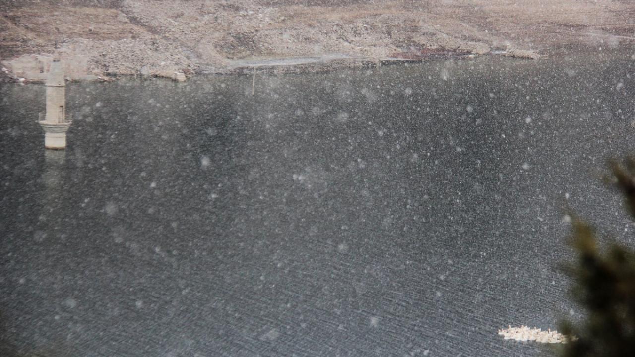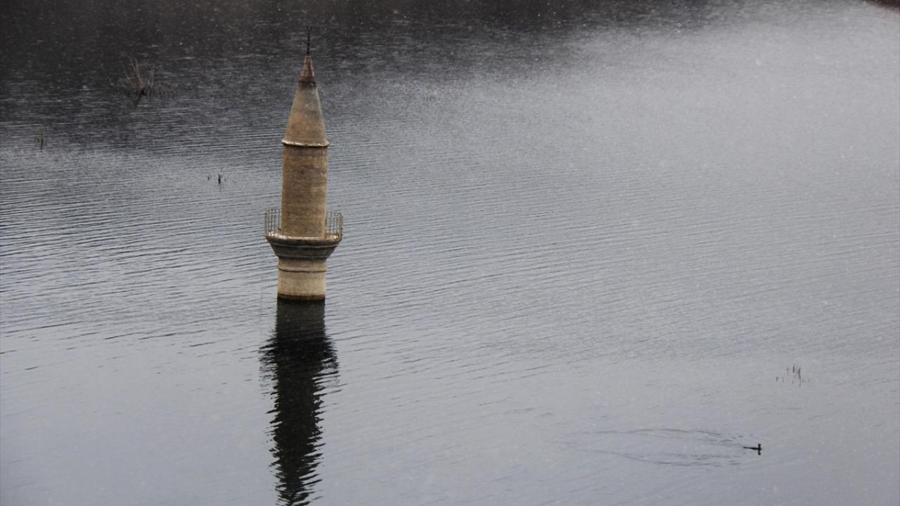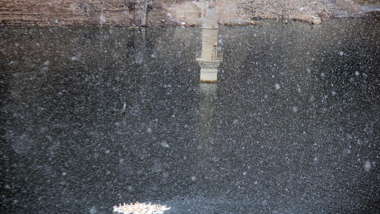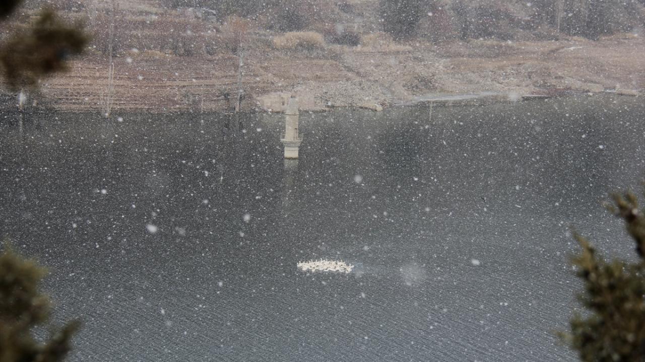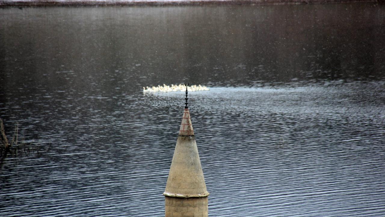 Su altında kalan eski yerleşim yerine ait caminin minaresinin göründüğü baraj gölüne kazların, kar yağışı eşliğindeki gezintisi, güzel görüntü oluşturdu.