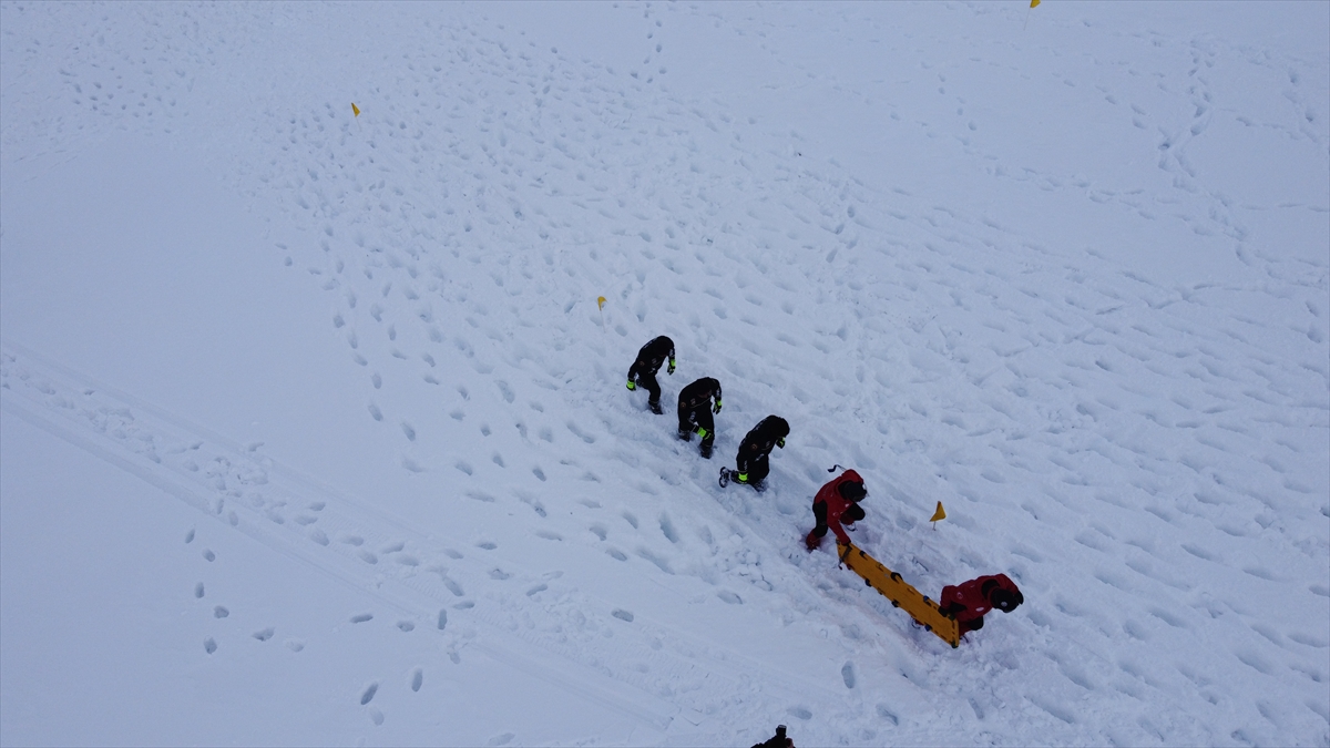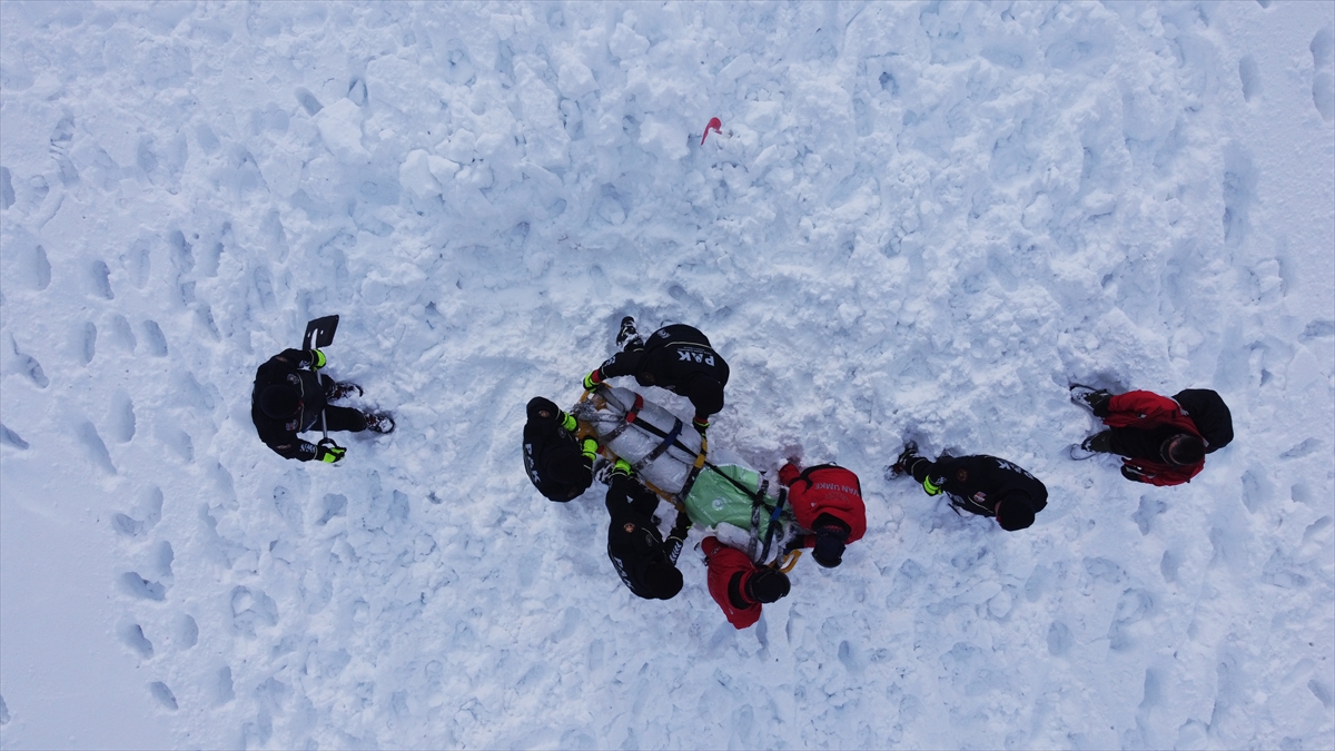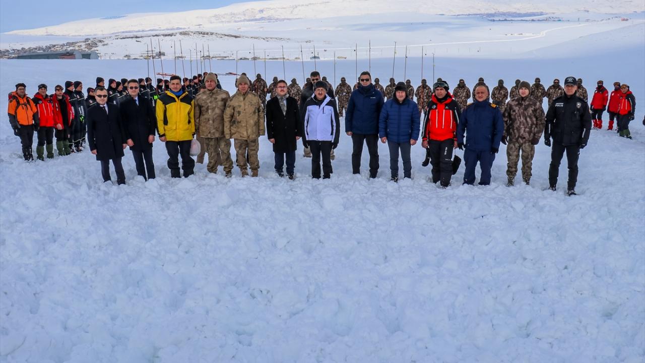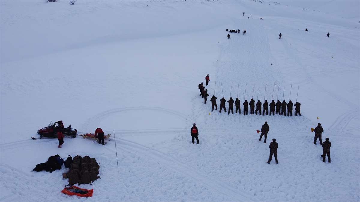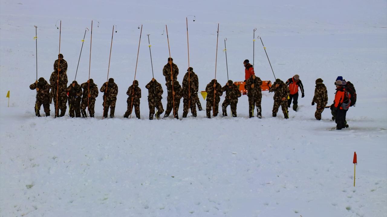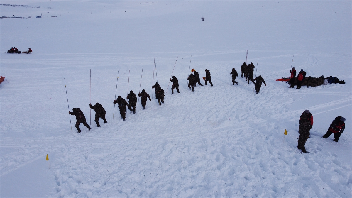 Senaryo gereği 4 avcının kar altında kaldığı ihbarı alan ekipler, kısa sürede çığın düştüğü bölgeye ulaşarak sonda çubuklarıyla arama kurtarma çalışması başlattı.
