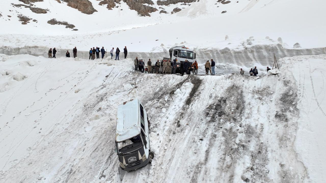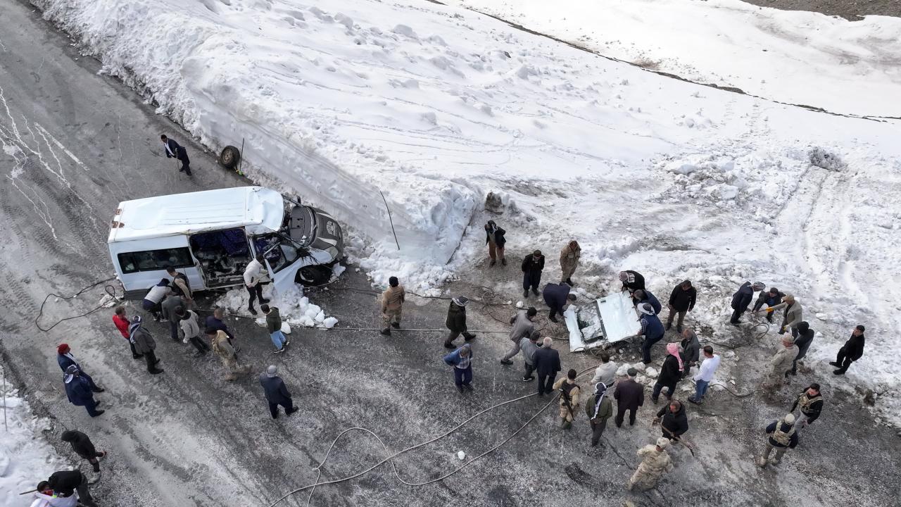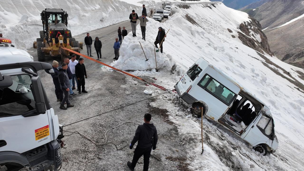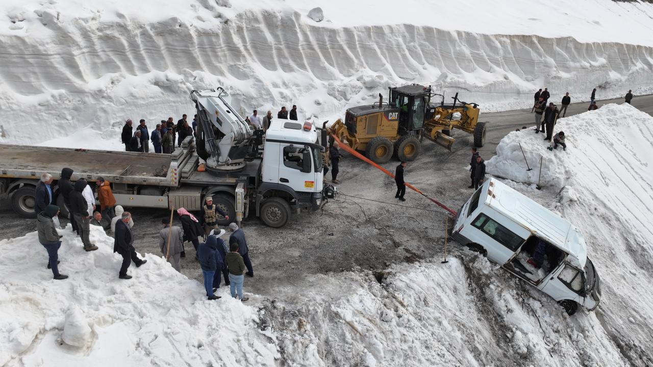 Van-Bahçesaray kara yoluna düşen çığda şarampole sürüklenen minibüs, vinç ve iş makinesine bağlanan halatlarla 8 saatlik çalışma sonucu bulunduğu yerden çekilerek yola çıkarıldı.