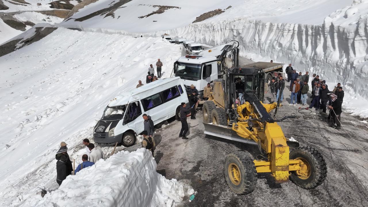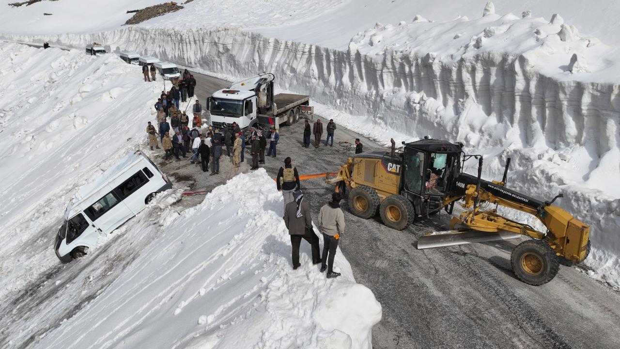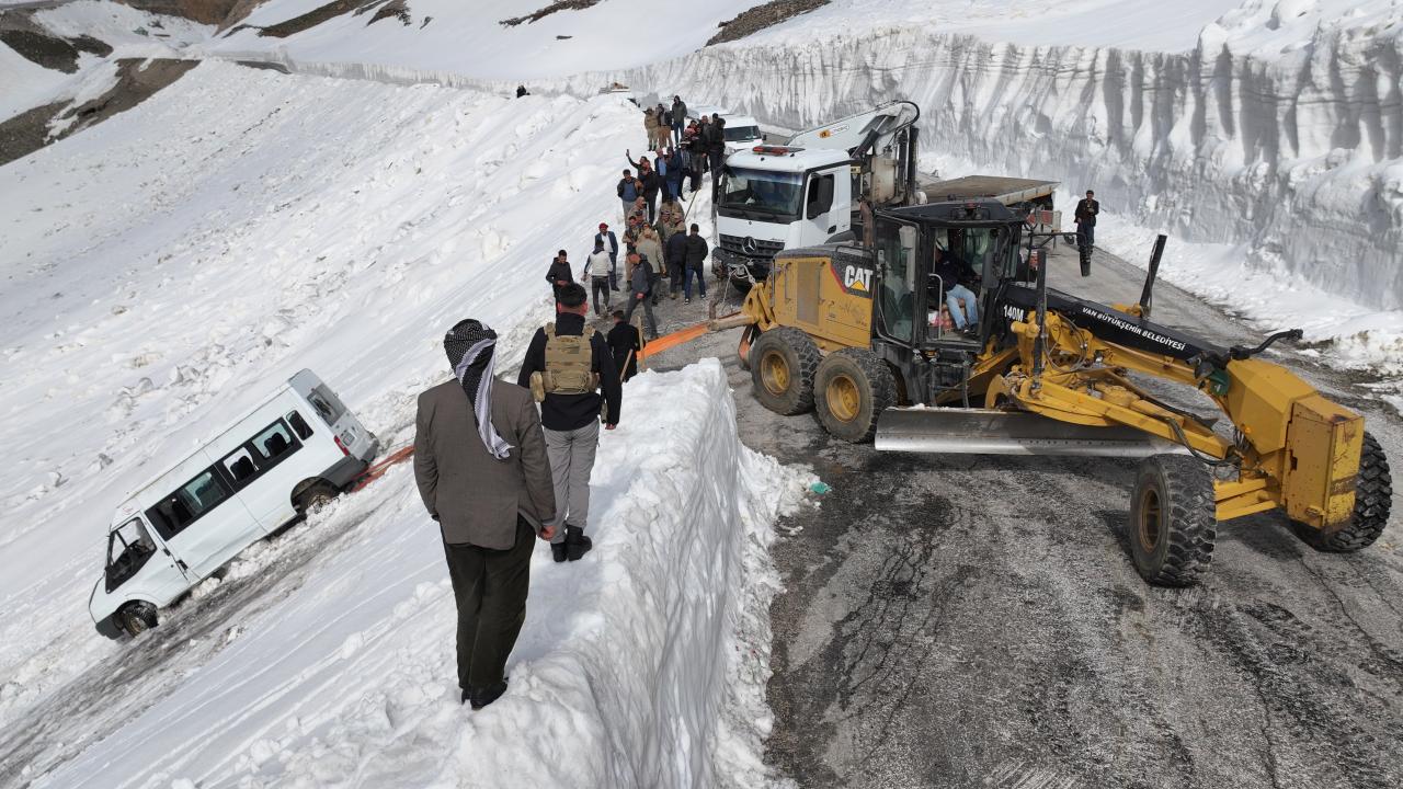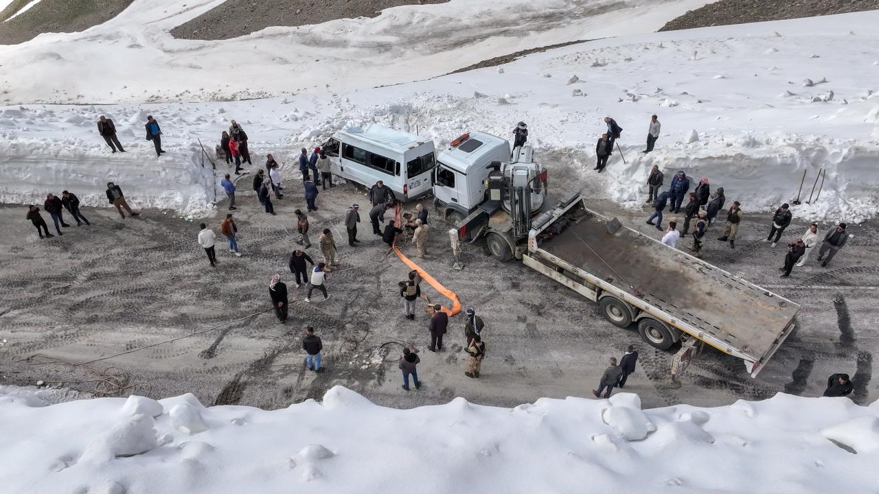 Van-Bahçesaray kara yoluna düşen çığda şarampole sürüklenen minibüs, vinç ve iş makinesine bağlanan halatlarla 8 saatlik çalışma sonucu bulunduğu yerden çekilerek yola çıkarıldı.