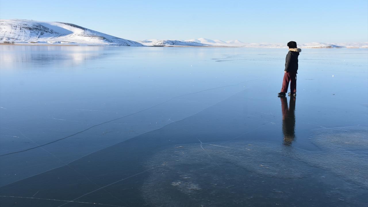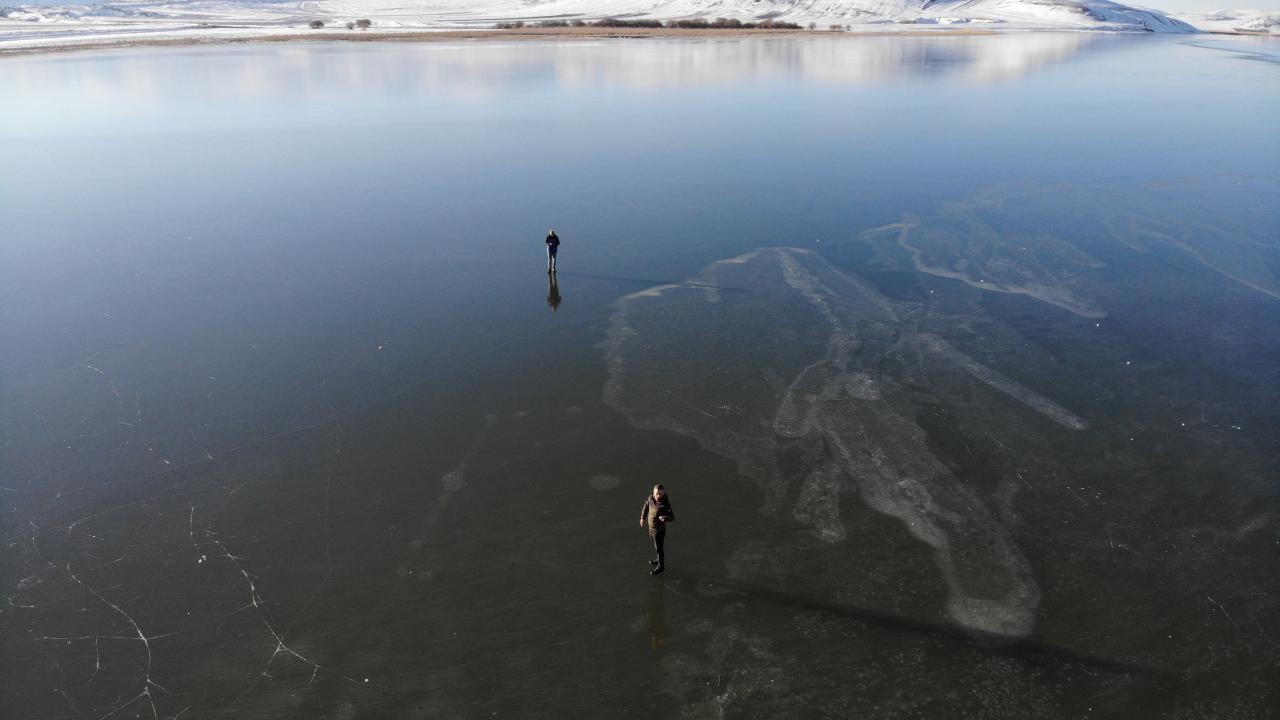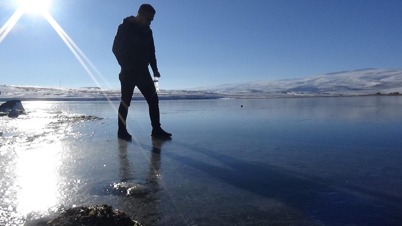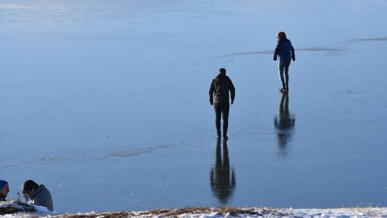 Kars'ta son günlerde etkili olan soğuk hava, Çıldır Gölü'nün bir kısmını dondurdu. Vatandaşlar buz tutan gölün üzerinde yürüdü, fotoğraf çekti.