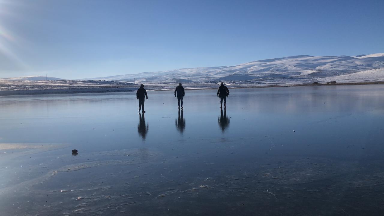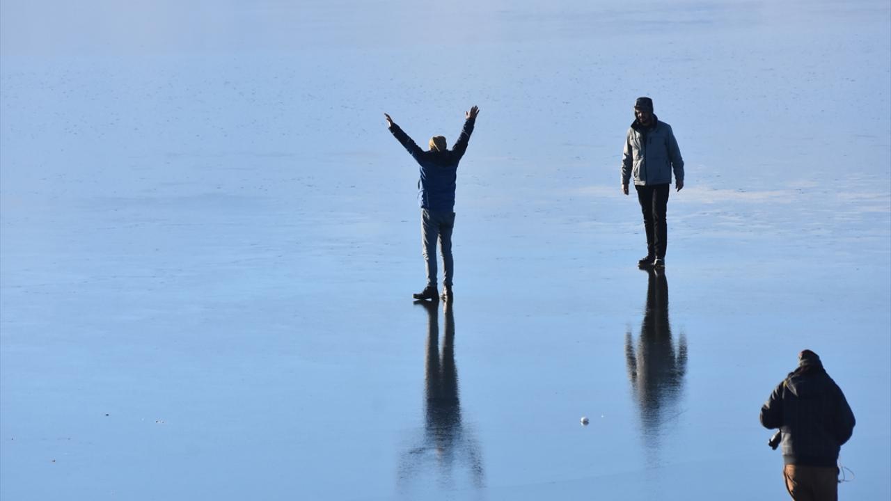 Gölün buz tutan yüzeyinde yürüyen insanlar, doyasıya eğlenirken, bazı vatandaşlar ise bol bol fotoğraf çekti.