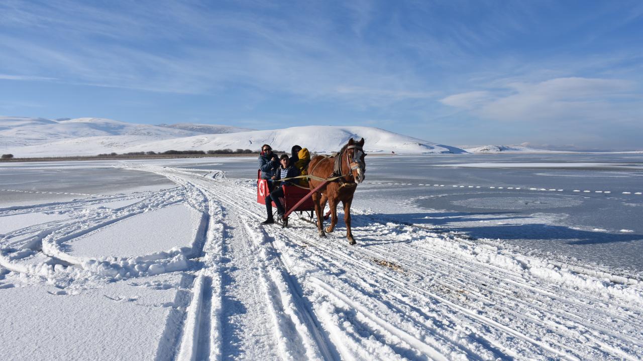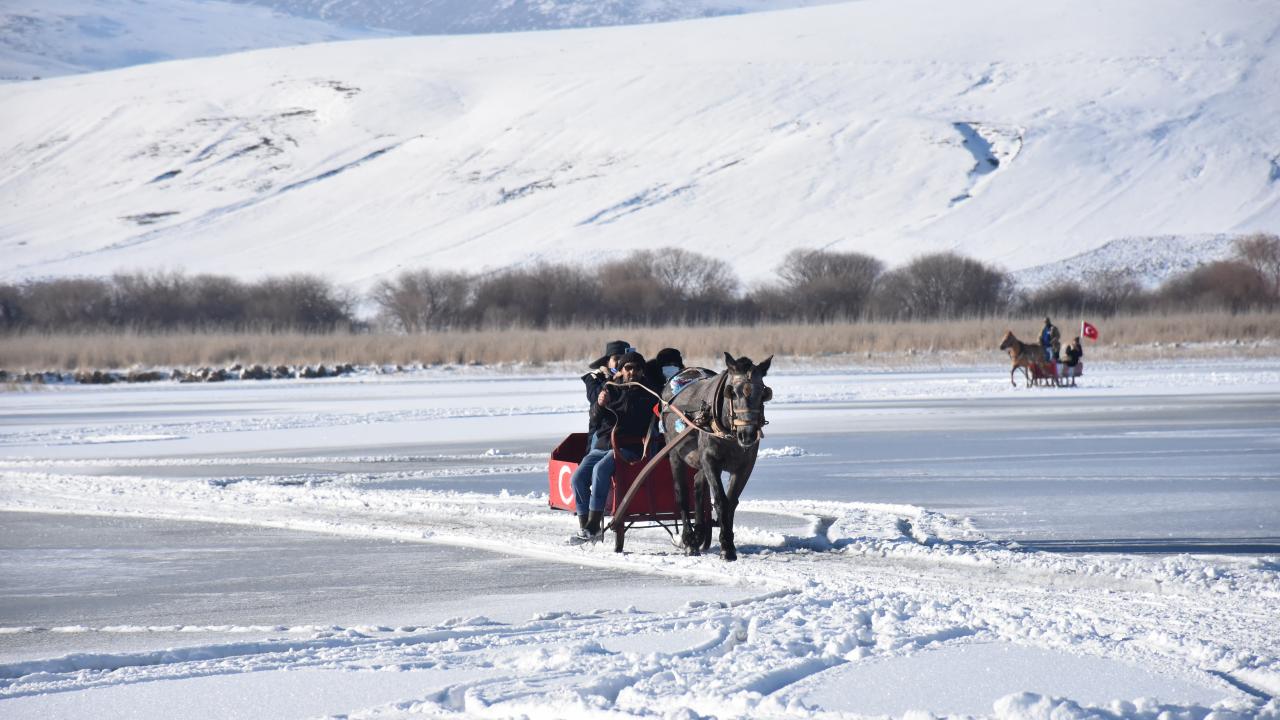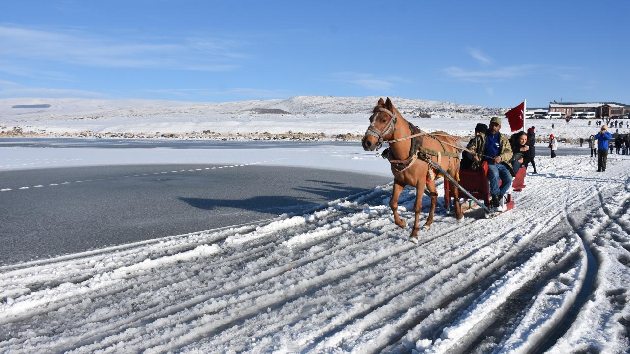 Atlı kızak ve kar motorlarıyla gölde gezinti yapan ziyaretçiler doyasıya eğlendi.