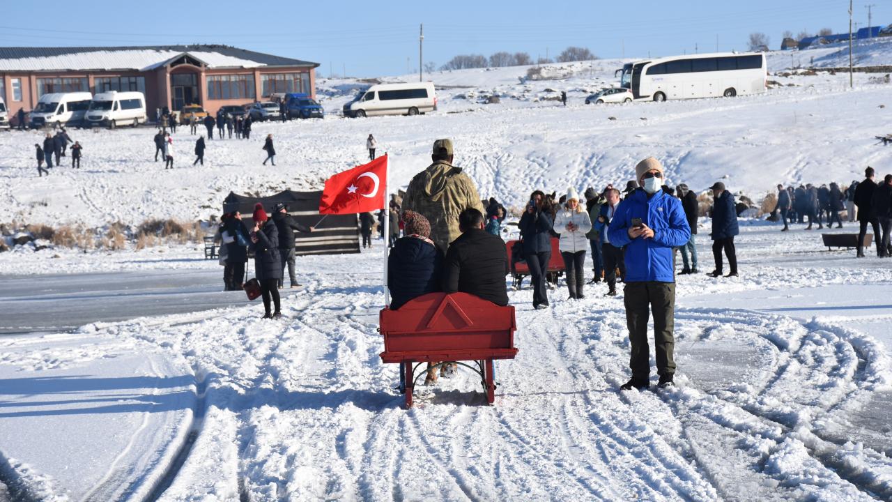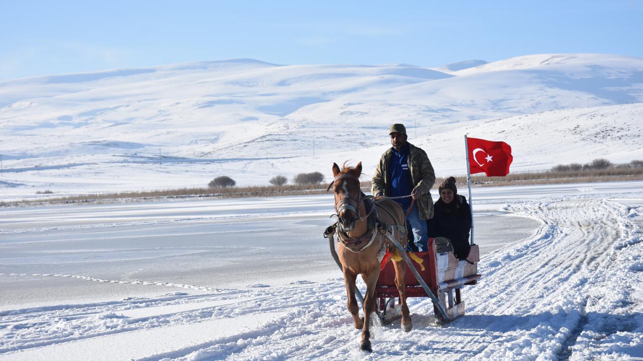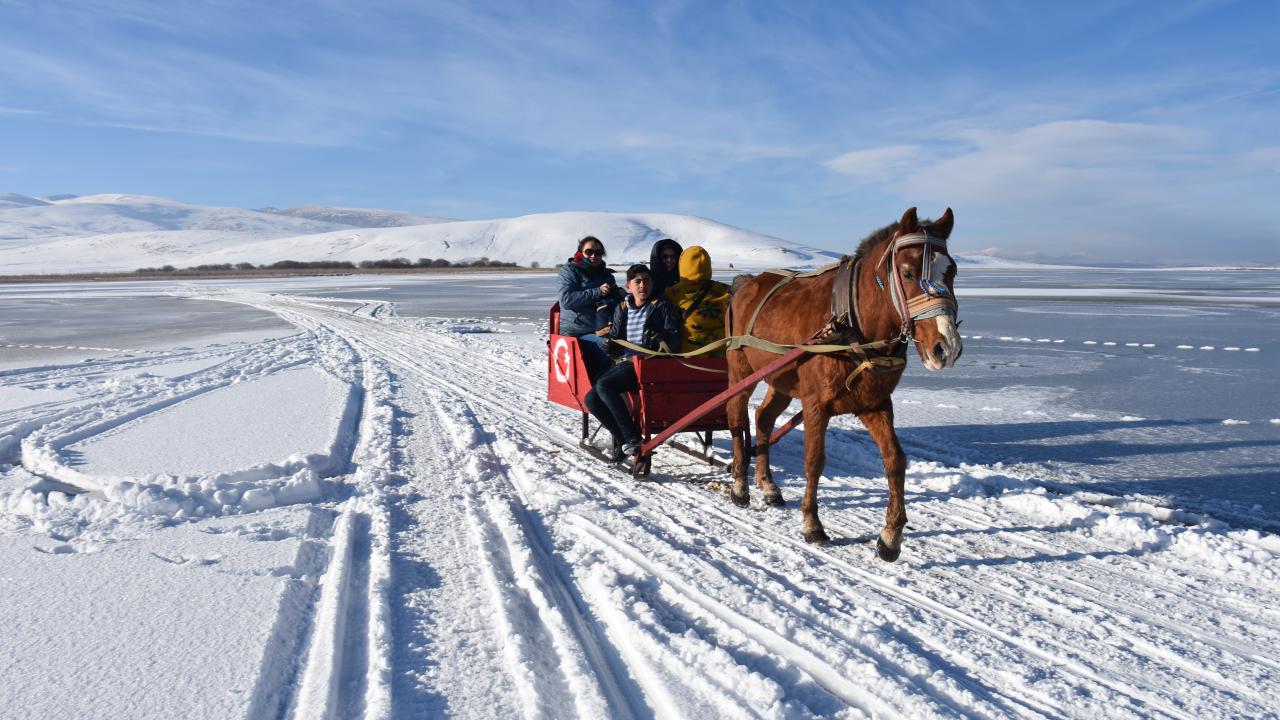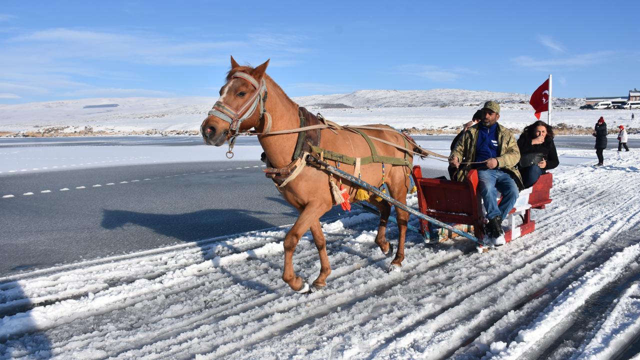Atlı kızak ve kar motorlarıyla gölde gezinti yapan ziyaretçiler doyasıya eğlendi.