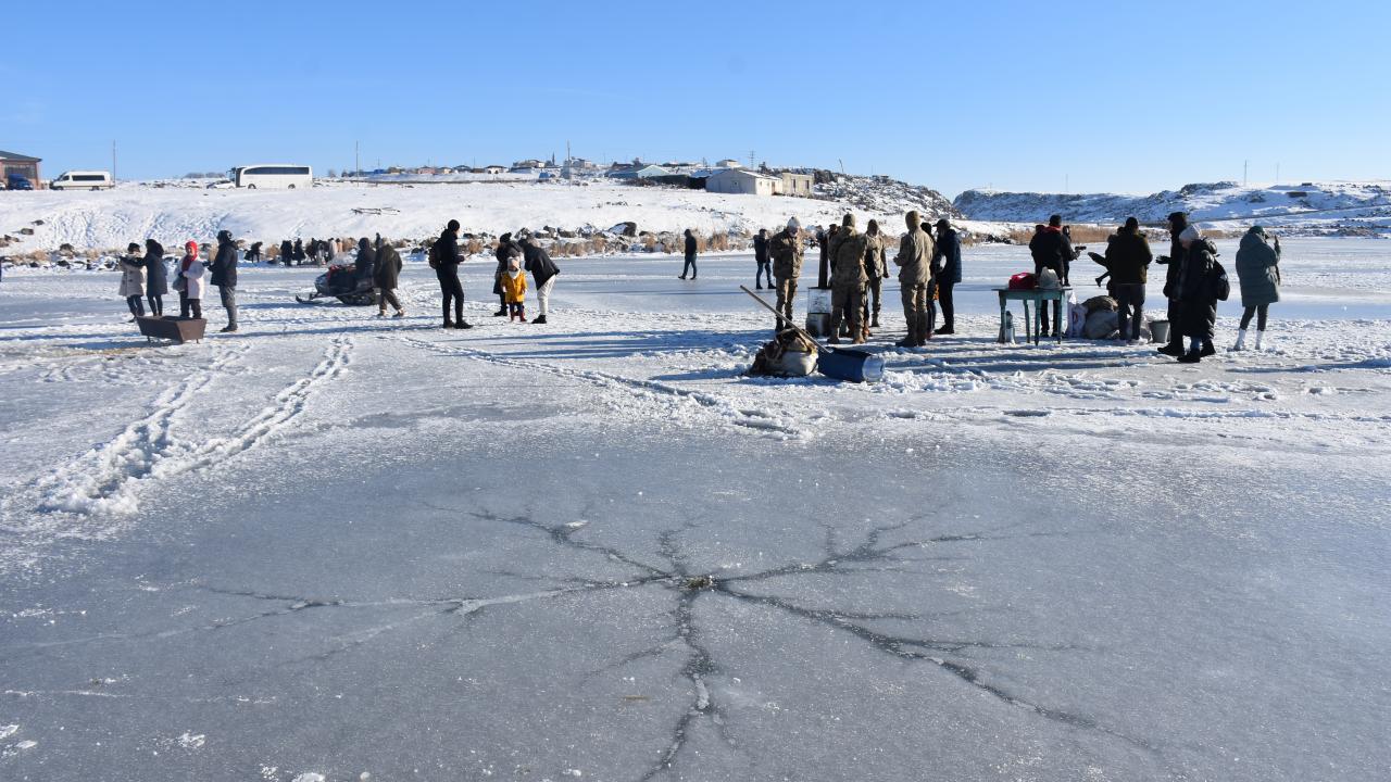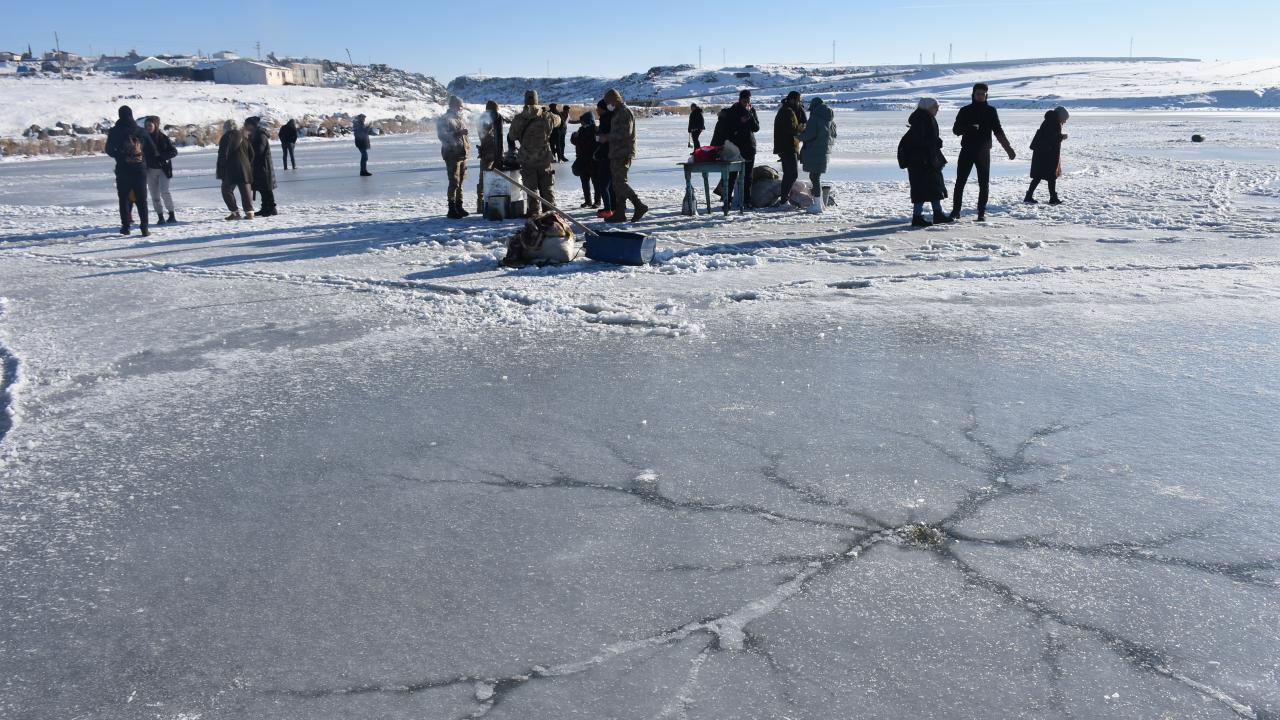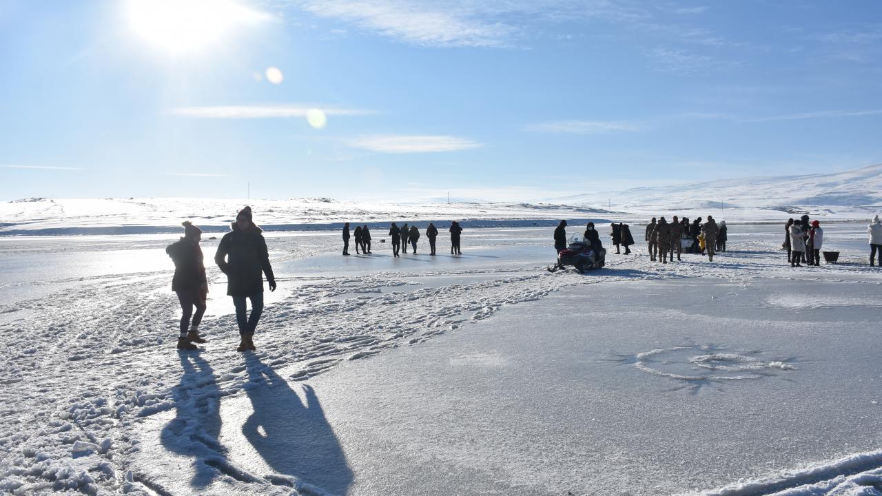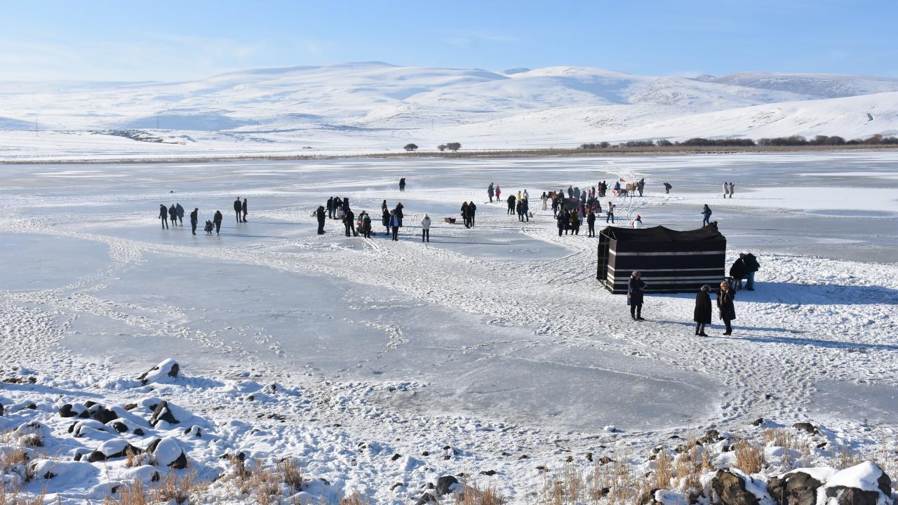 Kış mevsiminde yüzeyi tamamen buzla kaplanan Kars-Ardahan sınırındaki gölün Arpaçay ilçesine bağlı Taşbaşı köyü mevkisi dondu.