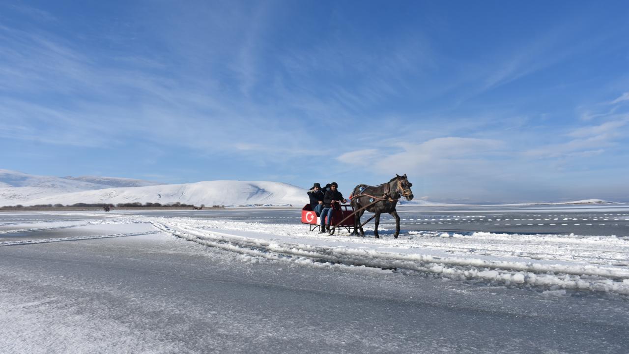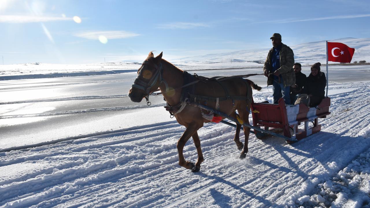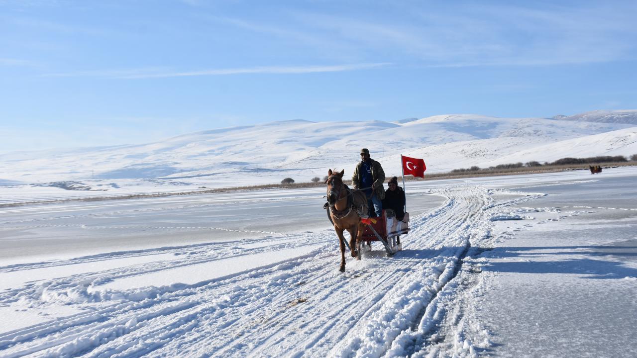 Atlı kızakçı Ertan Daşdemir, Çıldır Gölü`nde ilk olarak Kars`ın Arpaçay ilçesine bağlı Taşbaşı köyü mevkisinin donduğunu belirtti.