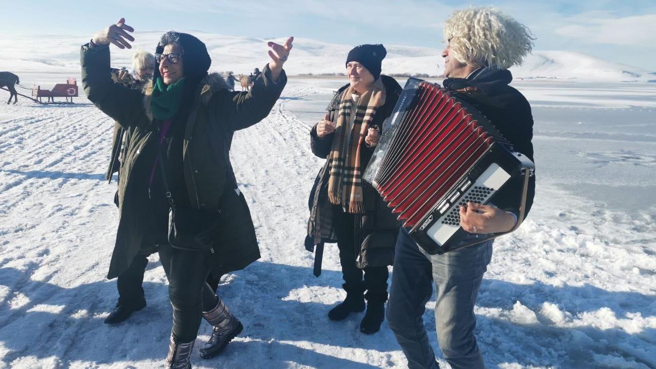 Hafta sonunu fırsat bilen turistler, bir bölümü buzla kaplanan göl üzerinde müzik eşliğinde halay çekti, dans etti.