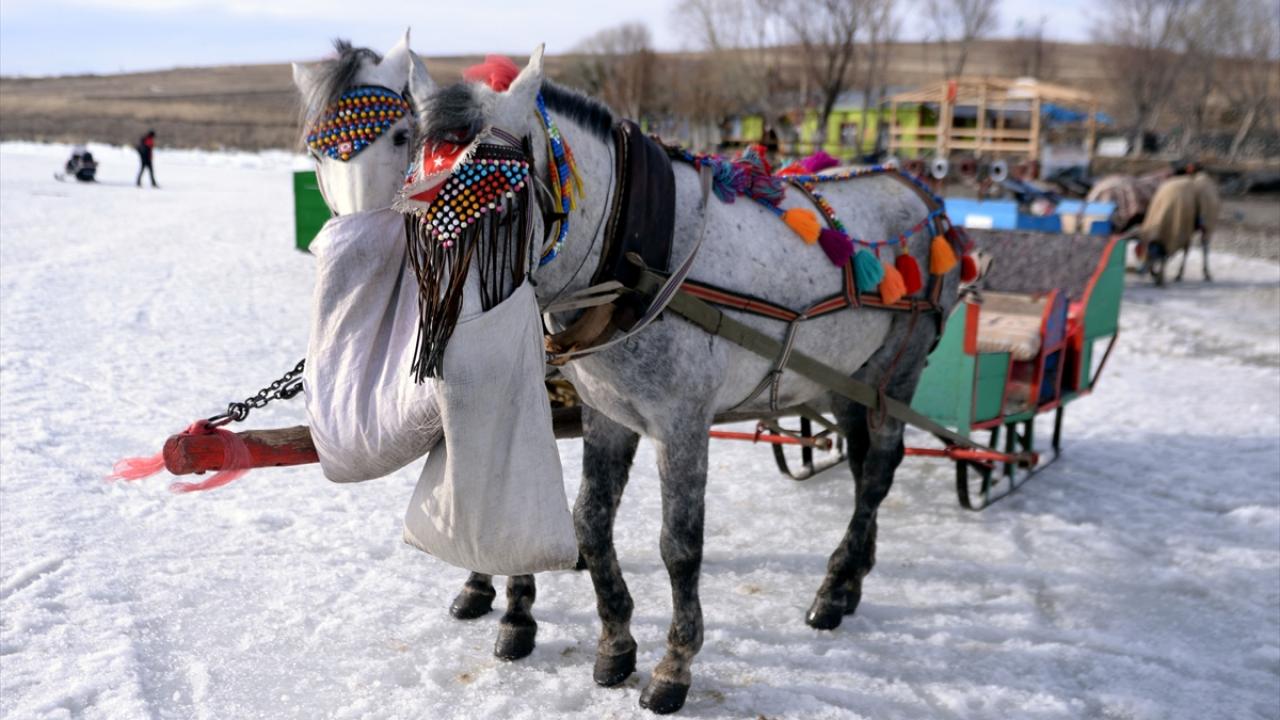 Gölün Ardahan kesiminde buz kalınlığının 25-30 santimetreye ulaşmasıyla atlı kızakçılar, göl üzerinde misafirlere gezinti yaptırıyor.