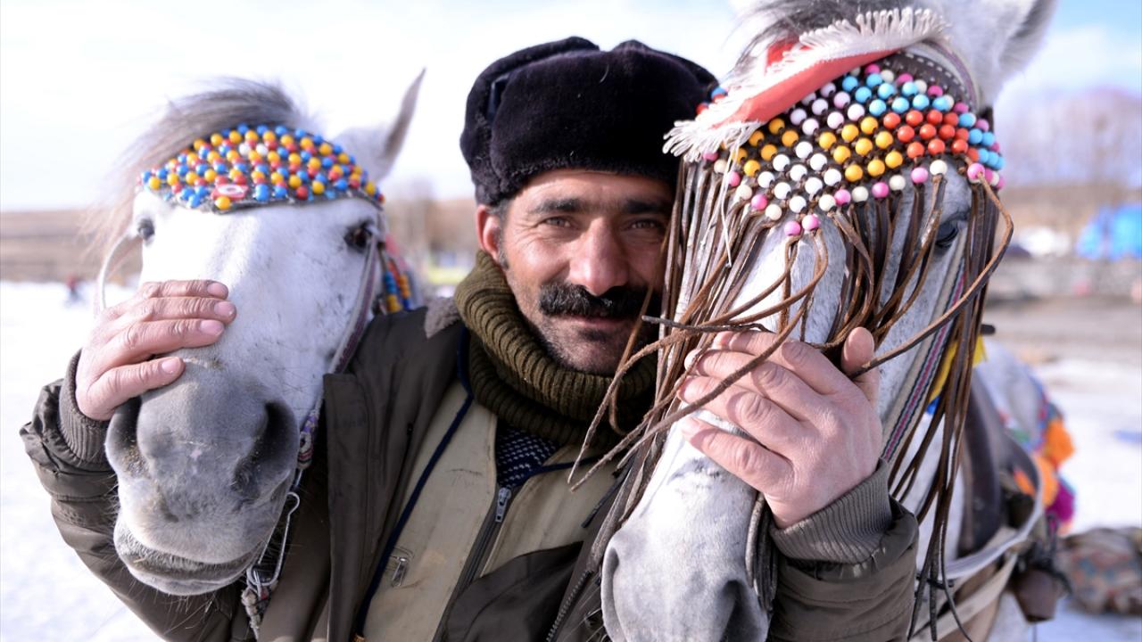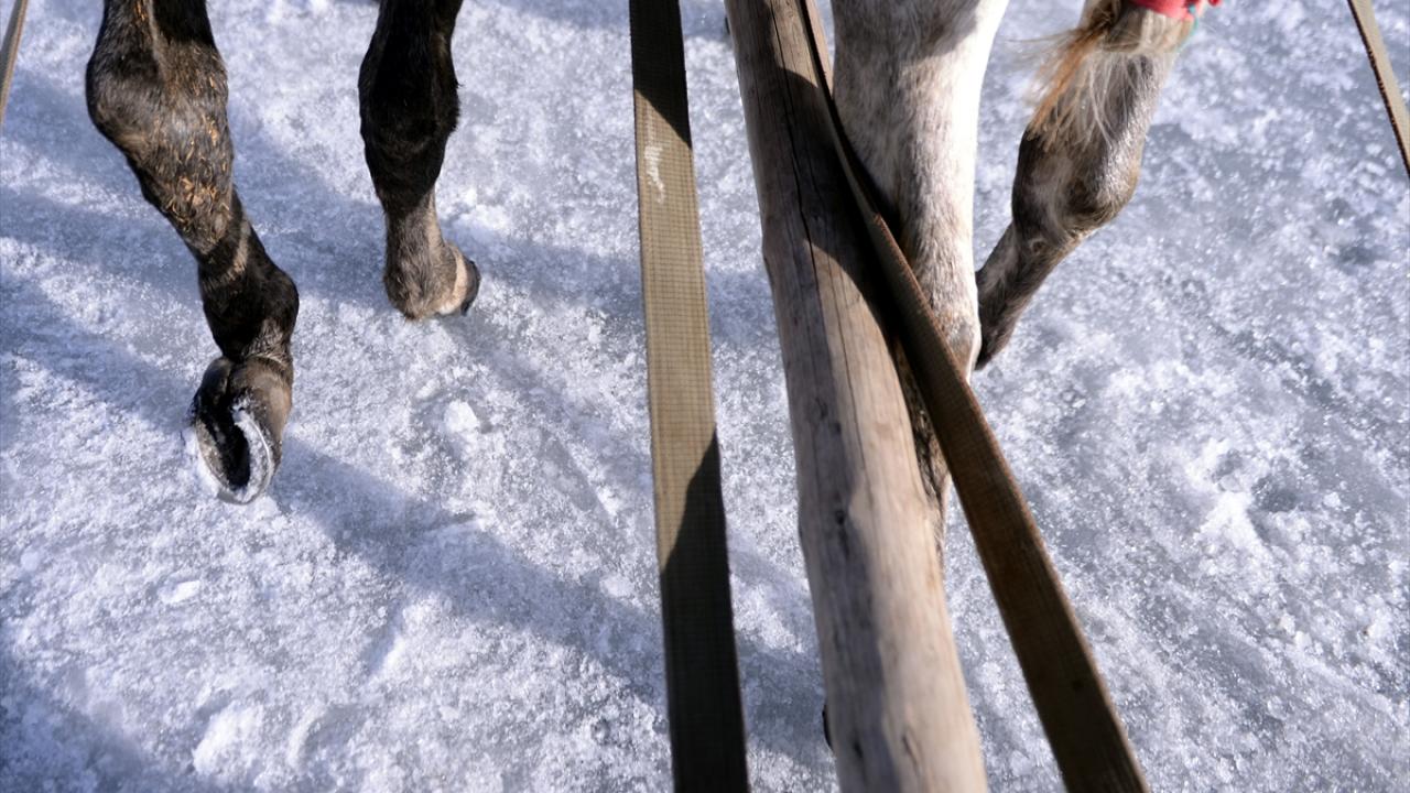 Kışın soğukların etkisiyle yüzeyi tamamen buzla kaplanan Çıldır Gölü üzerinde hizmet veren atlı kızakçılar, atların ayaklarına buzda kaymaması için taktıkları çivili nallar sayesinde misafirlerine konforlu yolculuk yaptırıyor.