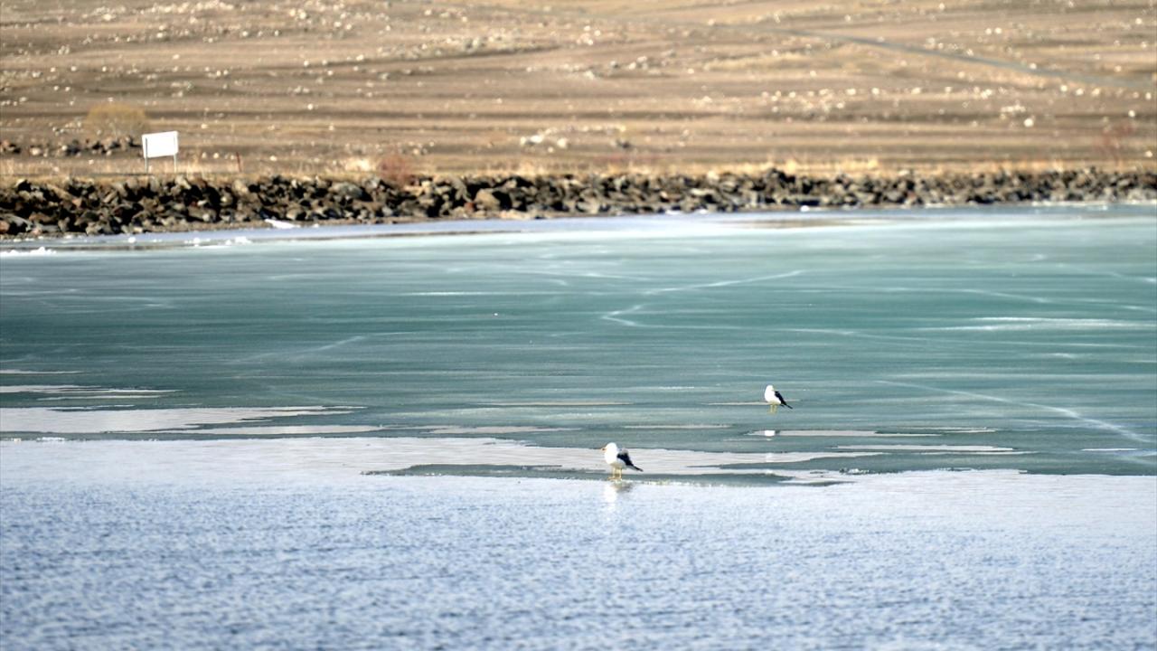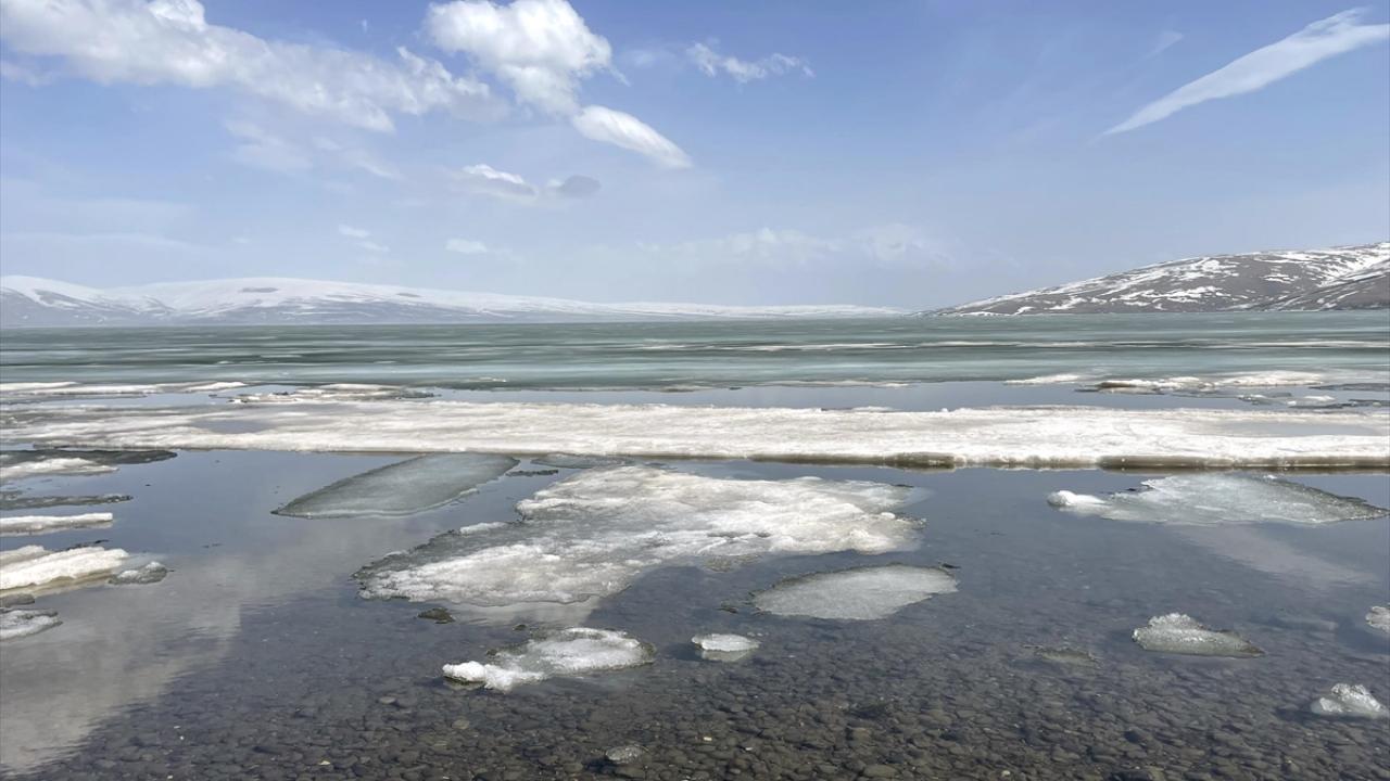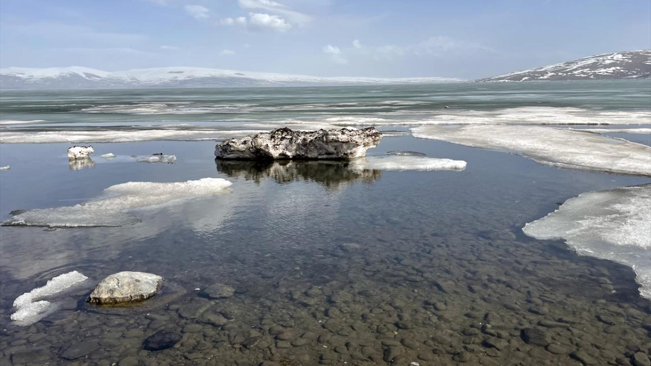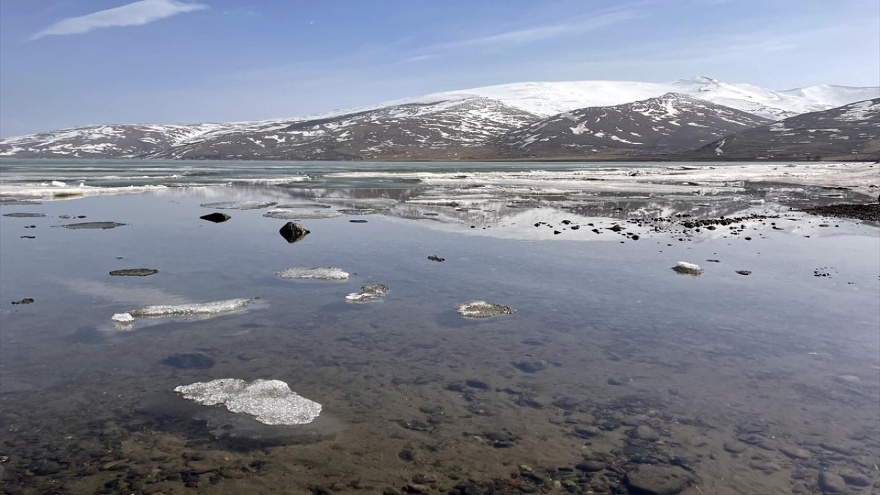 Ardahan-Kars sınırındaki Çıldır Gölü'nün yüzeyini kaplayan buz tabakası, sıcak havanın etkisiyle erimeye başladı.