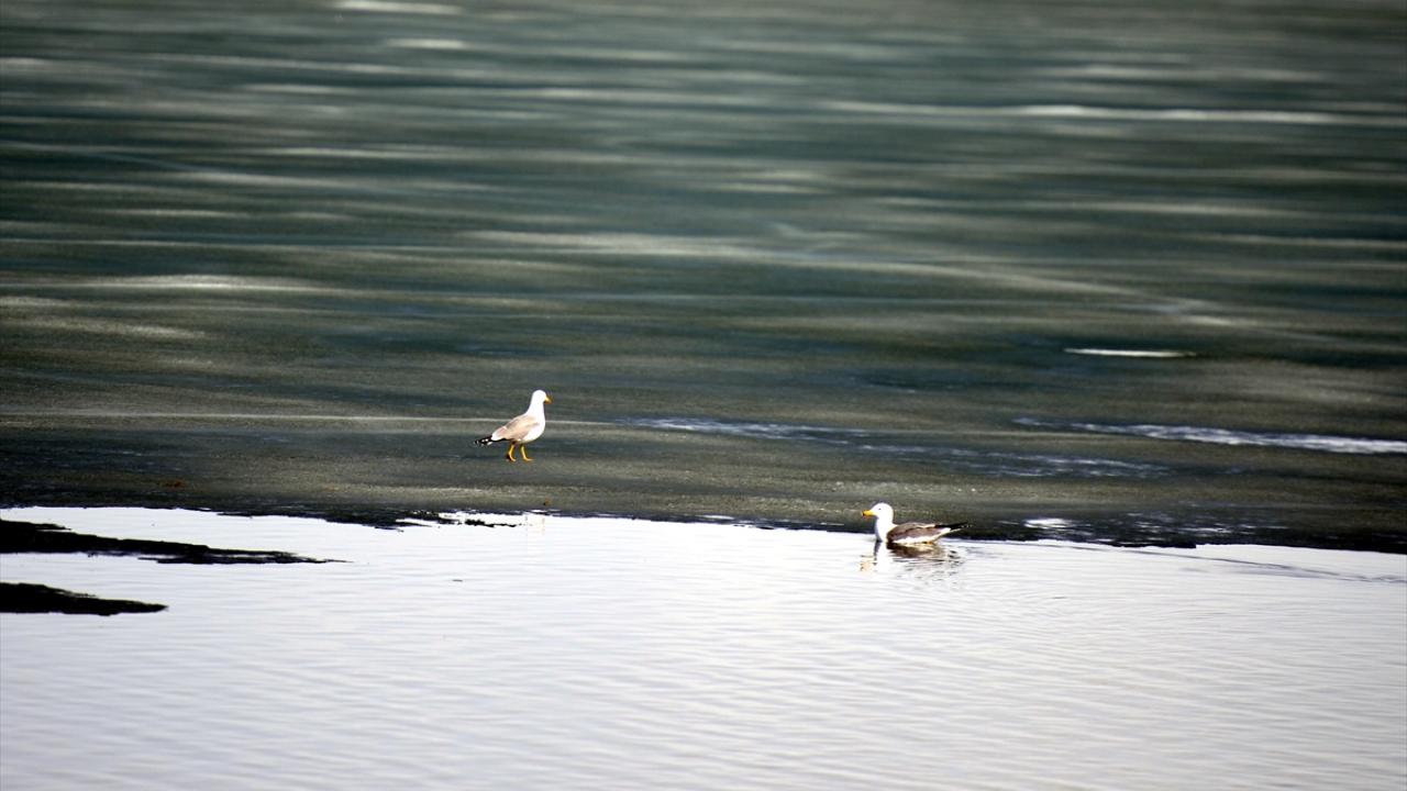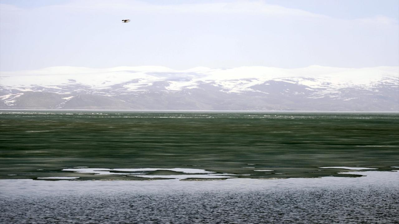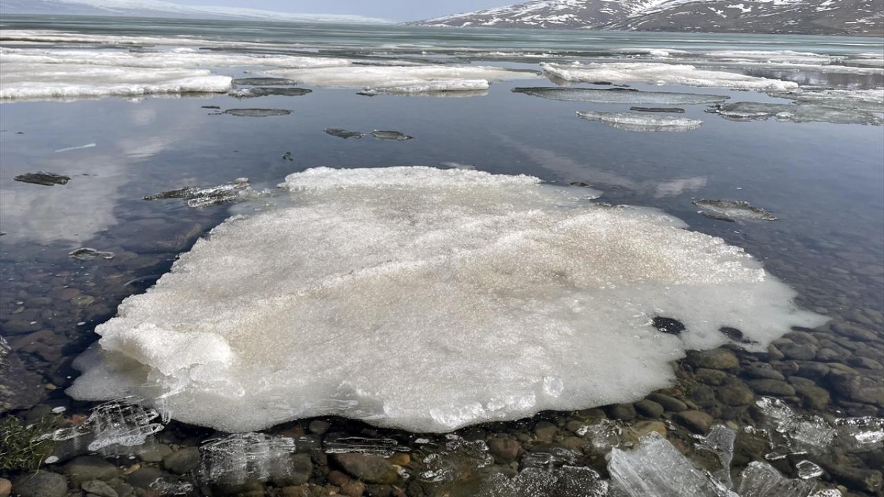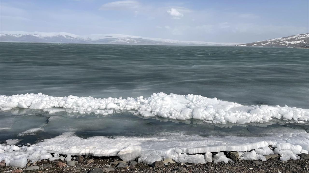 Ardahan-Kars sınırındaki Çıldır Gölü'nün yüzeyini kaplayan buz tabakası, sıcak havanın etkisiyle erimeye başladı.