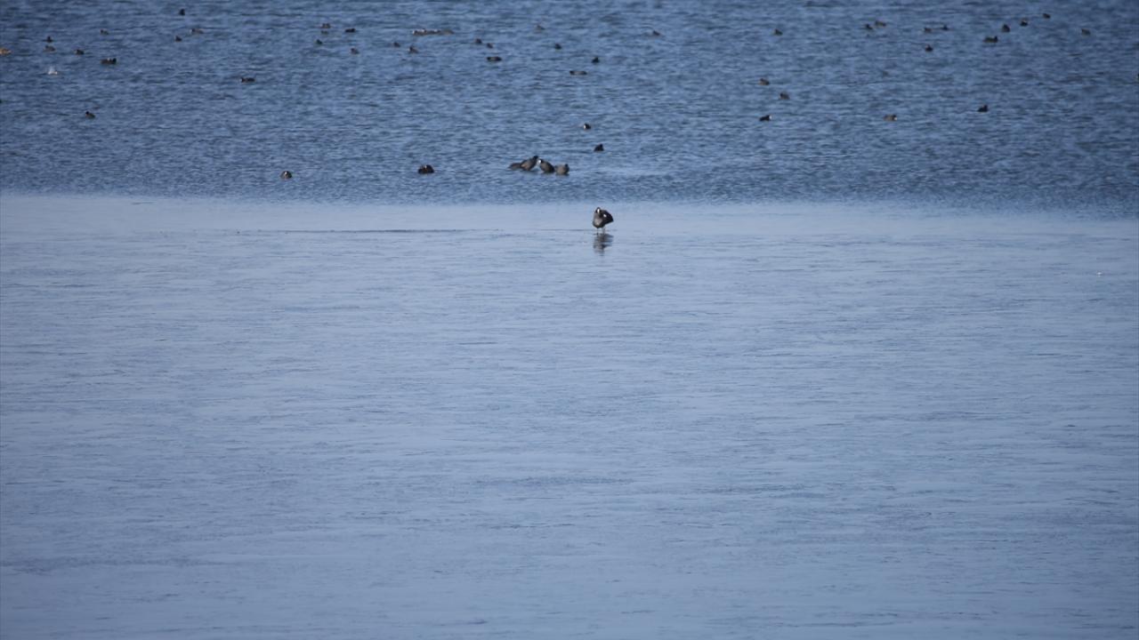 Kars-Ardahan sınırı arasında yer alan Çıldır Gölü`nün, Taşbaşı köyü mevkisindeki kenar kısımları dondu. Gölün donmayan bölümlerinde ise ördek ve sakarmeke kuşları yiyecek aradı.