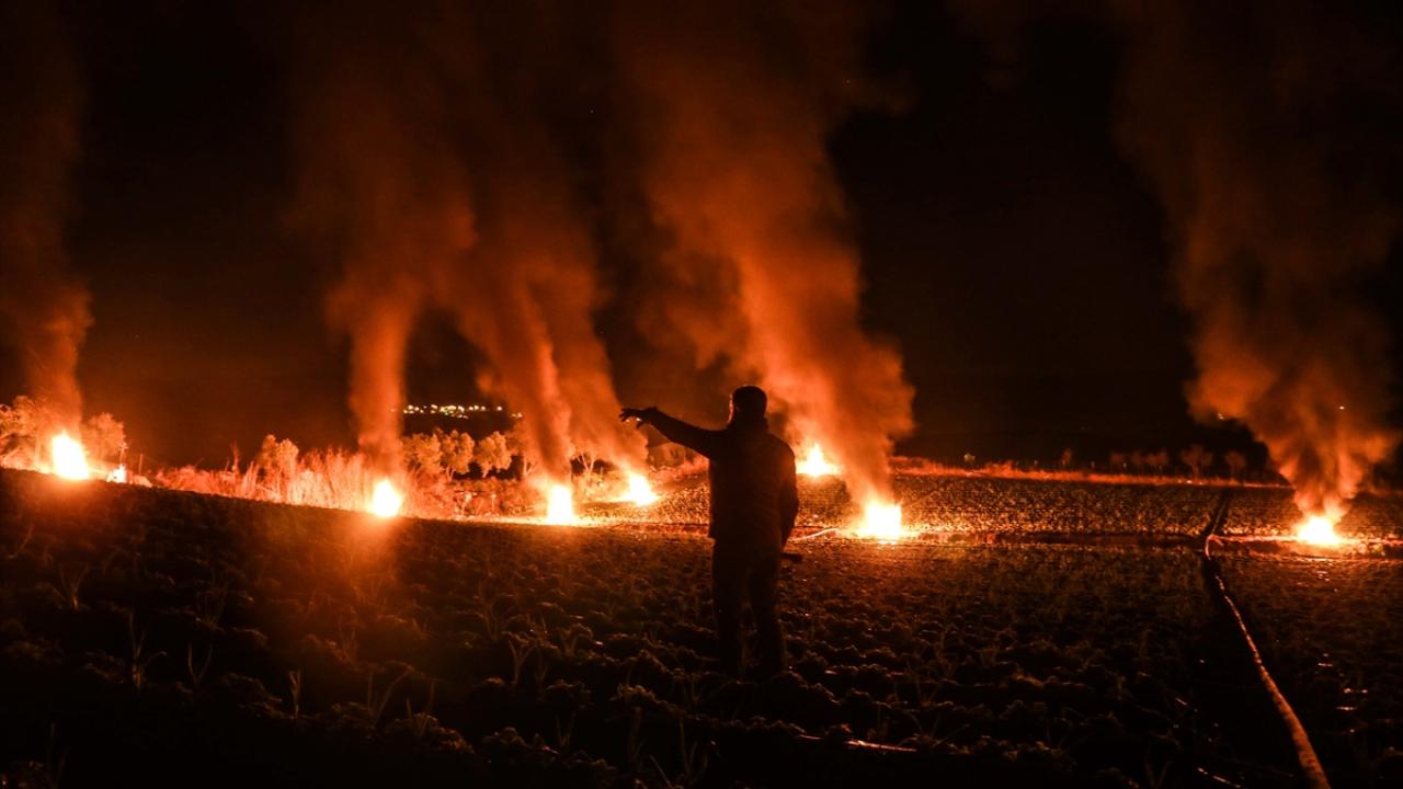 Burada eski araç lastiği veya odun yakan üreticiler, bahçeye yayılan dumanla ürünlerini dondan korumaya çalışıyor.