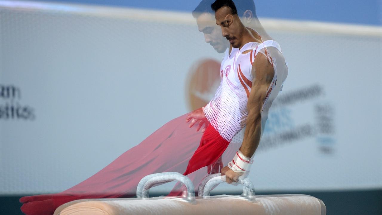 Milli sporcu Abdelrahman Elgamal, kulplu beygir aletinde performans sergiledi.