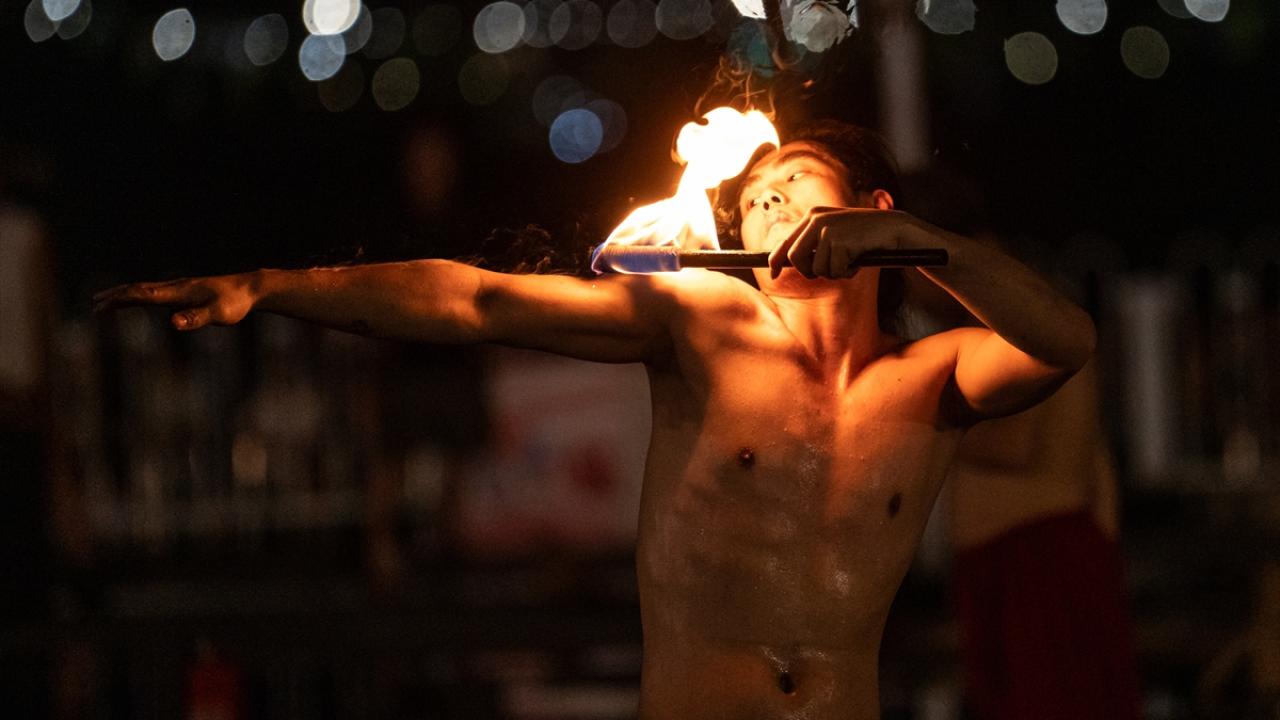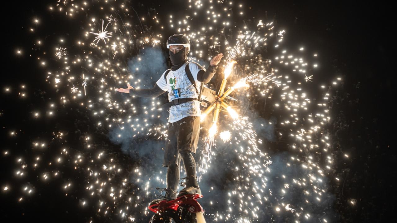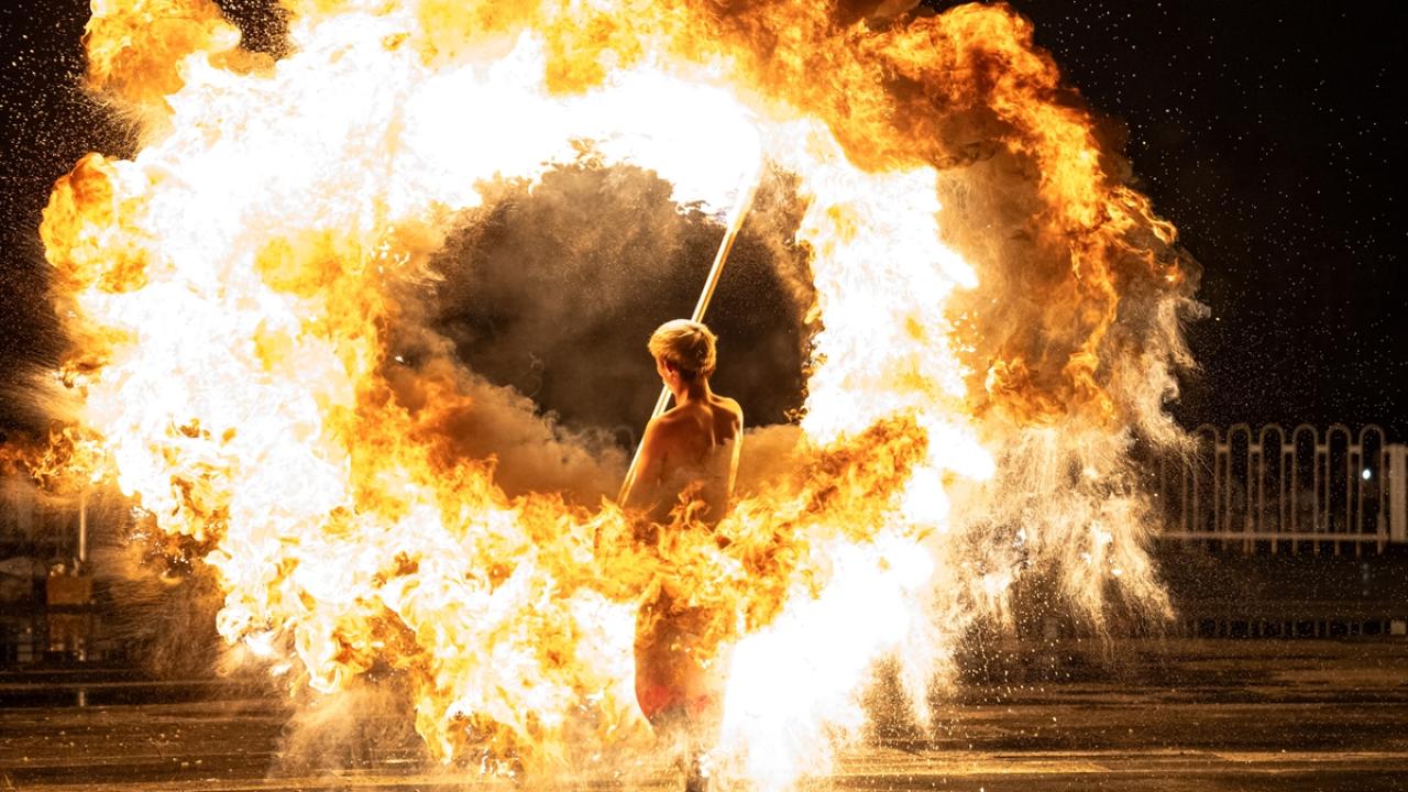 Renkli görüntülere sahne olan gösteride, dansçılar ateş dolu sopalarla performans sergiledi.