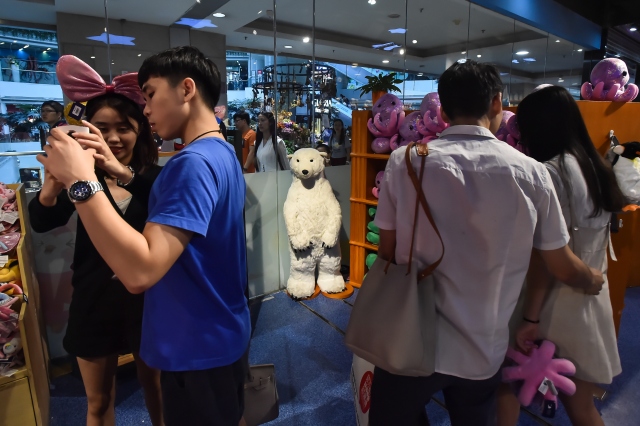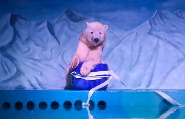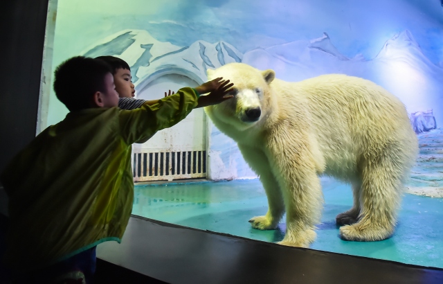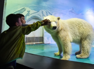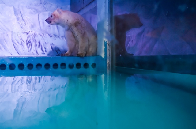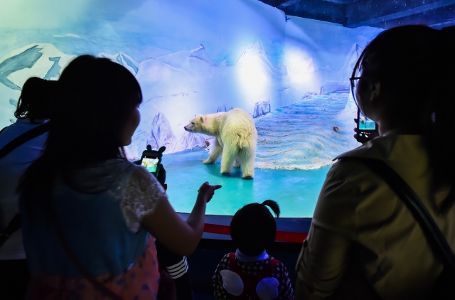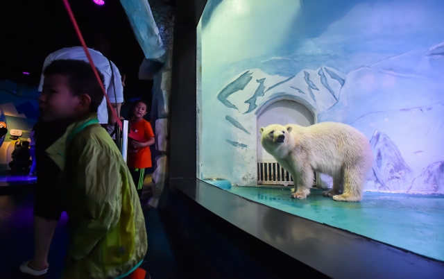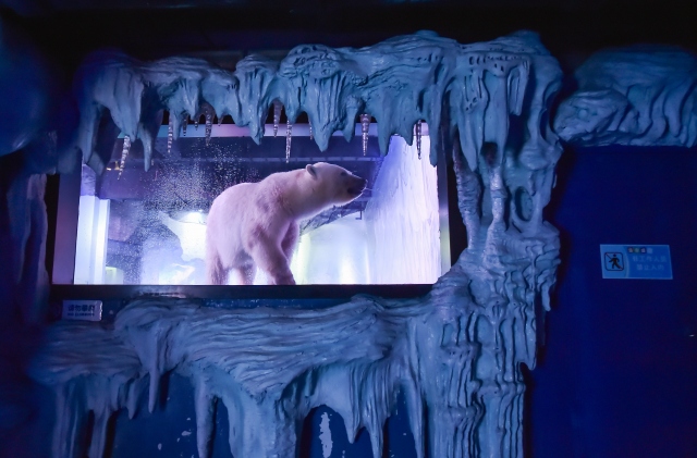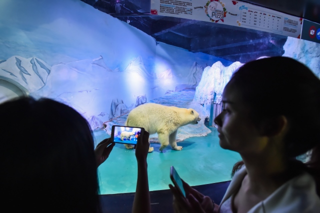 Çin'in Guangzhou kentinde hayvanseverlerin doğal ortamından uzaklaştırılıp, yalnız yaşatıldığı için tepki gösterdiği "Pizza" isimli kutup ayısı Grandview alışveriş merkezindeki akvaryumda ziyaretçilerin fotoğraf çekmesi için tutuluyor.