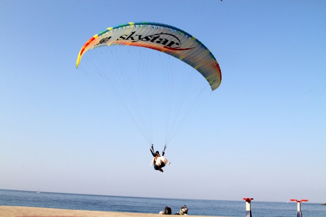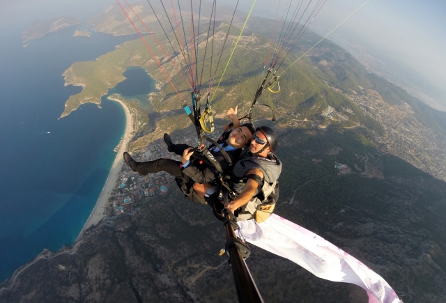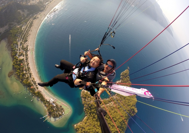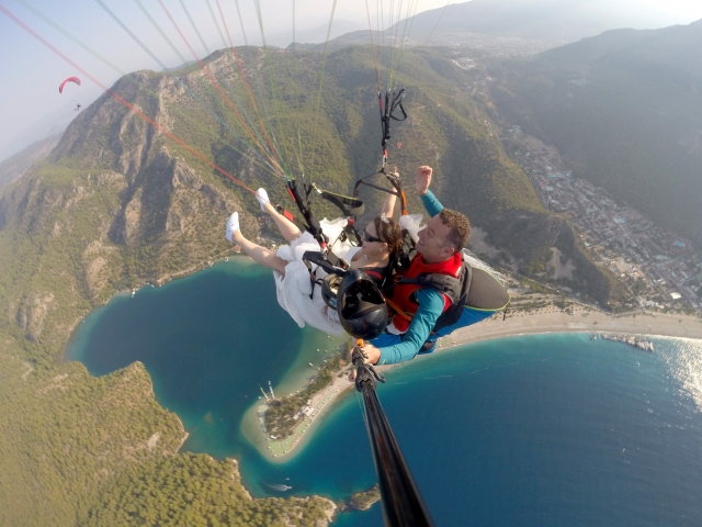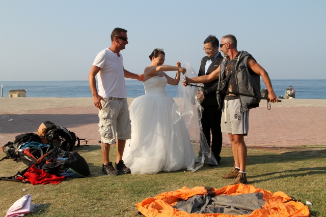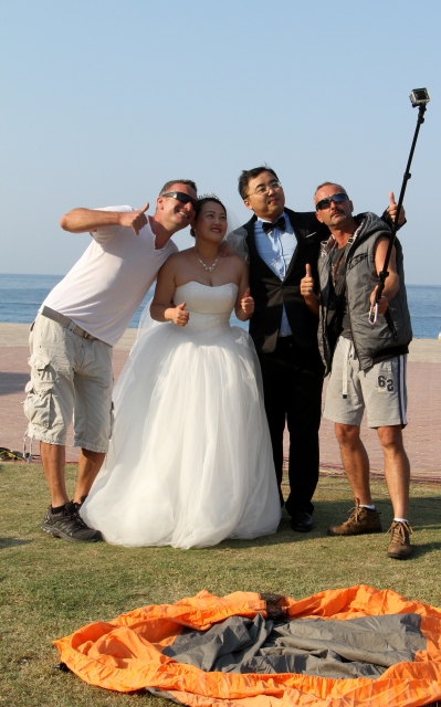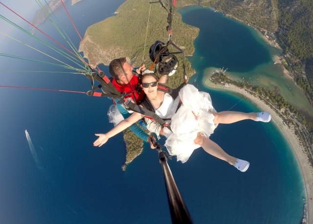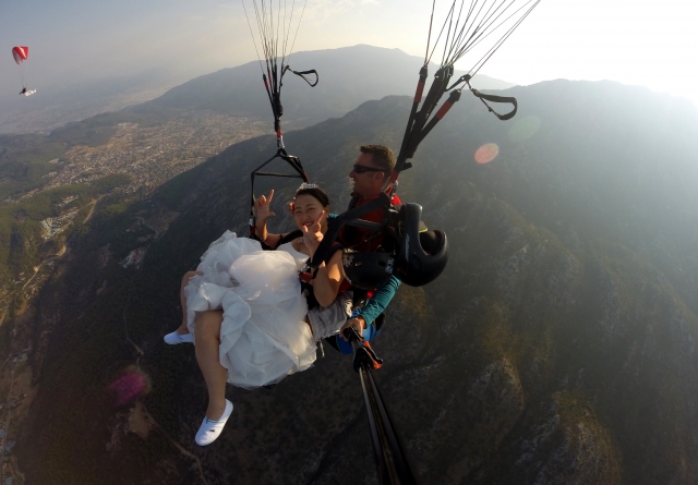 Çin'de evlendikten sonra tatil için Türkiye'ye gelen Hchao Shi ile Ywei Wang, gelinlik ve damatlıkla Fethiye ilçesindeki Babadağ'dan yamaç paraşütüyle uçuş yaptı.