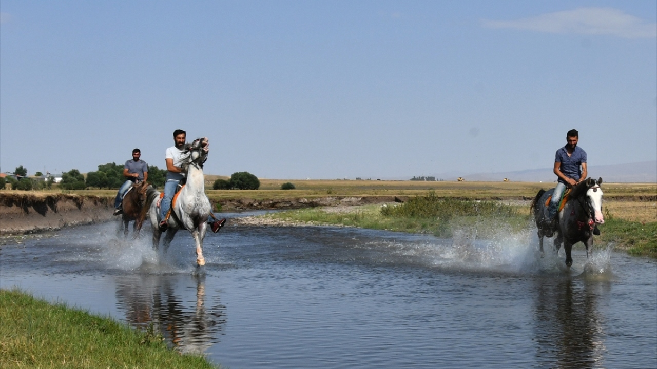 Hava sıcaklığının 30-35 derecelere yükseldiği Selim ilçesine bağlı Kekeç köyündeki cirit tutkunları, atlarını sıcak havalarda köy yakınındaki dereye her gün 3`erli gruplar halinde getiriyor.