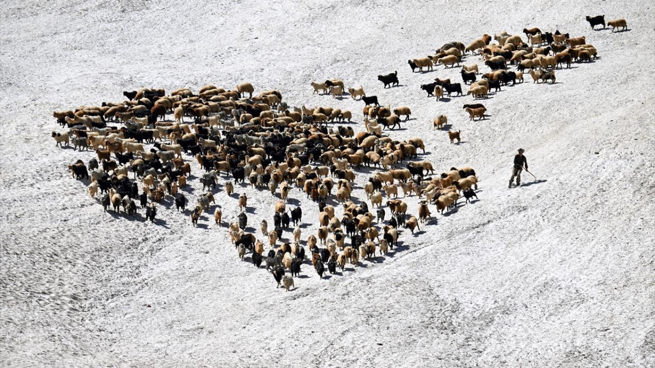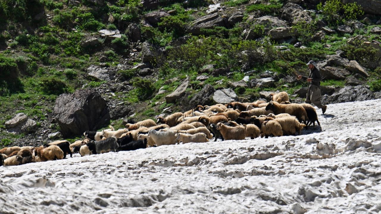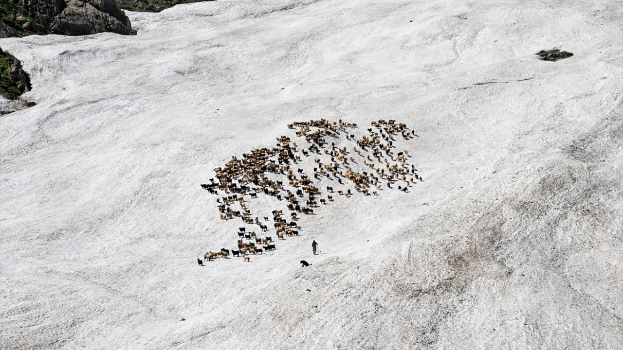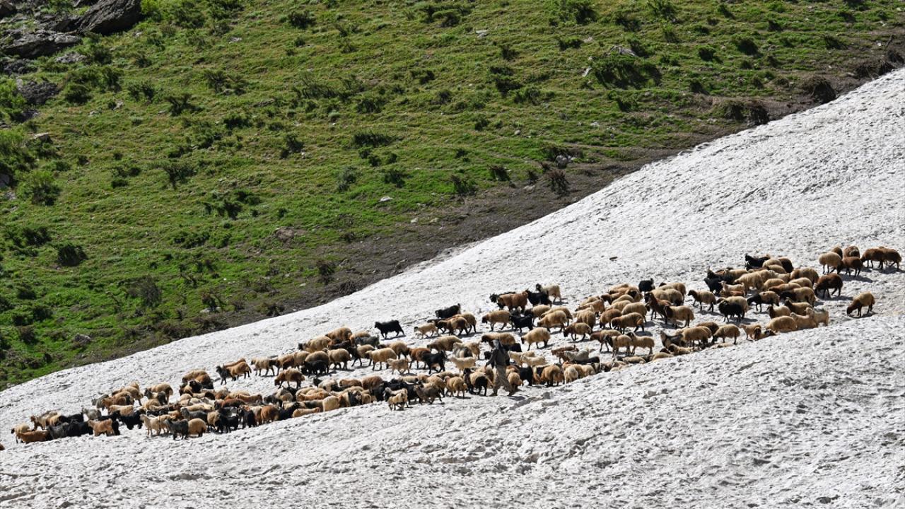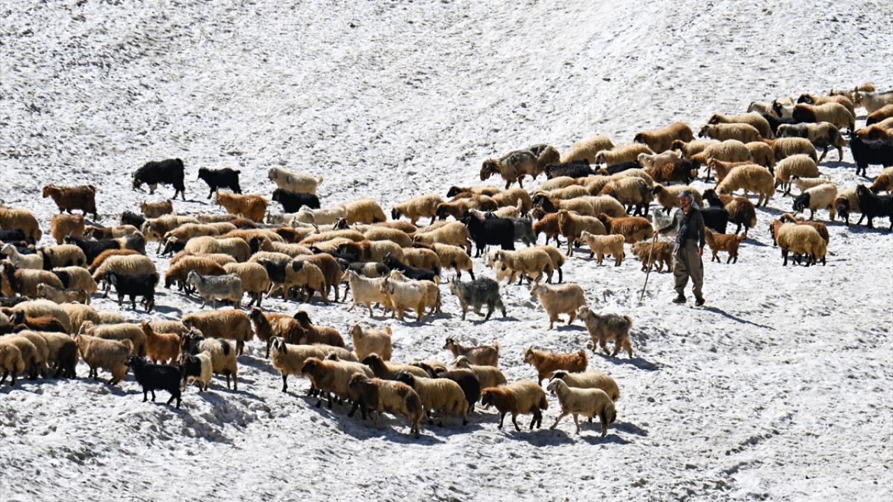 Havanın ısınmasıyla hayvanlarını yaylalarda otlatan çobanlar da sağım için indirdikleri küçükbaş hayvanları kar örtüsünün bulunduğu alanlardan geçirmek zorunda kalıyor.
