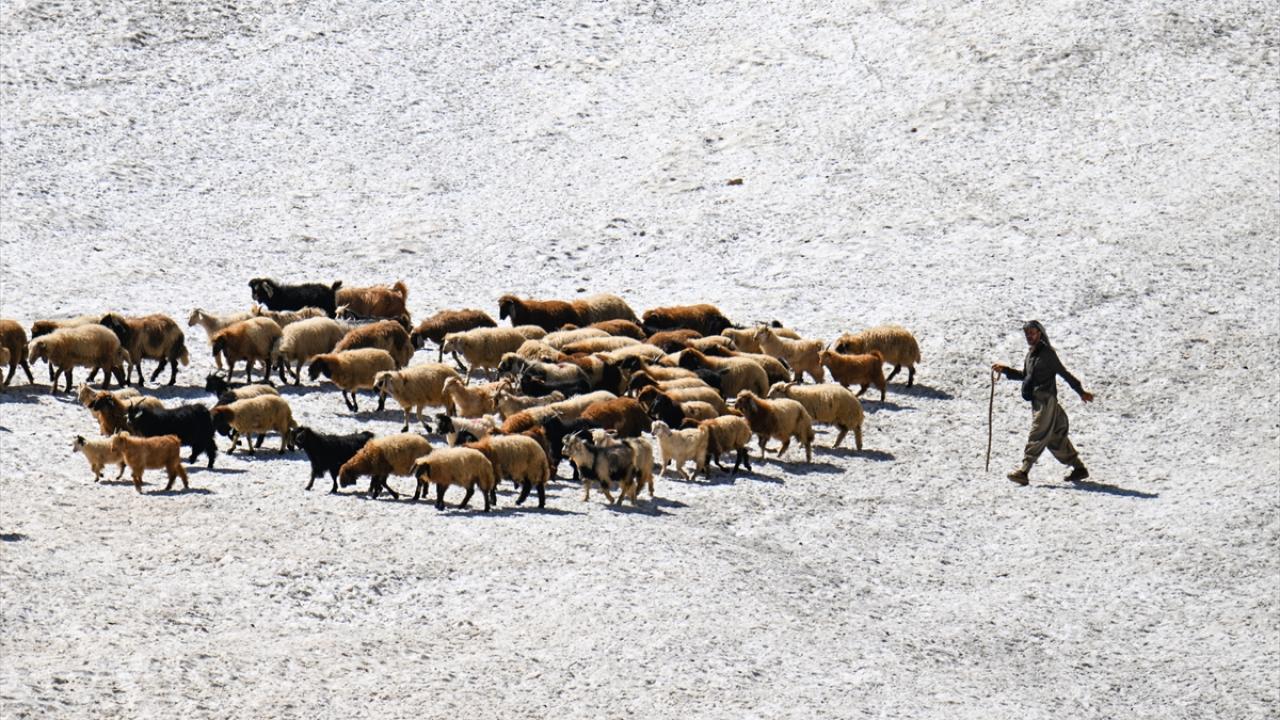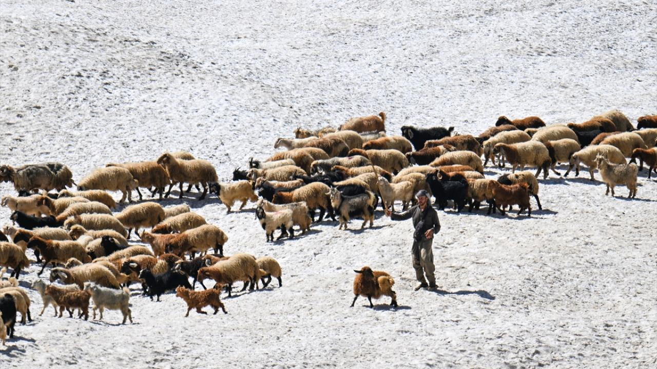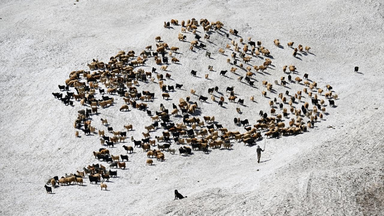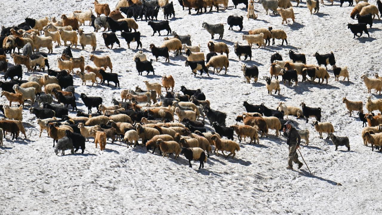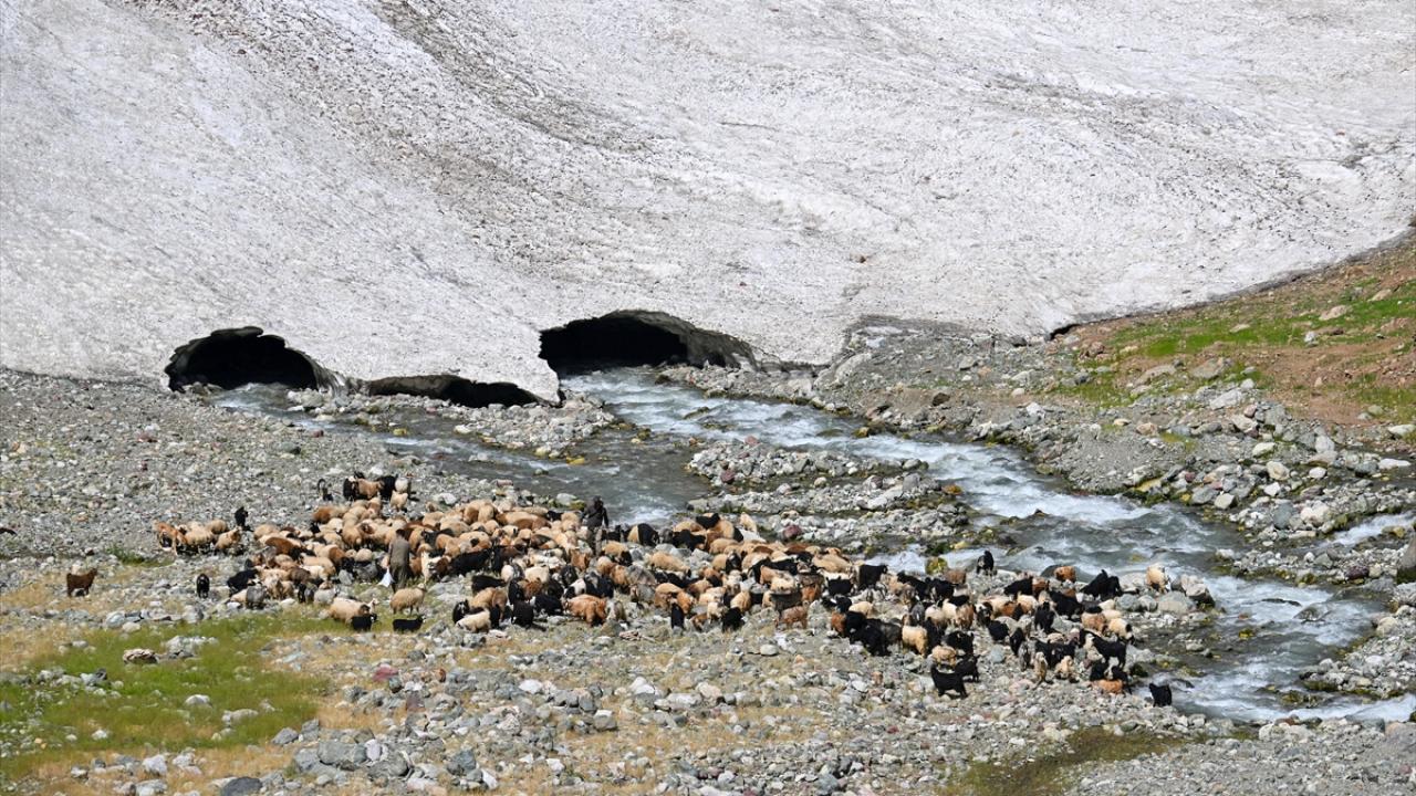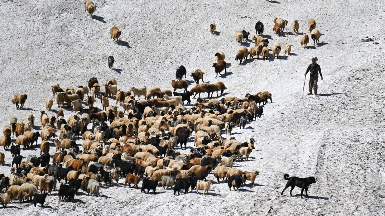 Havanın ısınmasıyla hayvanlarını yaylalarda otlatan çobanlar da sağım için indirdikleri küçükbaş hayvanları kar örtüsünün bulunduğu alanlardan geçirmek zorunda kalıyor.