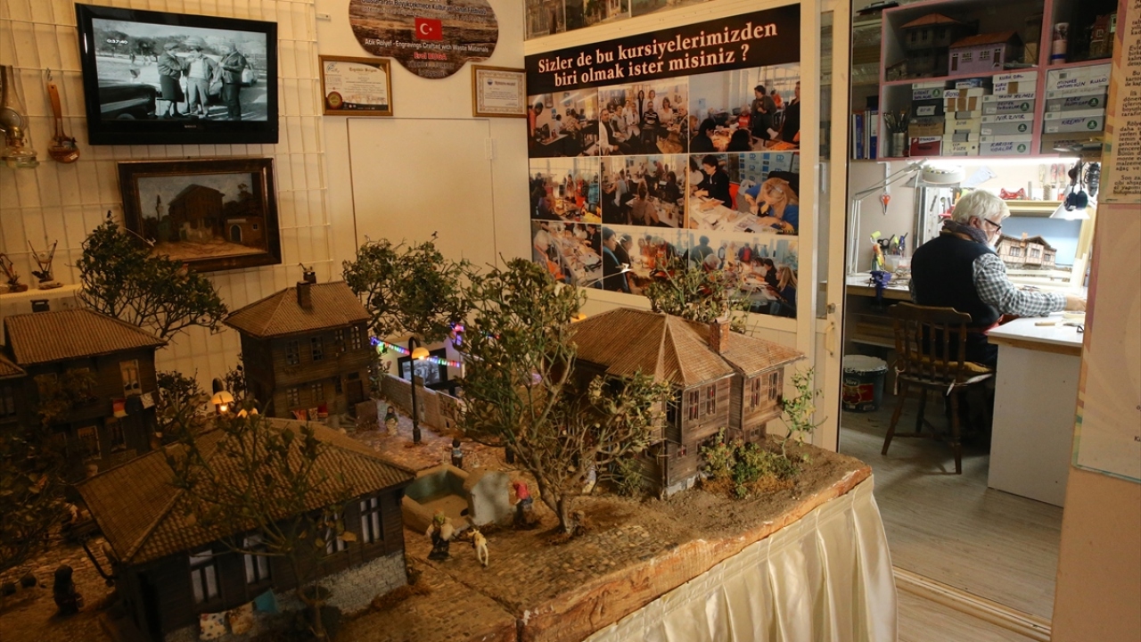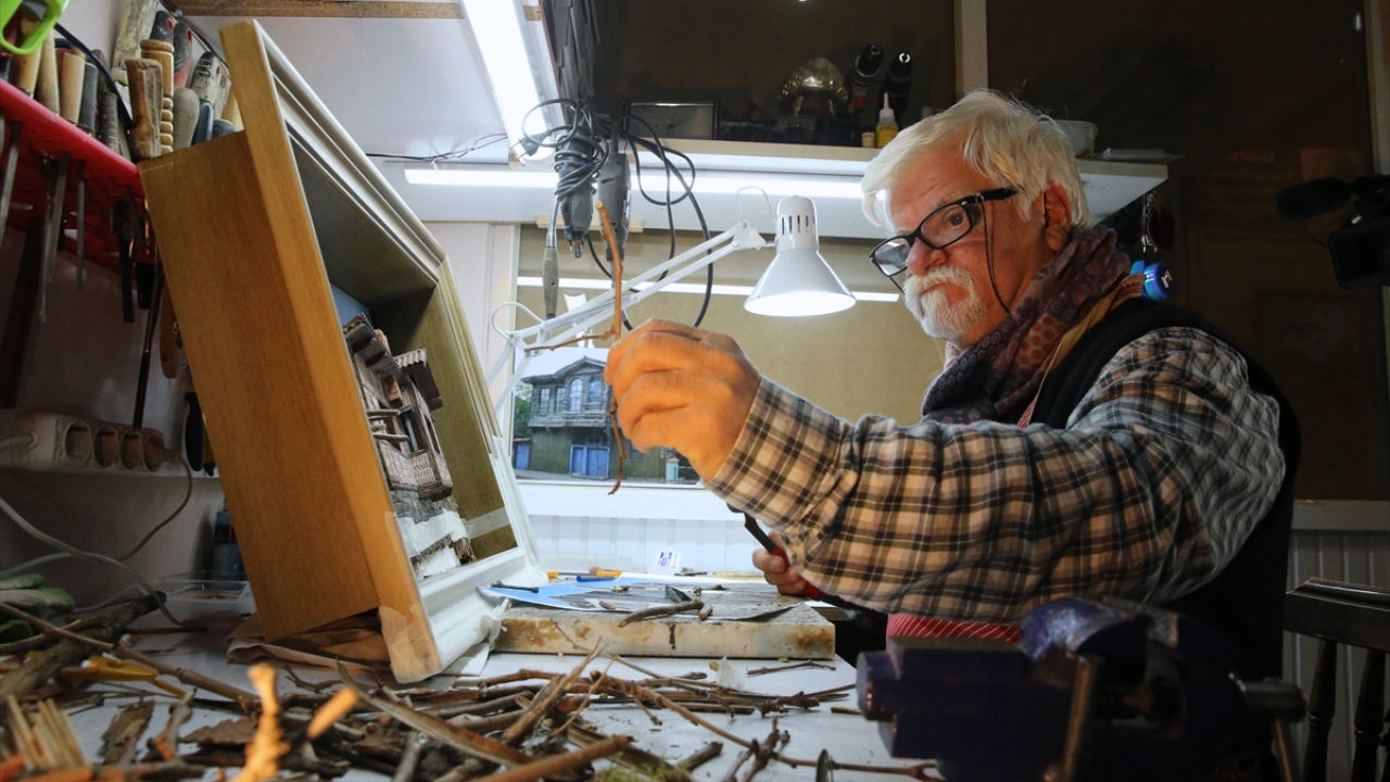 "Doğadaki atıkları değerlendiriyorum. Masrafsız geliyor bana, doğayı da kolluyorum. Bundan dolayı çok memnunum. Beğendiğim bir evin fotoğrafını fotokopiyle büyütüyorum. Sonra resmi inceliyoruz. Evin şekli neyle yapılmış, ona göre doğadan malzeme topluyorum. Taşı sahilden topluyoruz ama dikkat ettiğim şey, renkleri ve ebatları. Bunlar benim için çok önemli. Önce malzemeyi toplamaya başlıyoruz. Bunda soba borusu varsa meşrubat pipeti, paslı tenekeler ön plana çıkıyor. Çatıları oluklu mukavva yapıyorum. Evin önünde sarmaşık varsa yediğimiz üzüm koçanıyla bunu yapıyorum. Bunun gibi şeylerle eserimi ortaya çıkarıyorum."