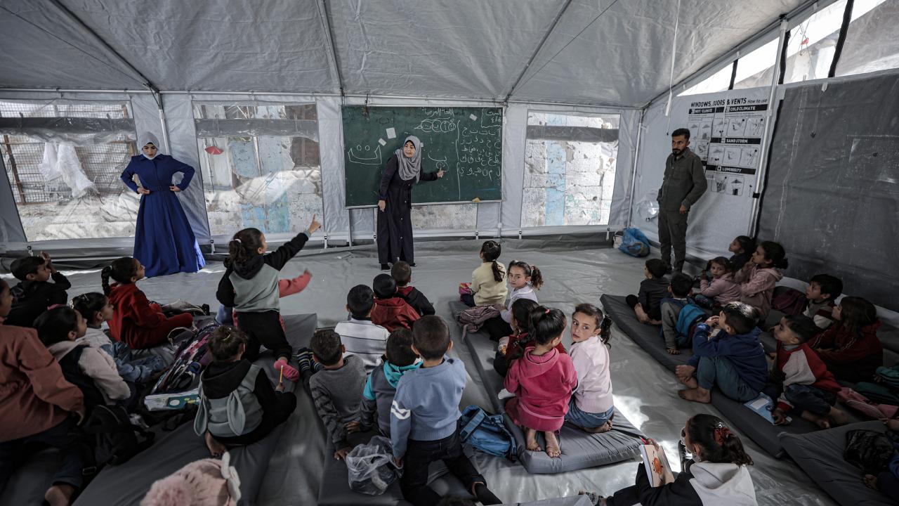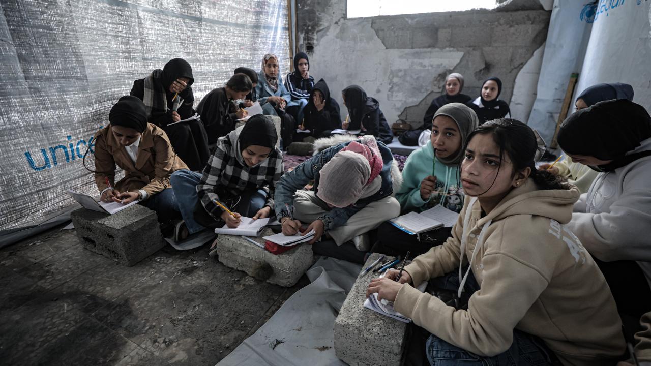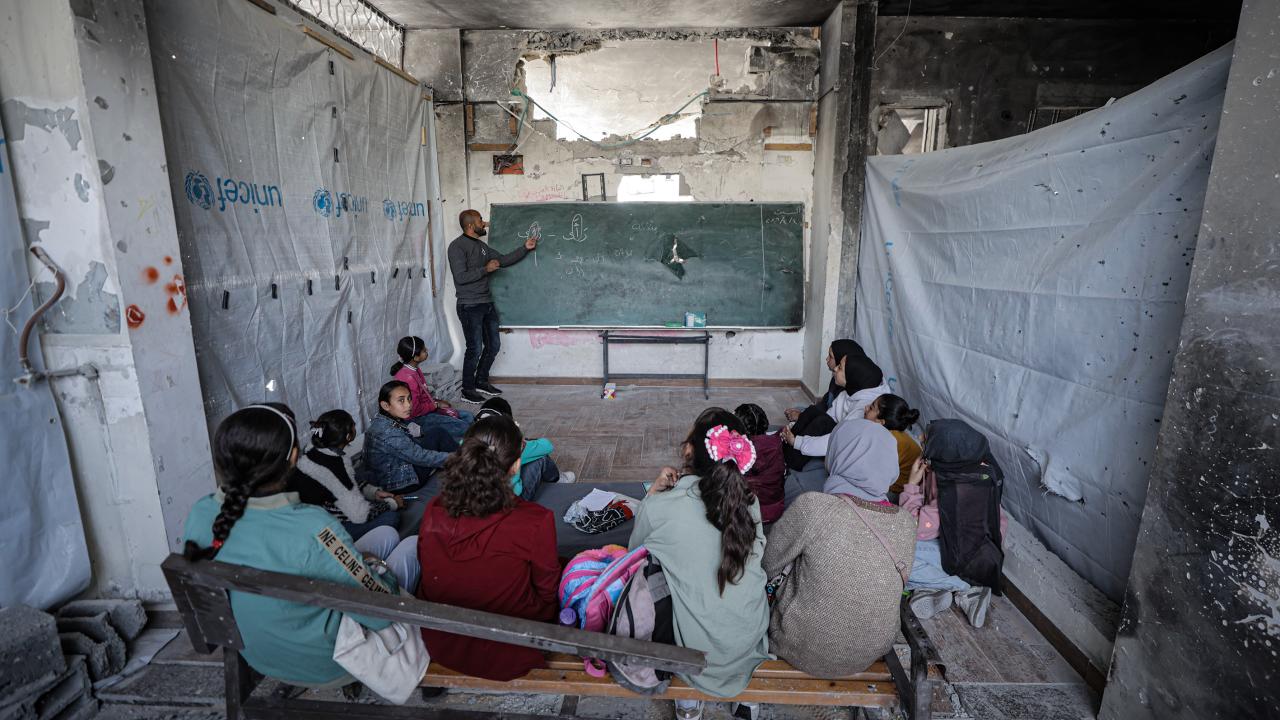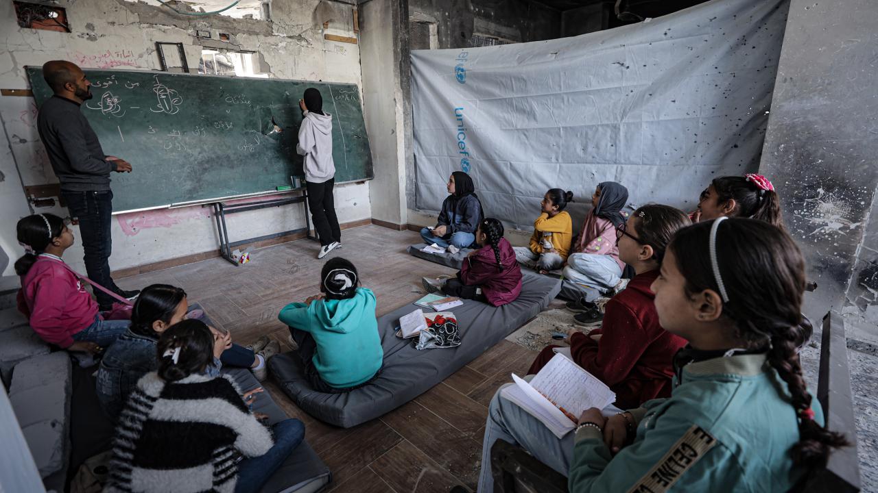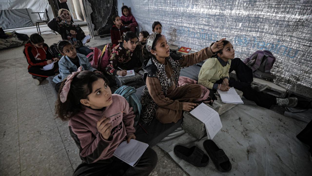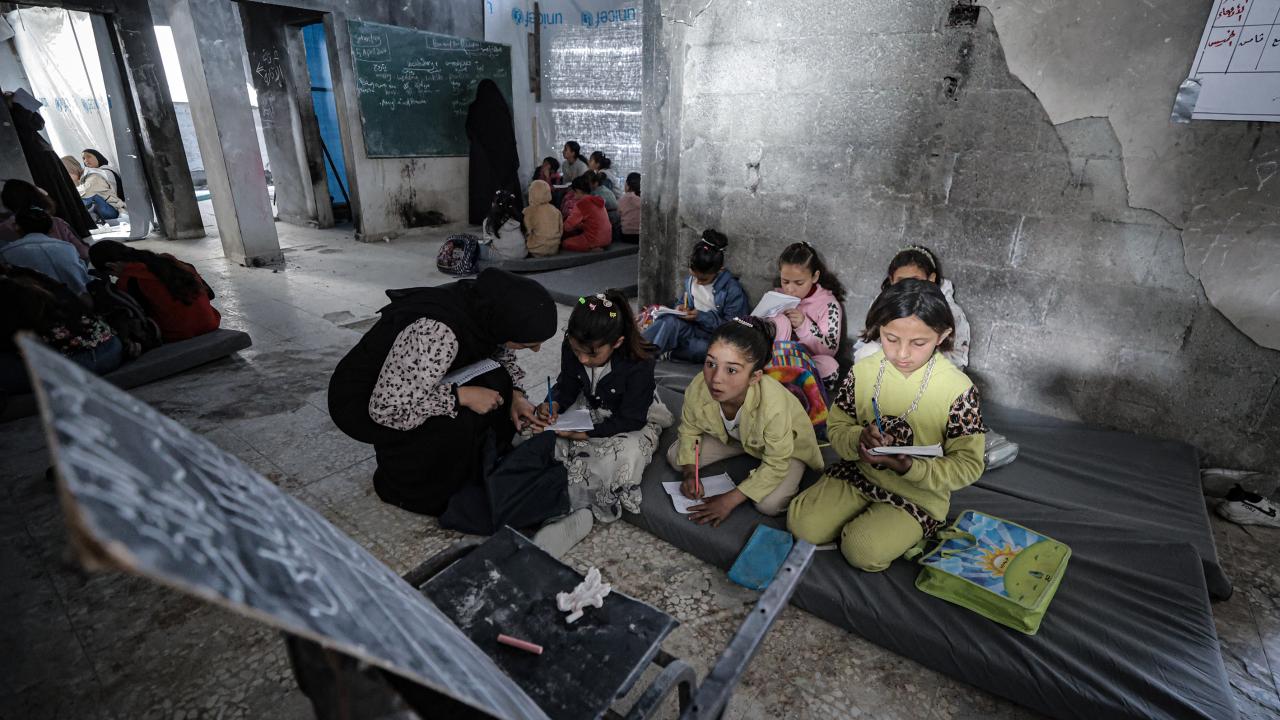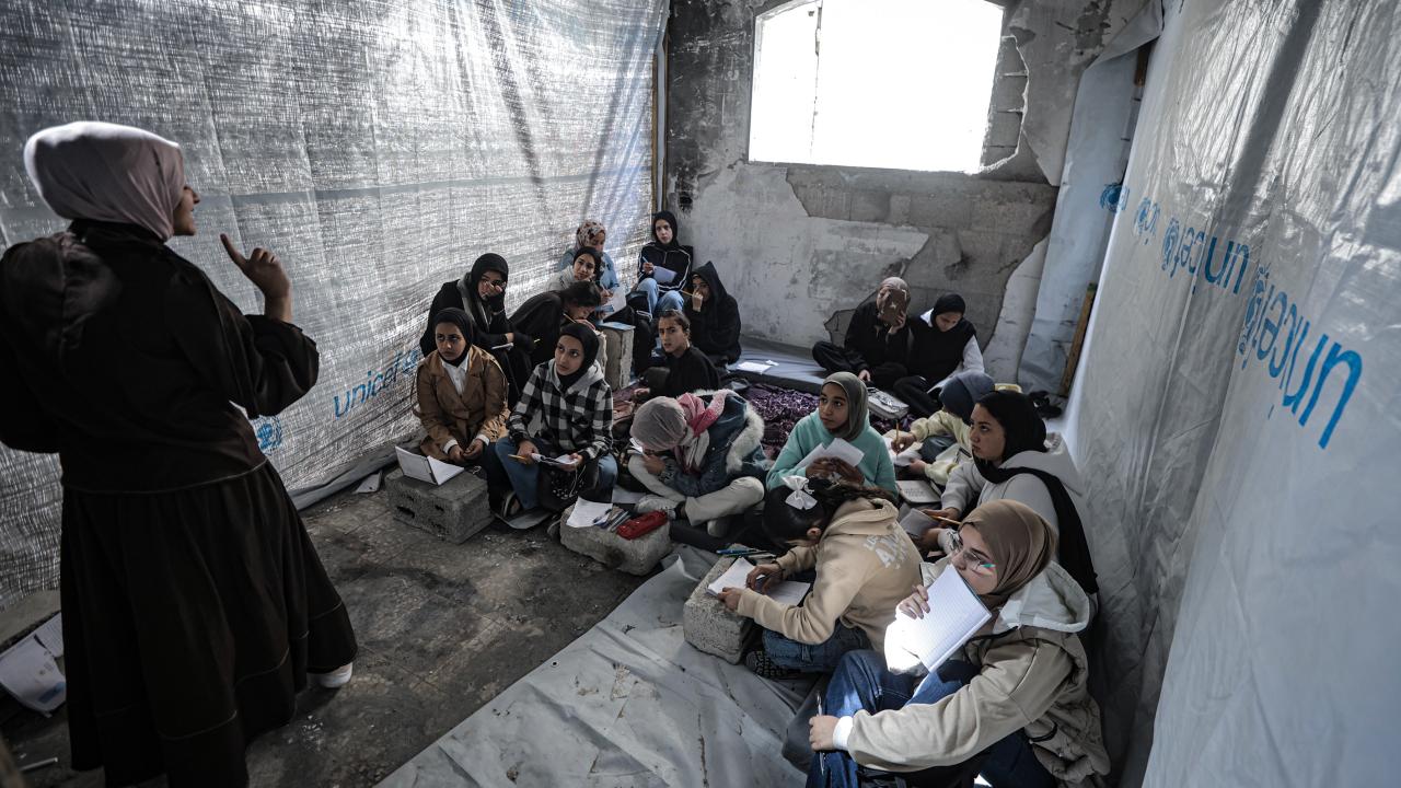 Gazze Şeridi’nin kuzeyinde, Cibaliye Mülteci Kampı’nda gönüllüler tarafından verilen ücretsiz temel eğitim kapsamında, ağır hasar görmüş bir okulun sınıflarının duvarları çadırlarla kapatılan ve sınıf malzemelerinden yoksun öğrenciler, soğuk hava koşullarına rağmen zemine oturarak derslerini sürdürüyor.